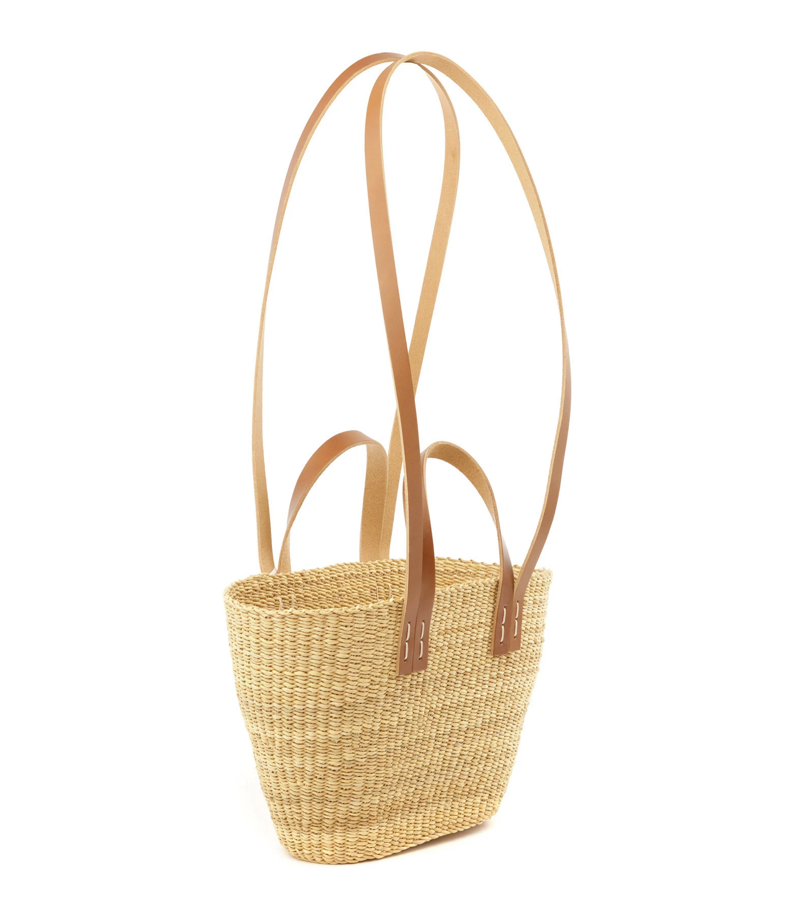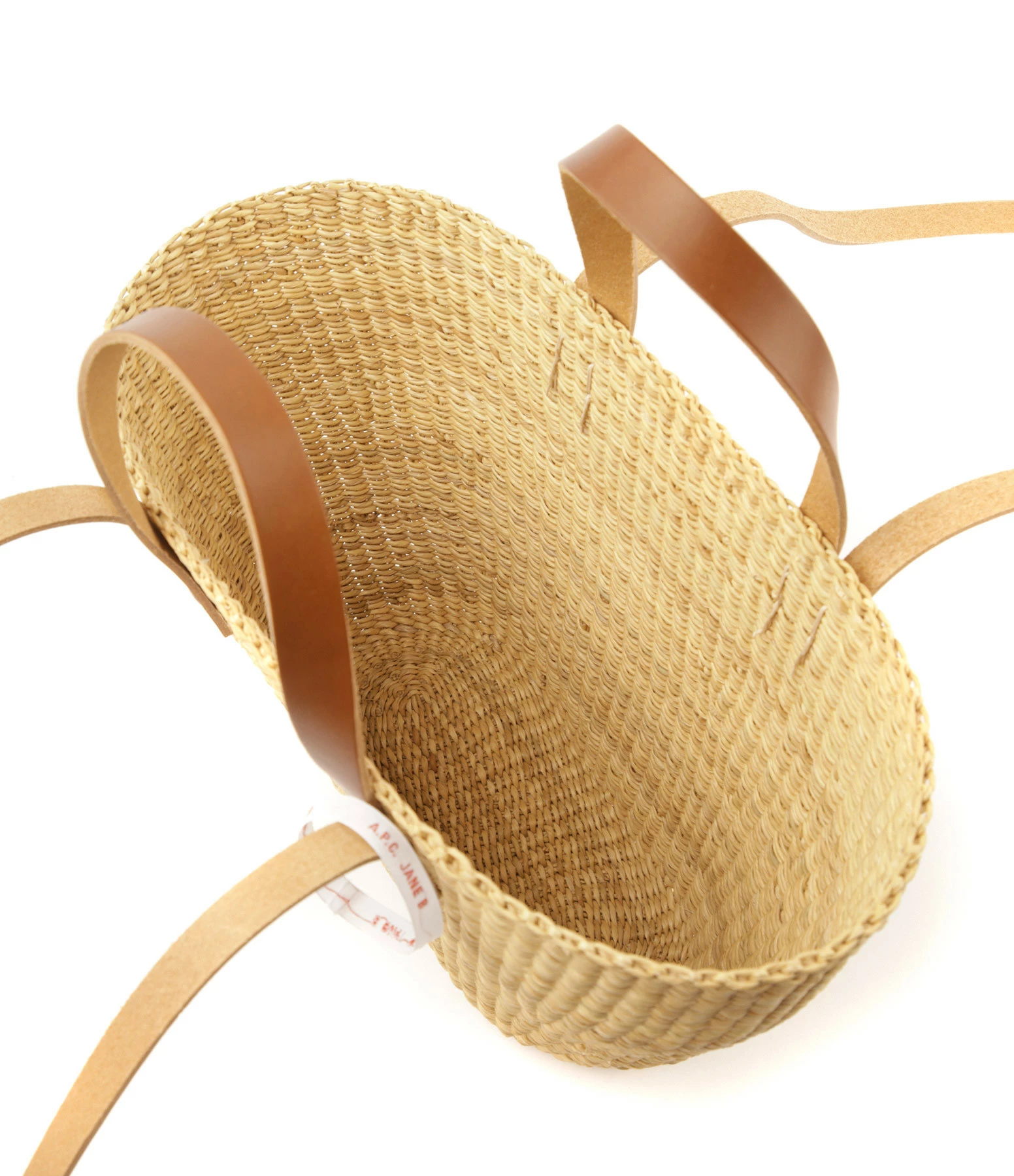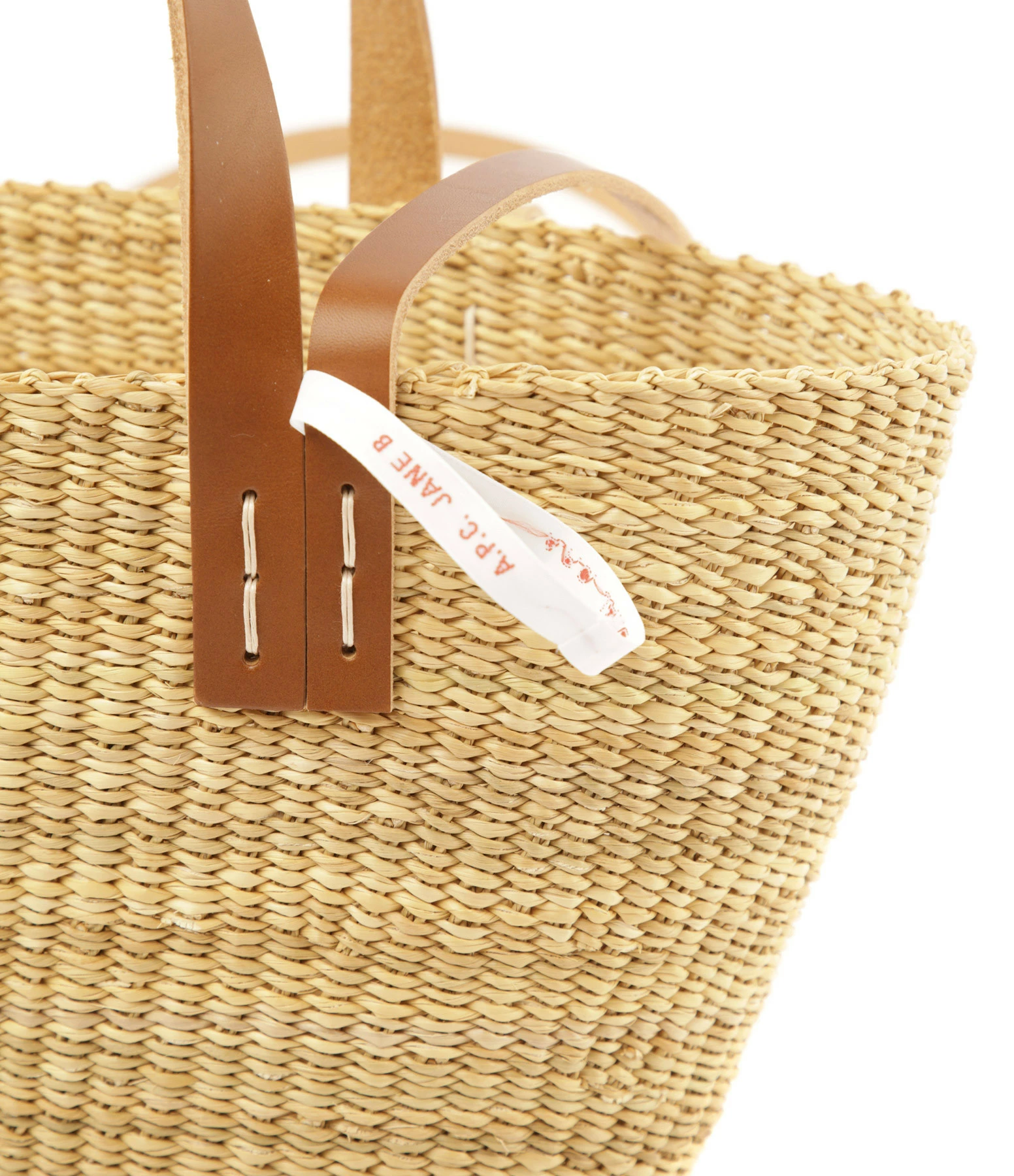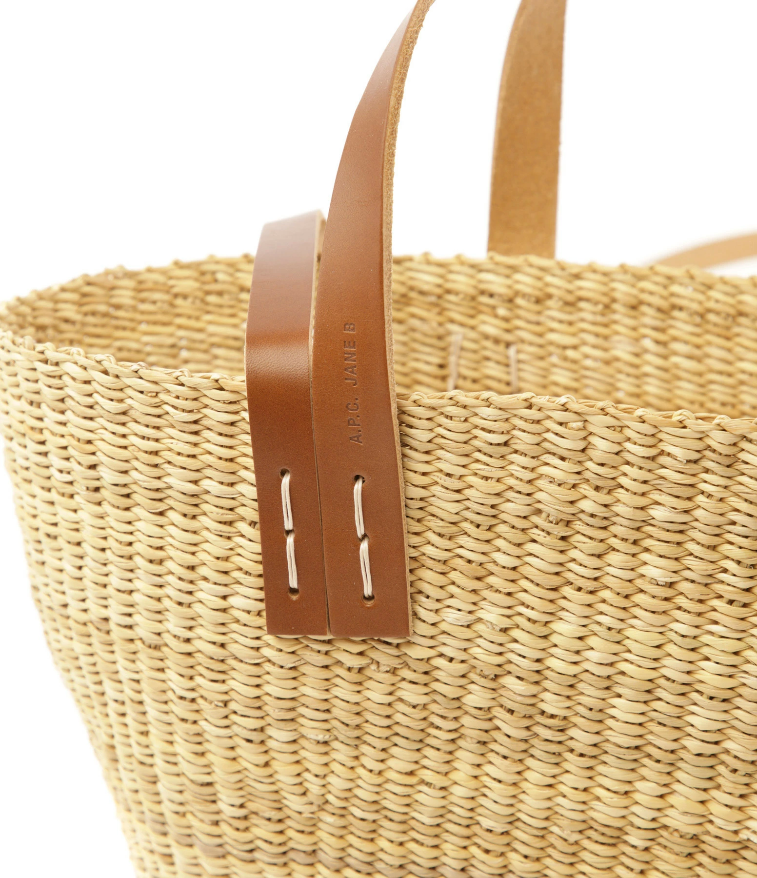 Panier tressé en paille. Doubles anses en cuir lisse marron avec inscription “A.P.C JANE B”.