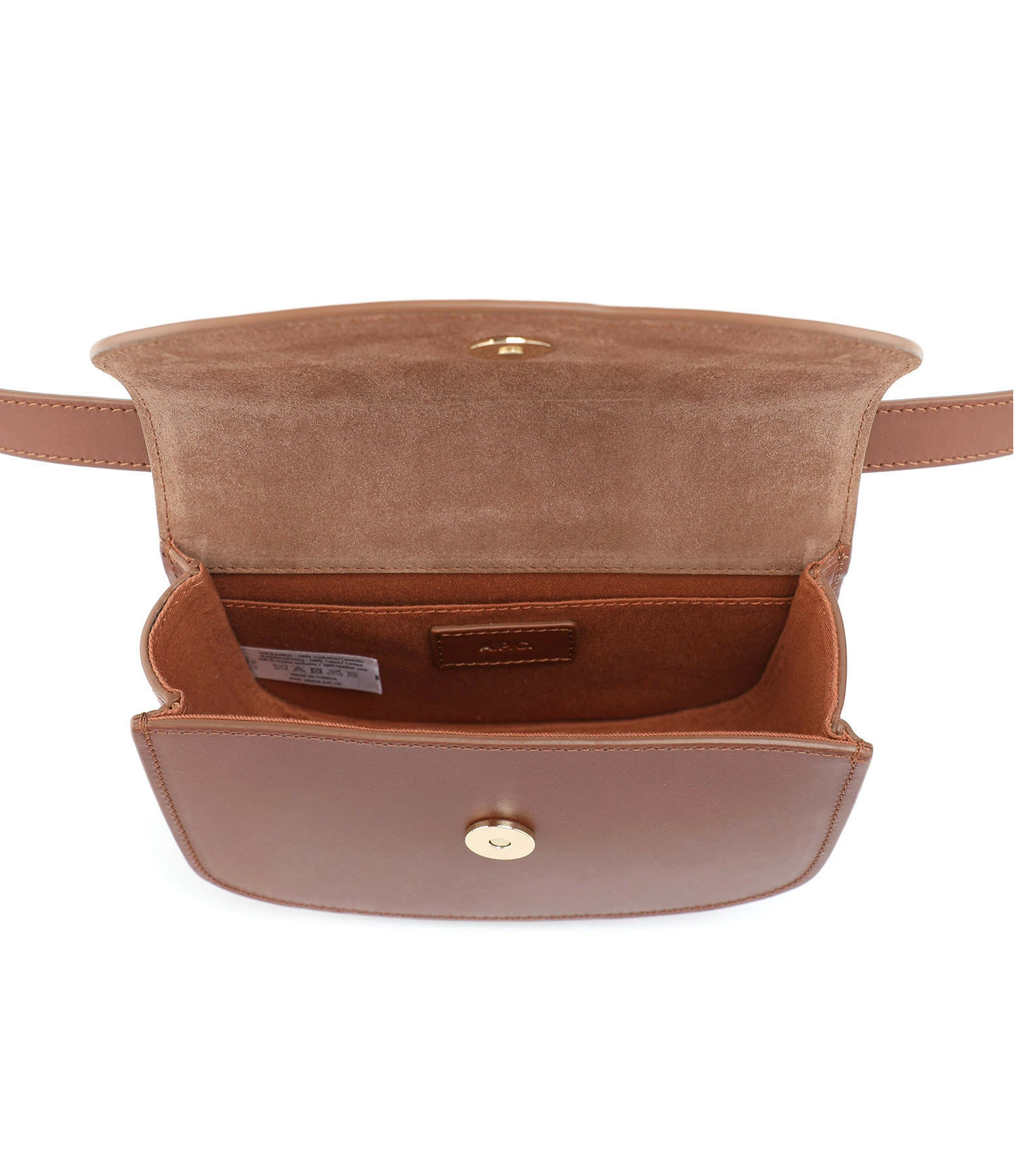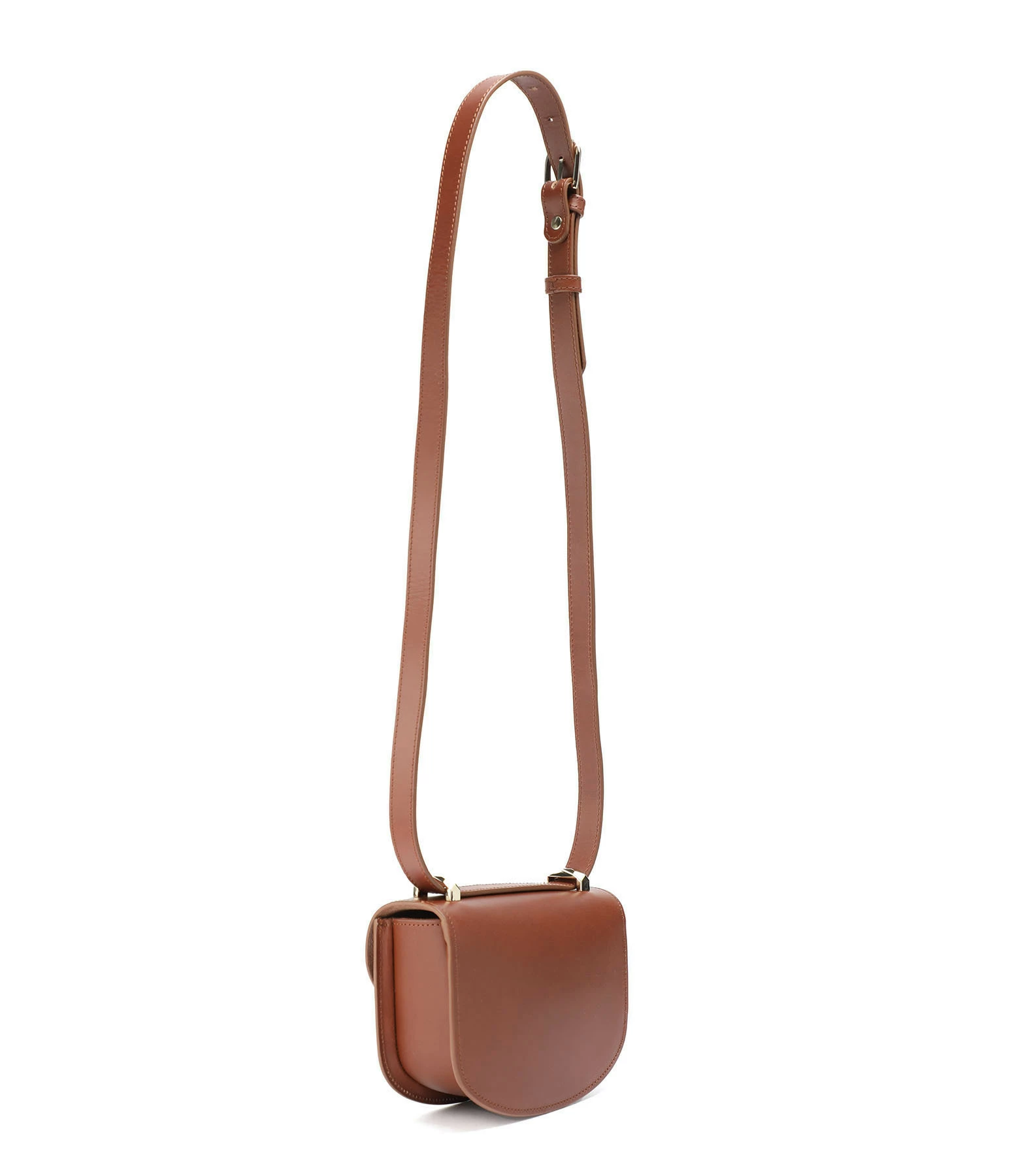 Petit sac bandoulière en cuir lisse marron. Fermeture à rabat par boucle métallique dorée. Bandoulière ajustable. Intérieur doublé en coton avec une poche plaquée.