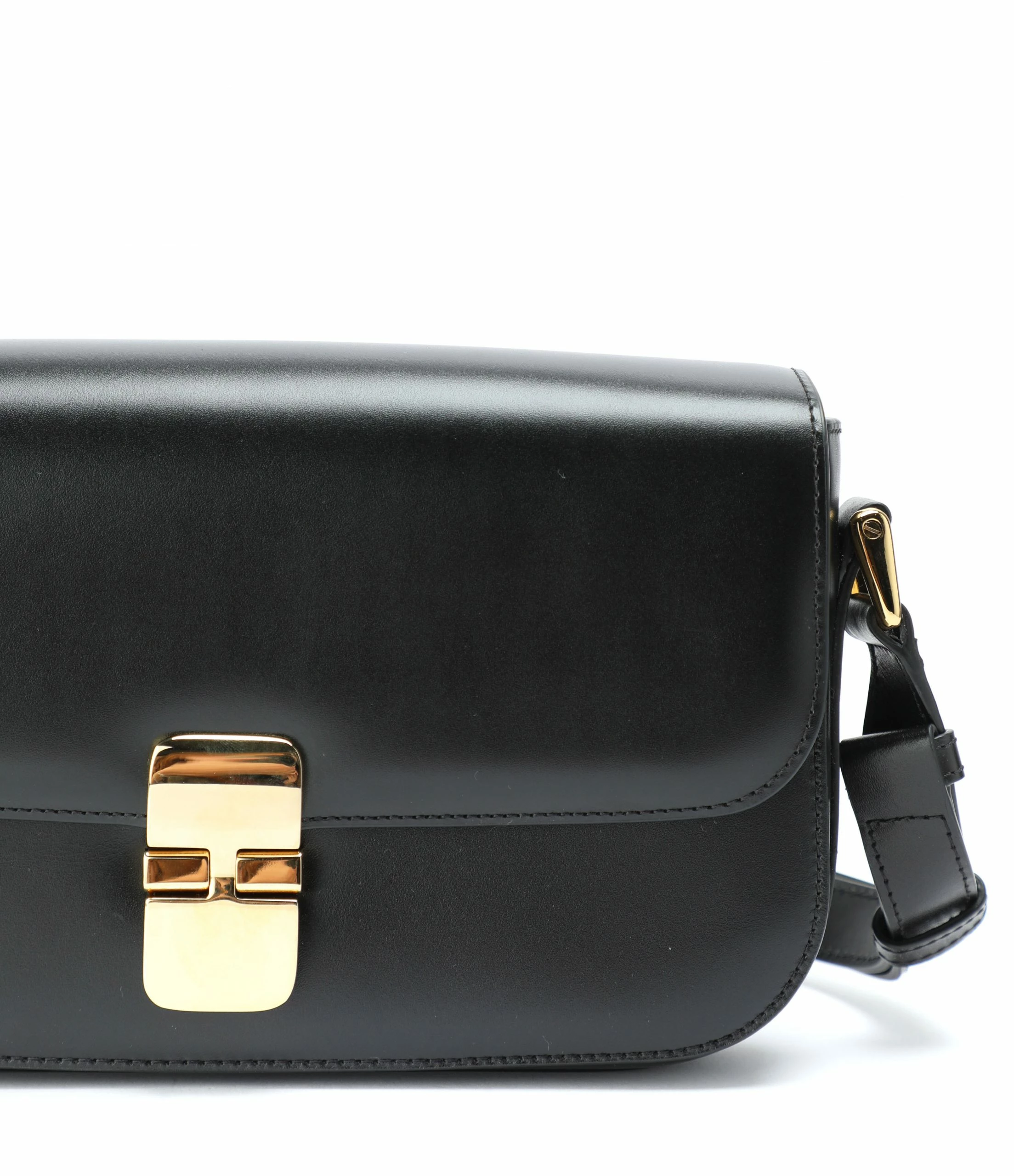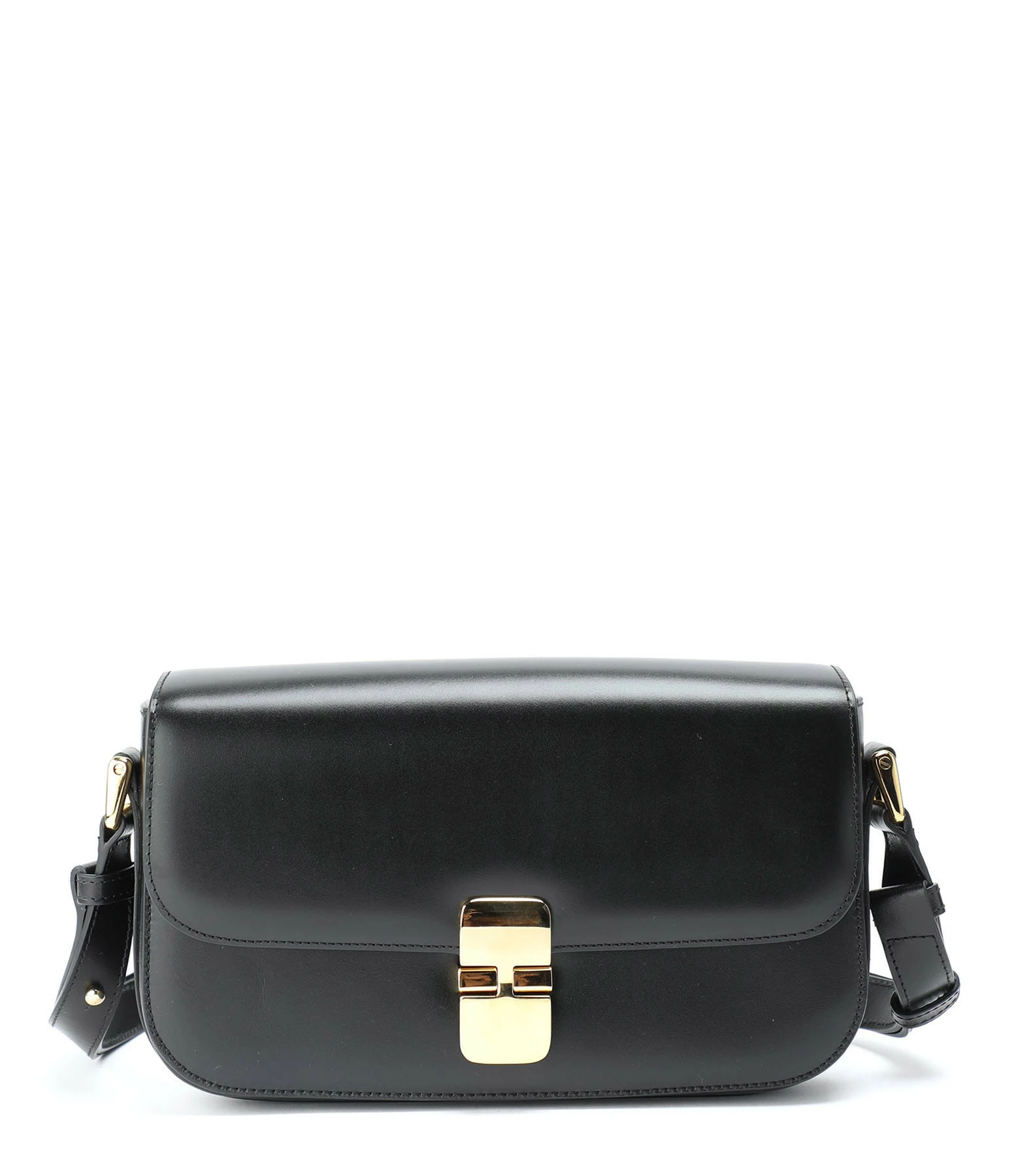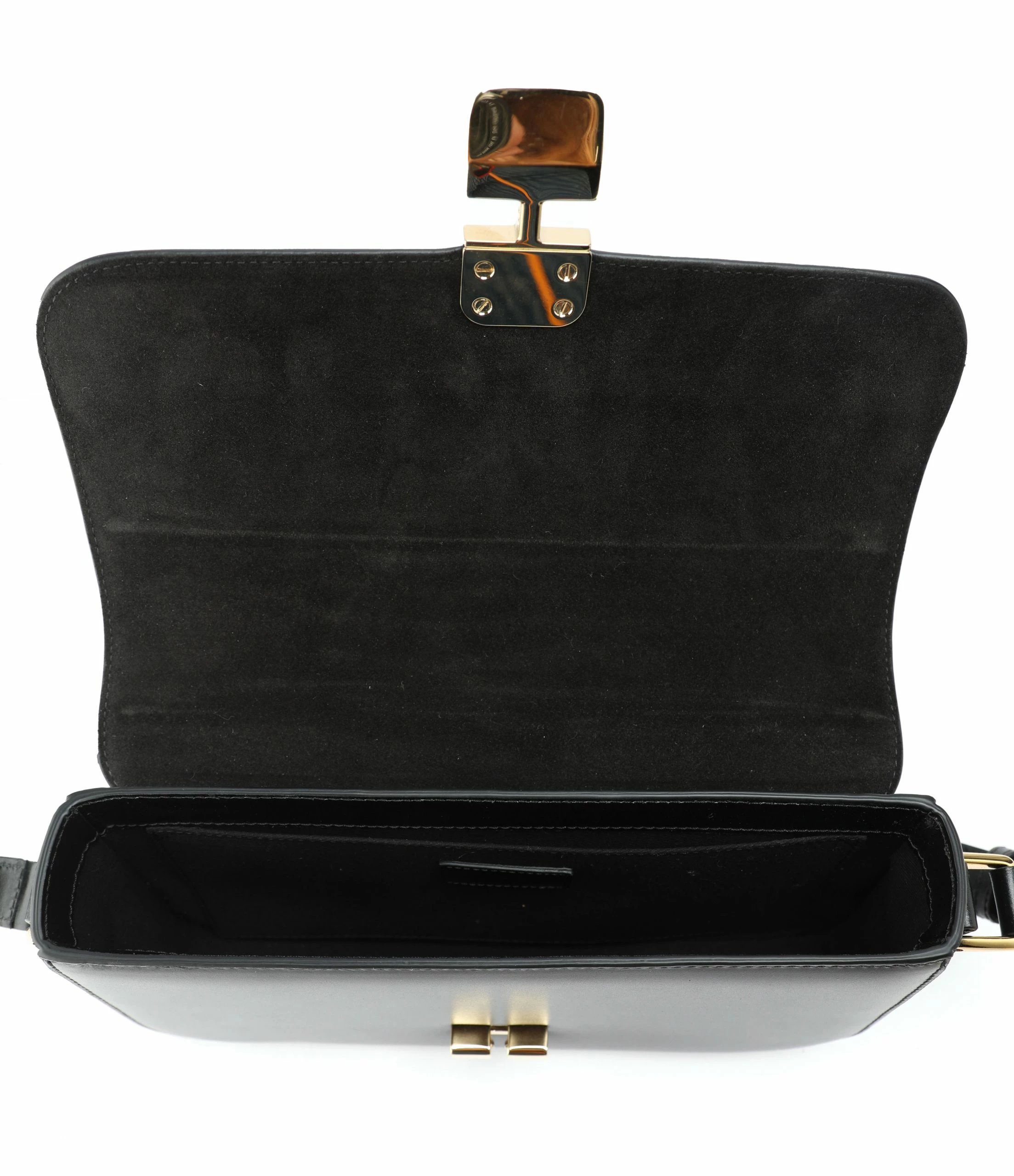 Petit sac bandoulière en cuir lisse noir. Fermeture à rabat par boucle métallique dorée. Bandoulière ajustable. Intérieur doublé en coton avec une poche plaquée.