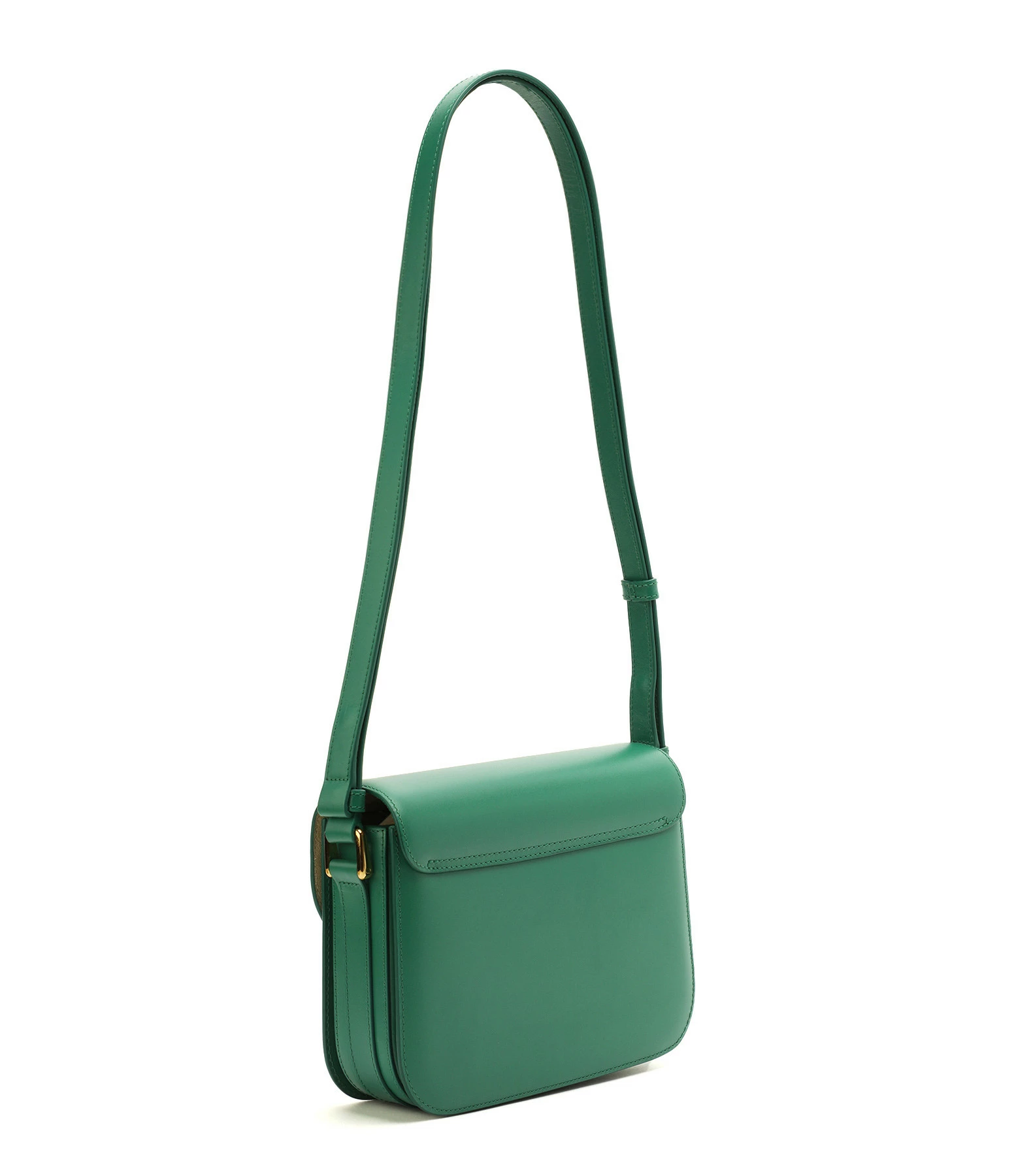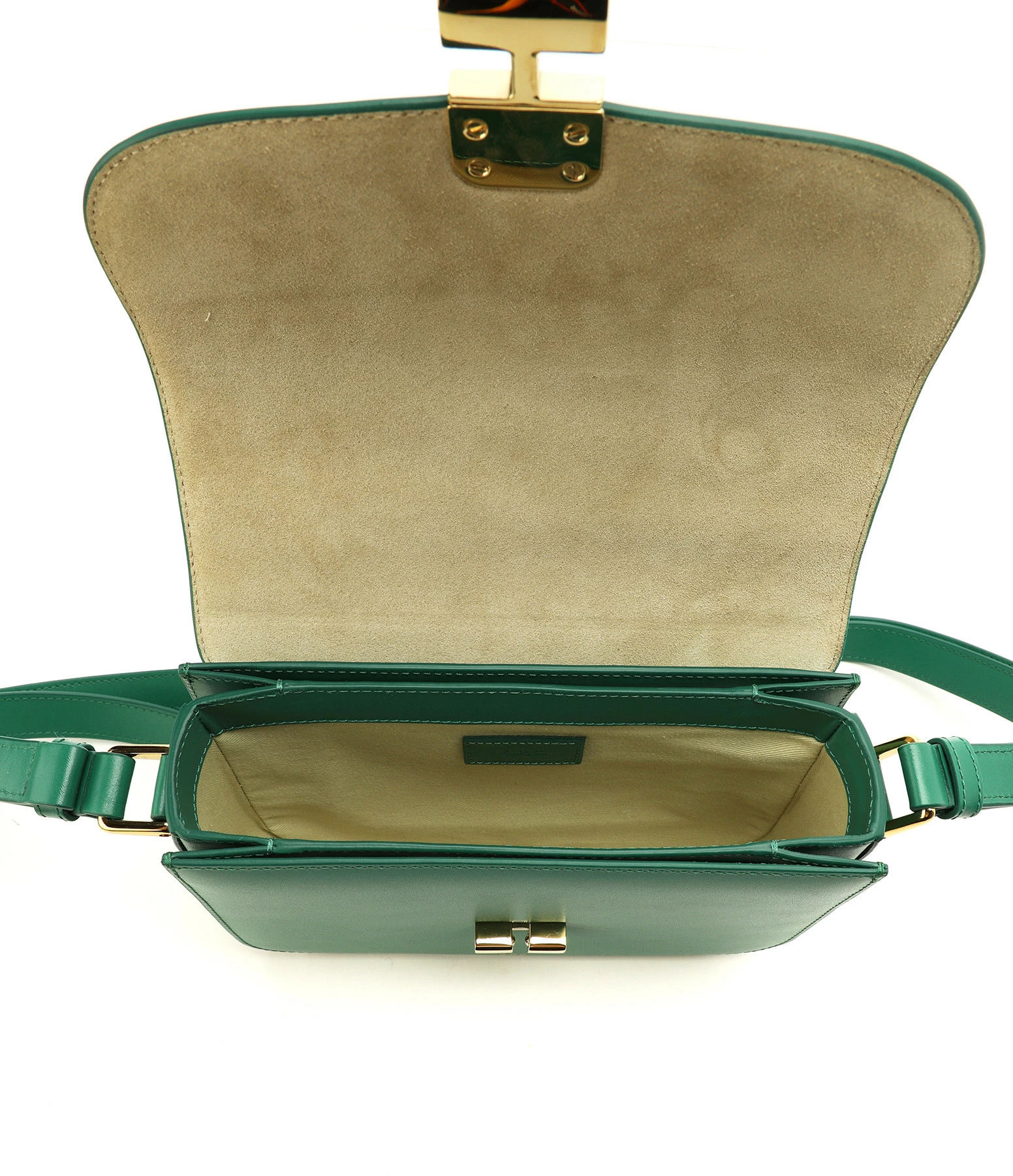 Petit sac bandoulière en cuir lisse vert. Fermeture à rabat par boucle métallique dorée. Bandoulière ajustable. Intérieur doublé en coton avec une poche plaquée.