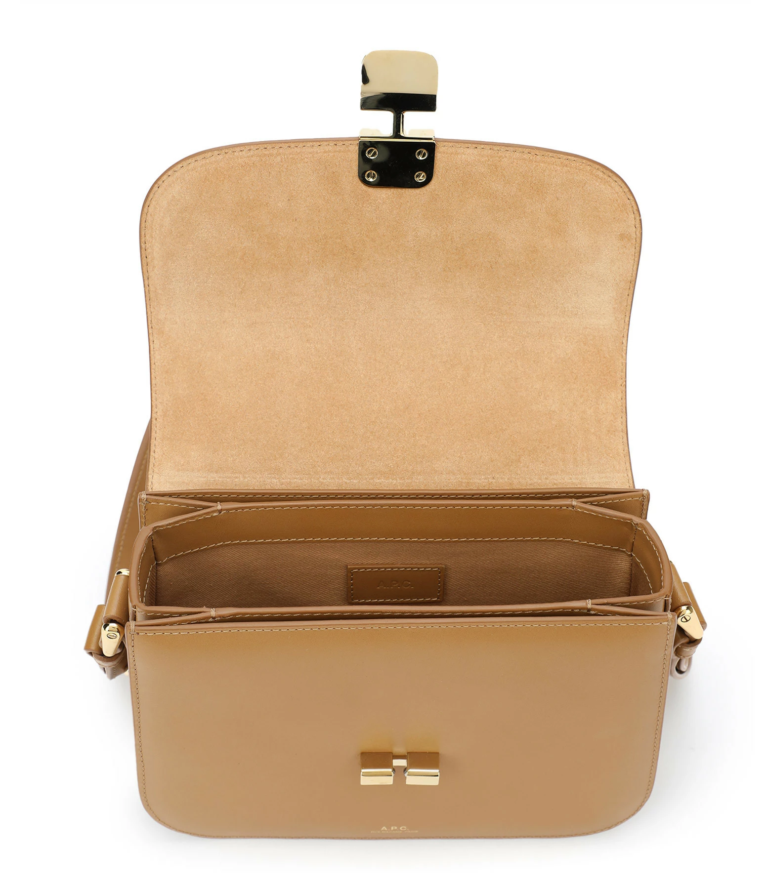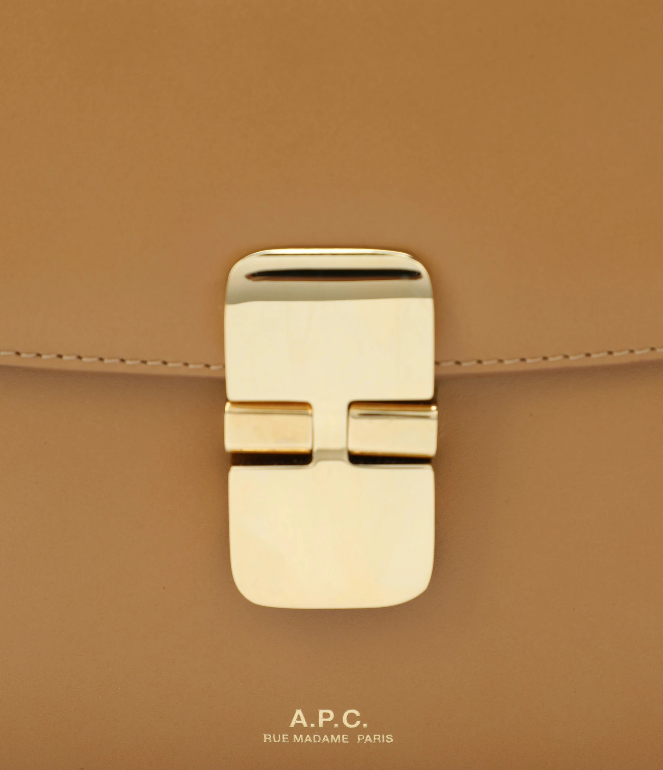 Petit sac bandoulière en cuir lisse marron clair. Fermeture à rabat par boucle métallique dorée. Bandoulière ajustable. Intérieur doublé en coton avec une poche plaquée.
