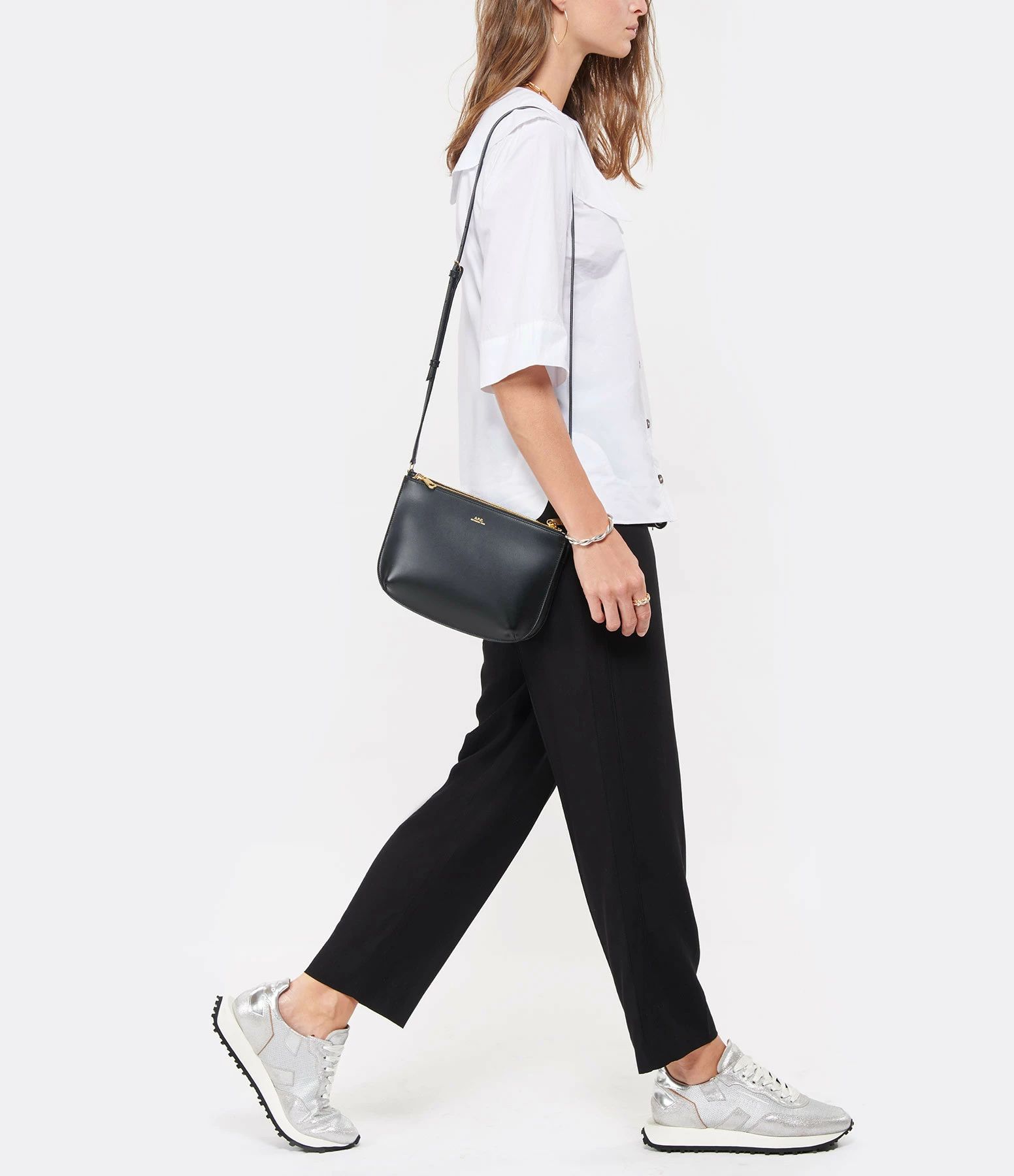 Sac bandoulière en cuir lisse noir. Fermeture par zip. Deux compartiments. Bandoulière ajustable par boucle métallique. Intérieur doublé en coton avec une poche plaquée.