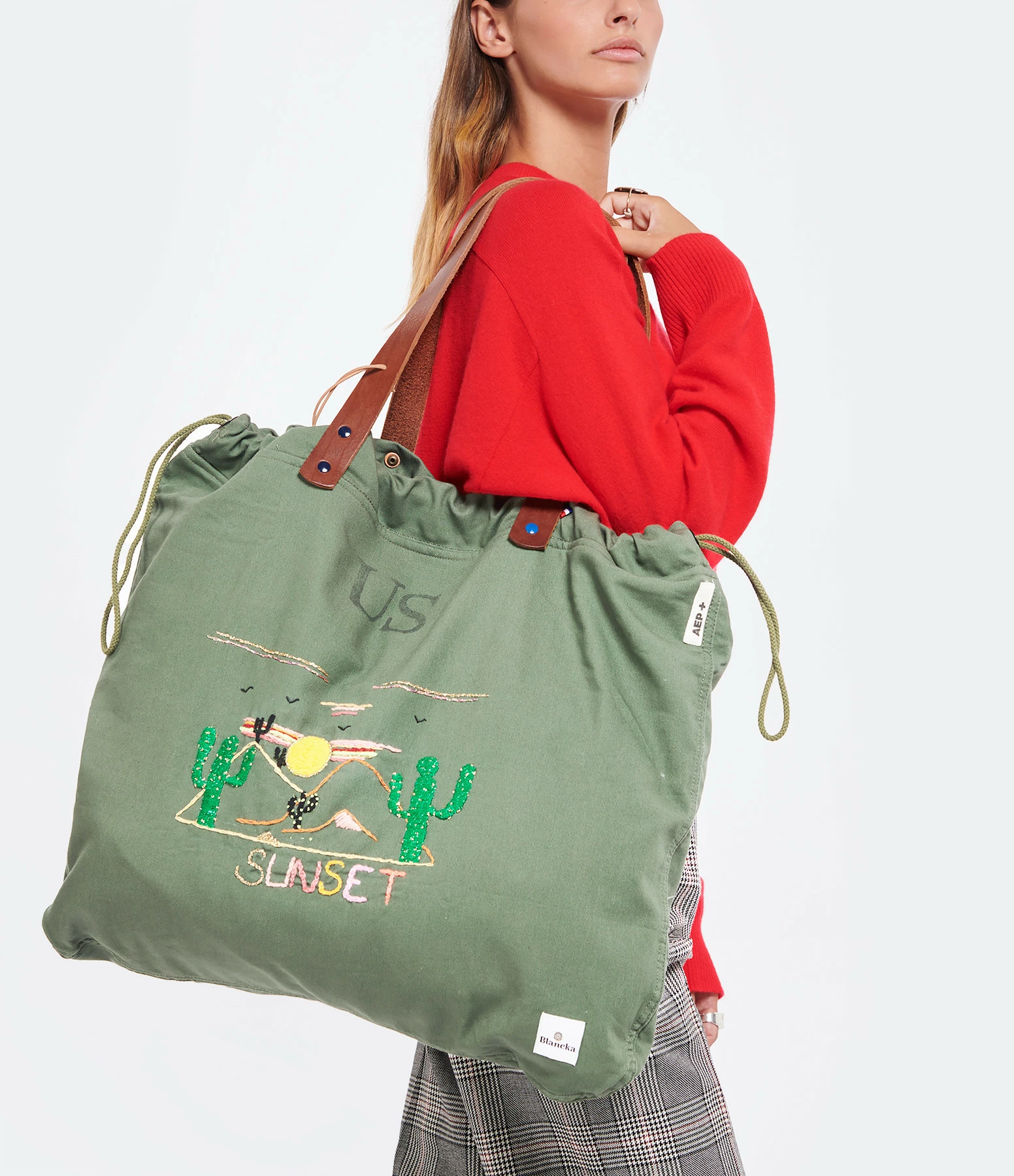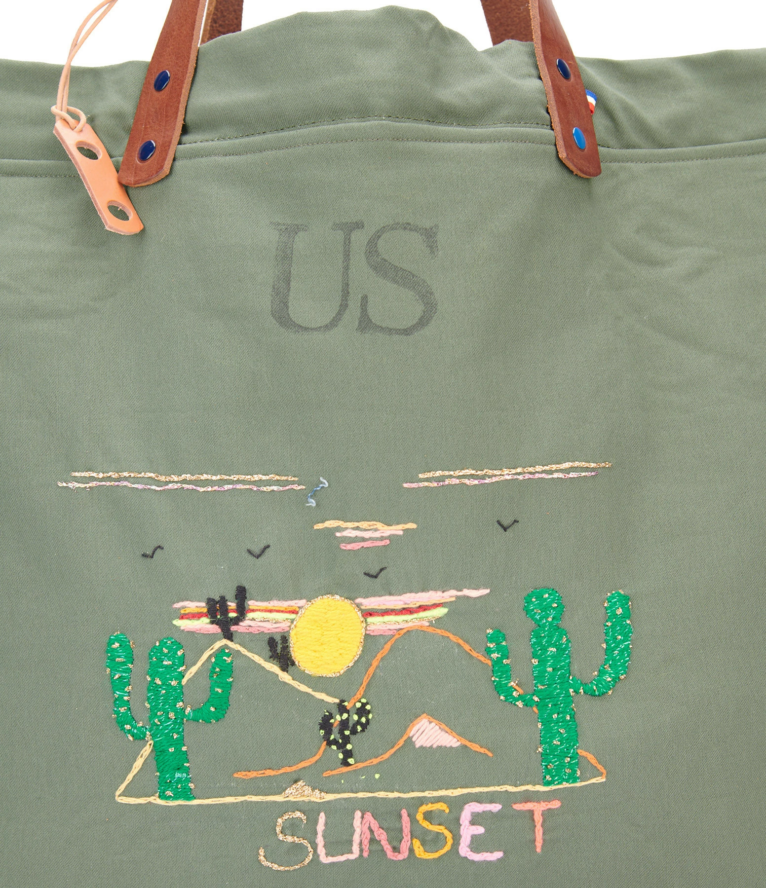 Sac cabas en coton US kaki avec broderies sunset faites main. Deux larges poches extérieures en denim japonais au dos. Intérieur doublé avec une poche. Anses en cuir végétal pleine fleur couleur marron. Cordon de serrage sur les cotés.