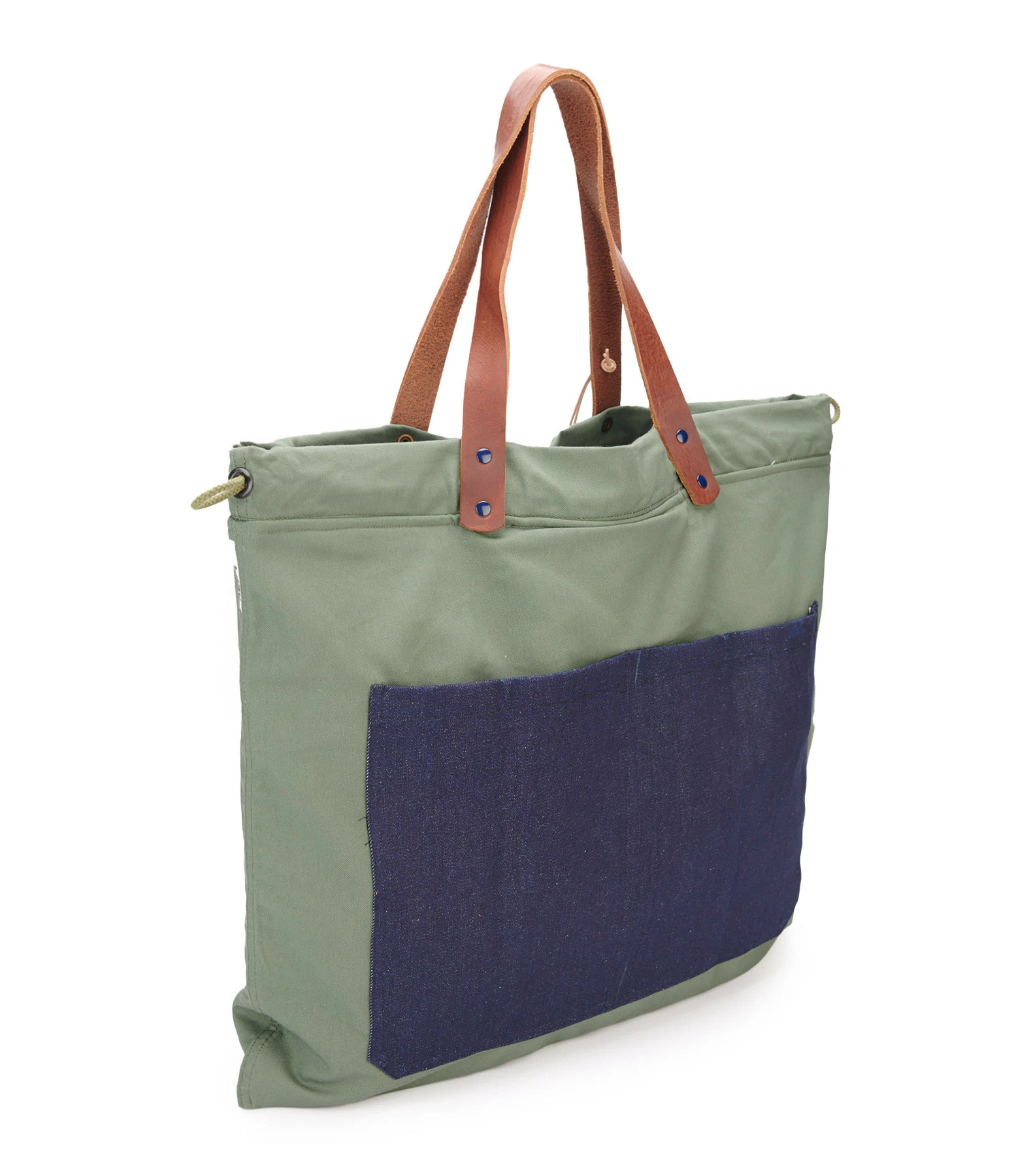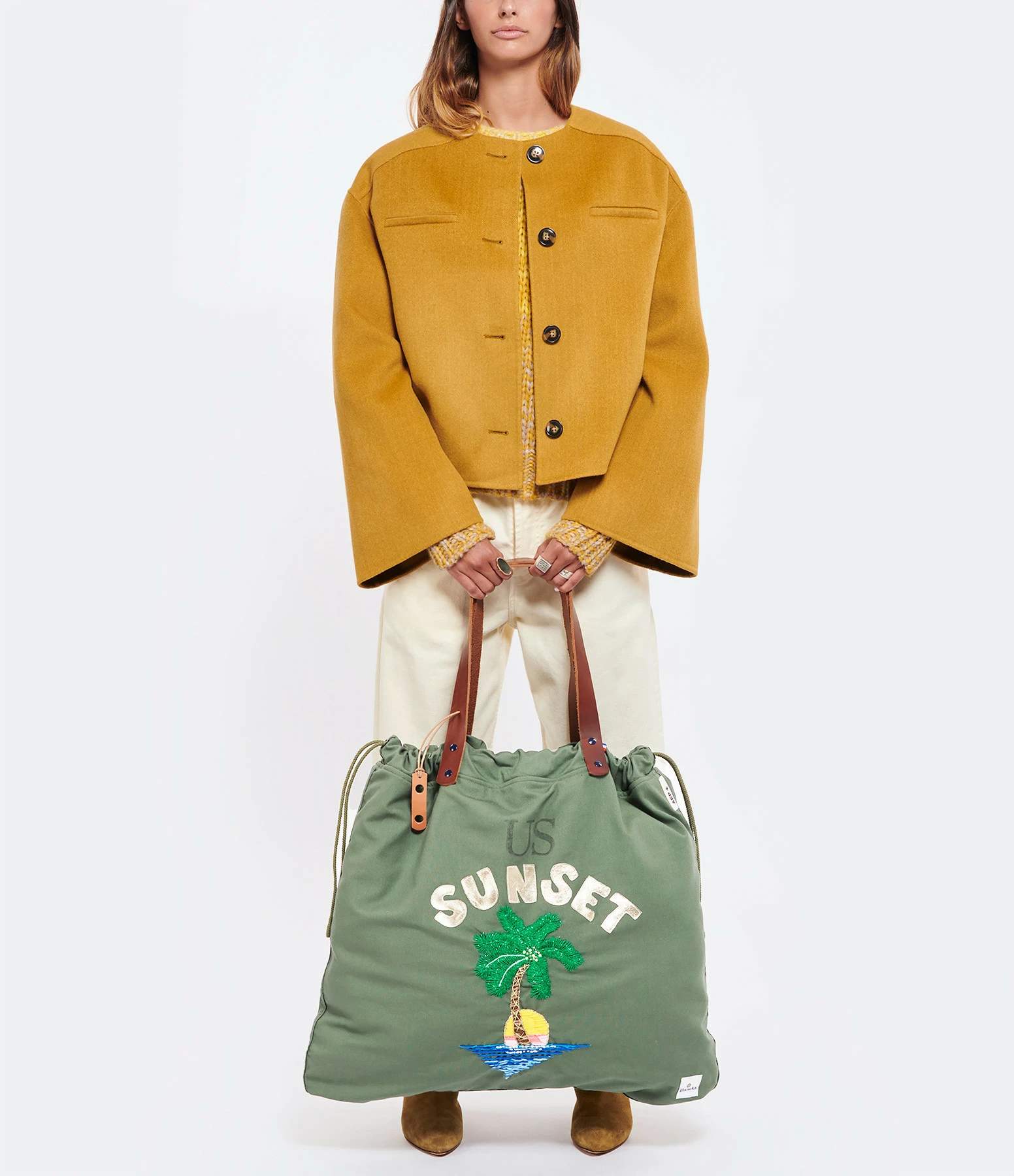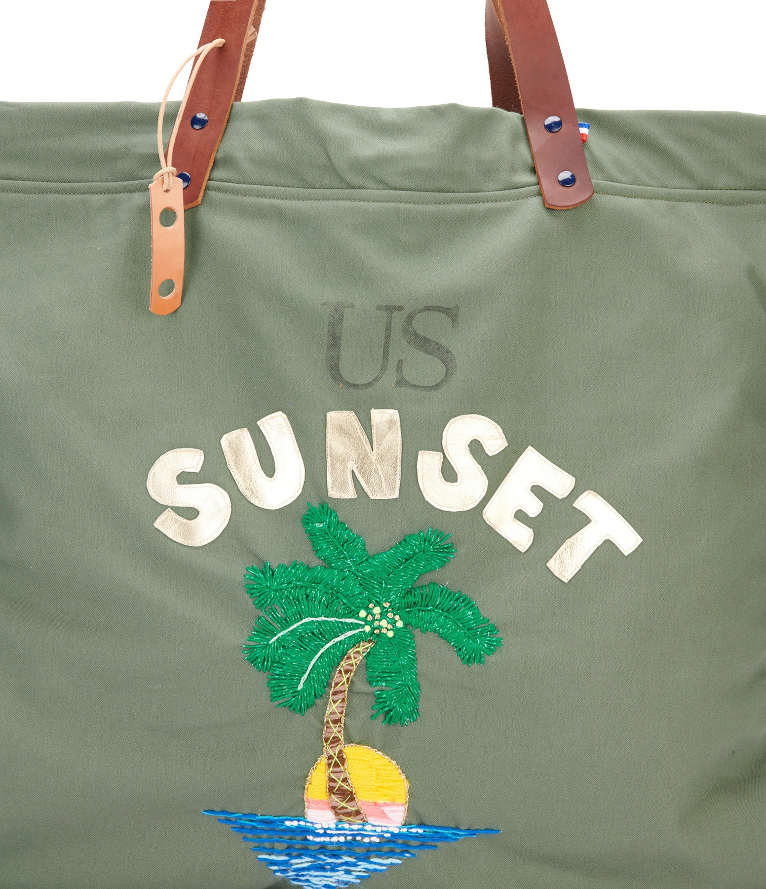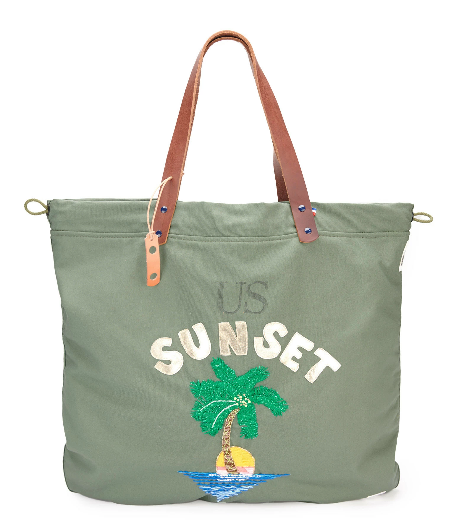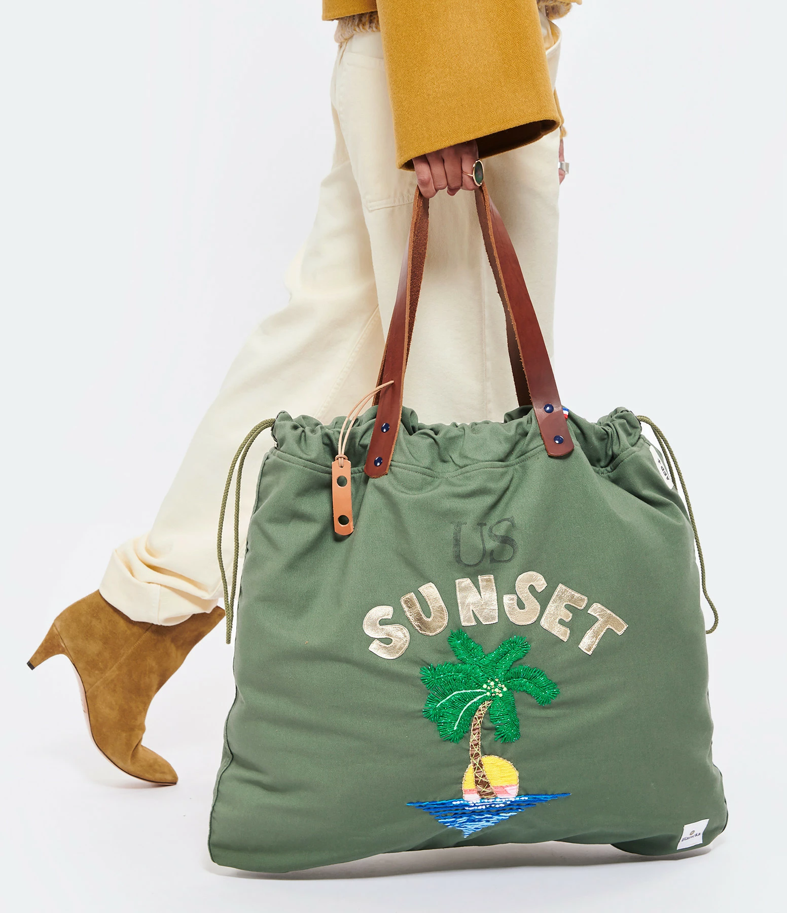 Sac cabas en coton US kaki avec broderies palmier faites main. Deux larges poches extérieures en denim japonais au dos. Intérieur doublé avec une poche. Anses en cuir végétal pleine fleur couleur marron. Cordon de serrage sur les cotés.