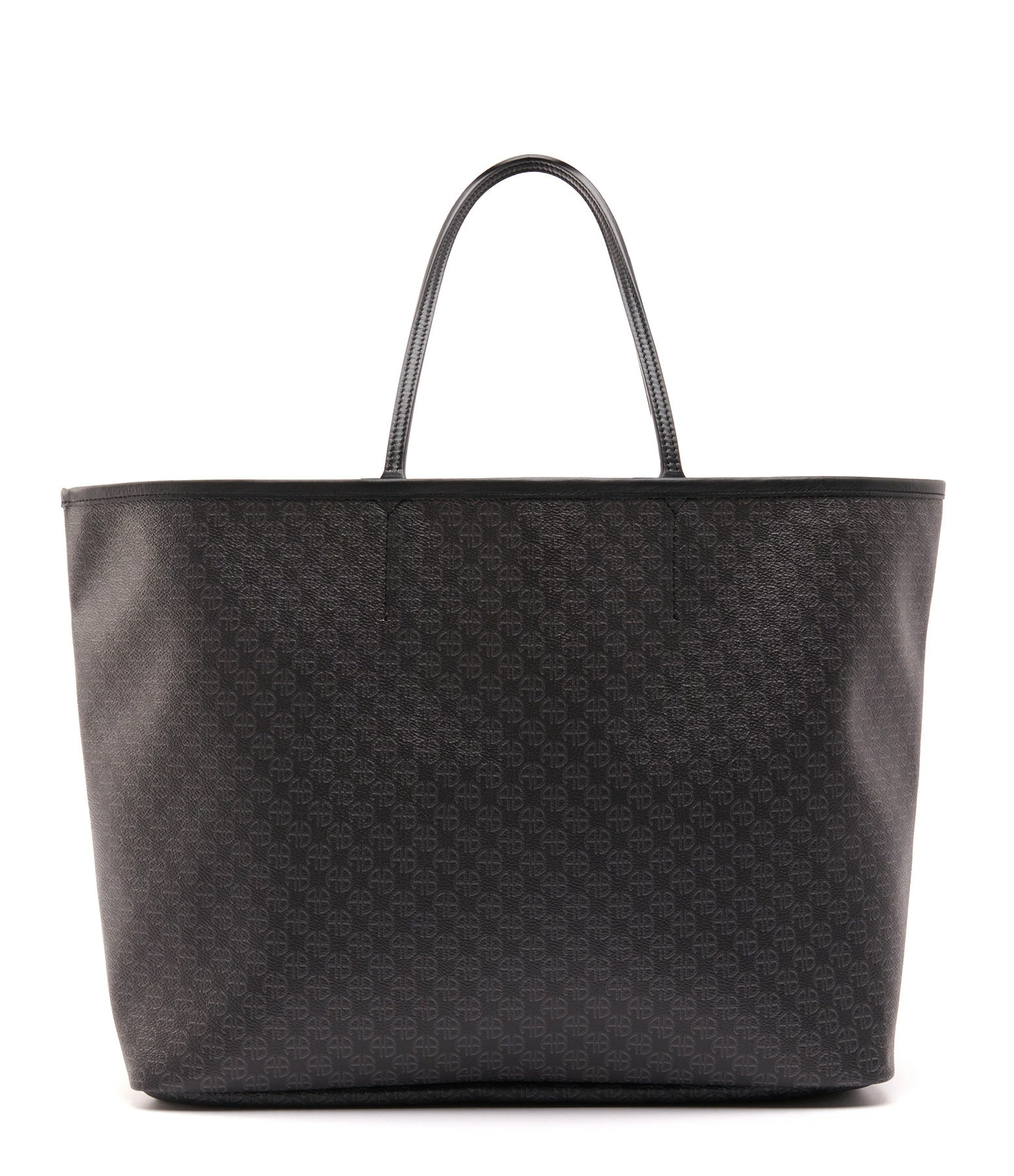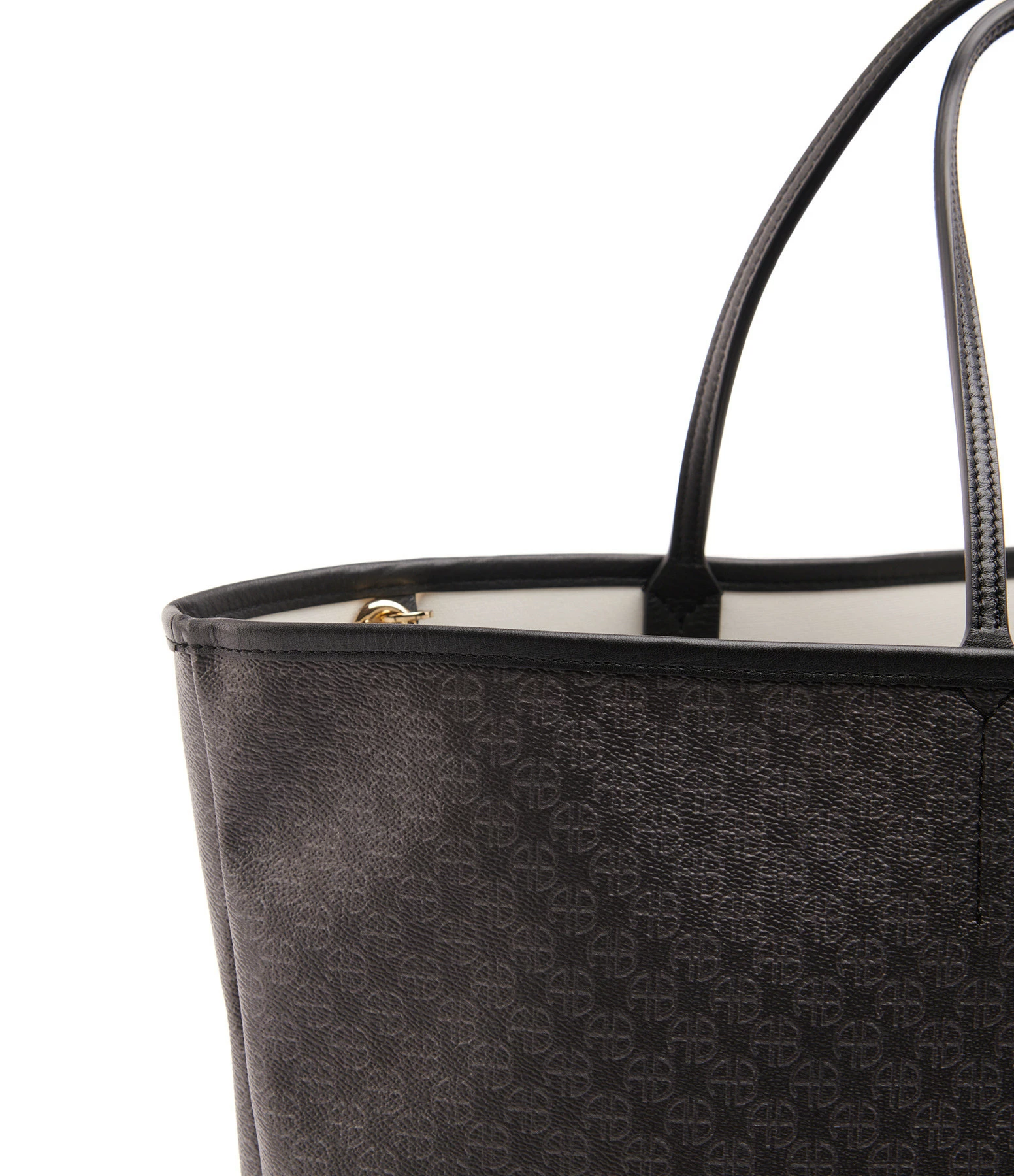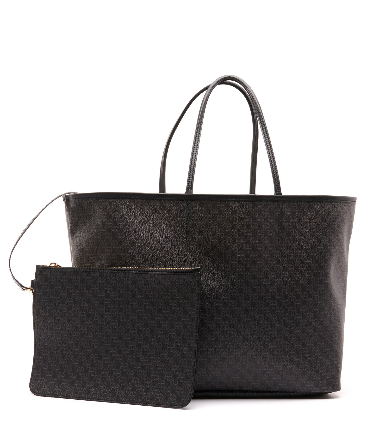Sac cabas en toile enduite noire ornée d’un imprimé monogramme ANINE en all over ton sur ton. Deux anses pour porté main ou épaule. Intérieur composé d’un grand compartiment avec une pochette zippée assortie amovible retenue par un lien à mousquetons. Pièces métalliques dorées. Non doublé.
