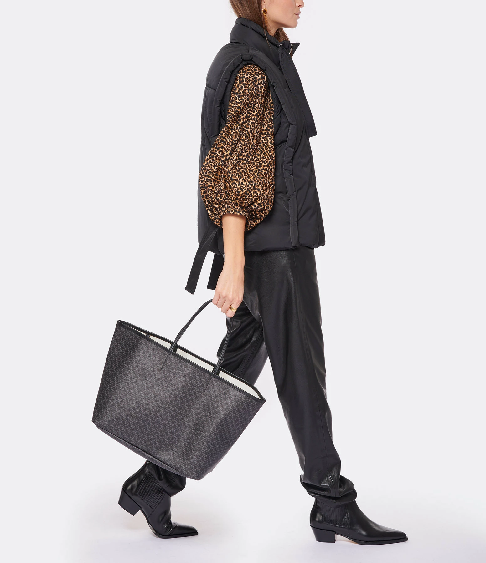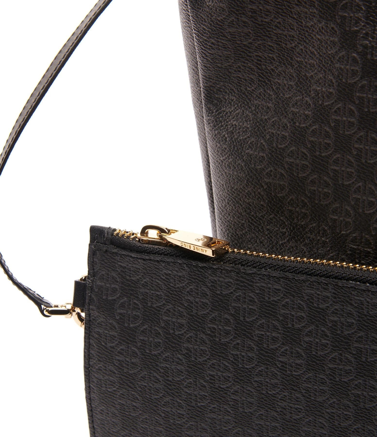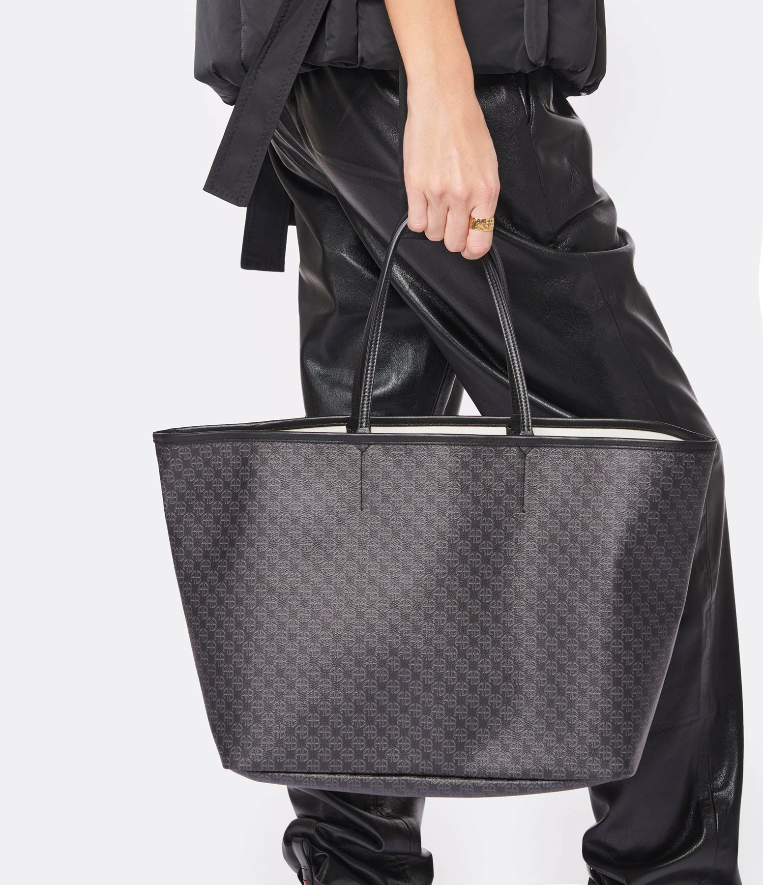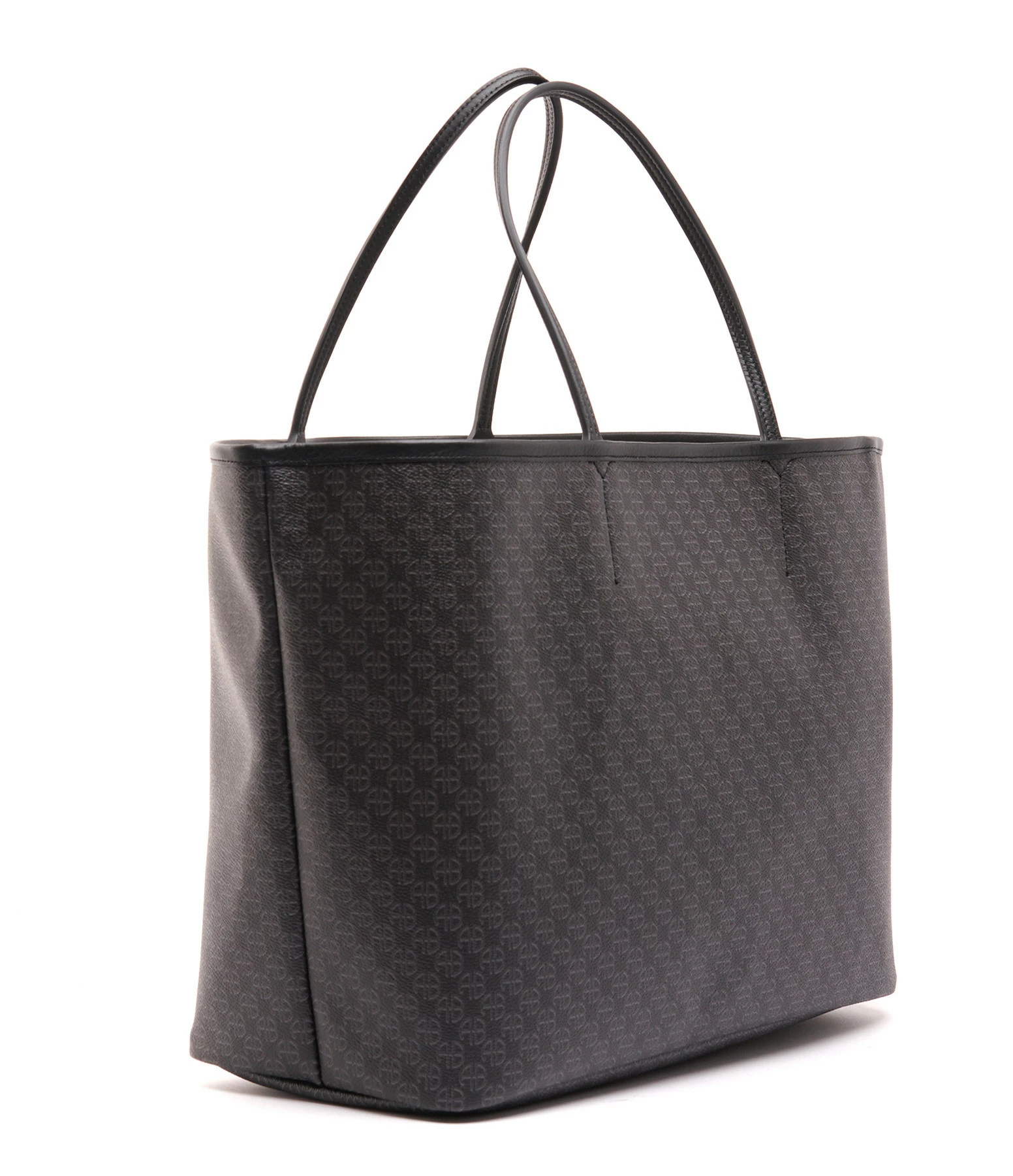 Sac cabas en toile enduite noire ornée d’un imprimé monogramme ANINE en all over ton sur ton. Deux anses pour porté main ou épaule. Intérieur composé d’un grand compartiment avec une pochette zippée assortie amovible retenue par un lien à mousquetons. Pièces métalliques dorées. Non doublé.