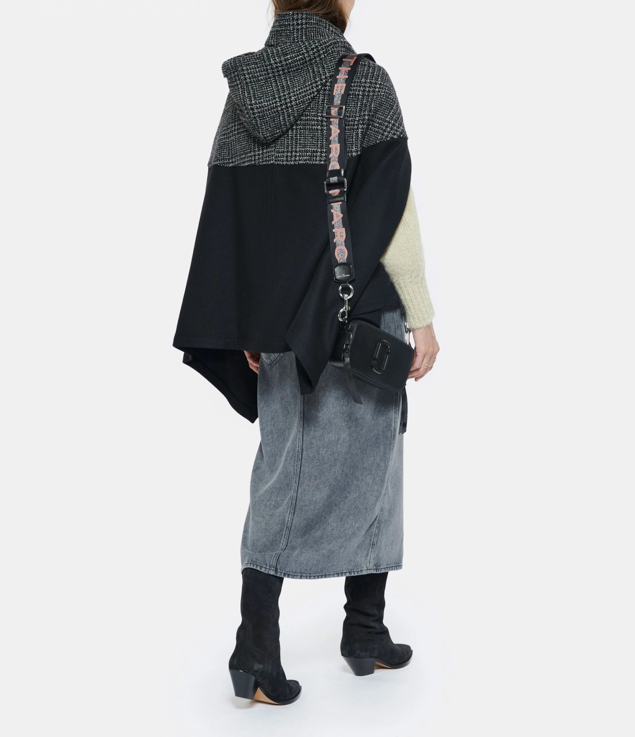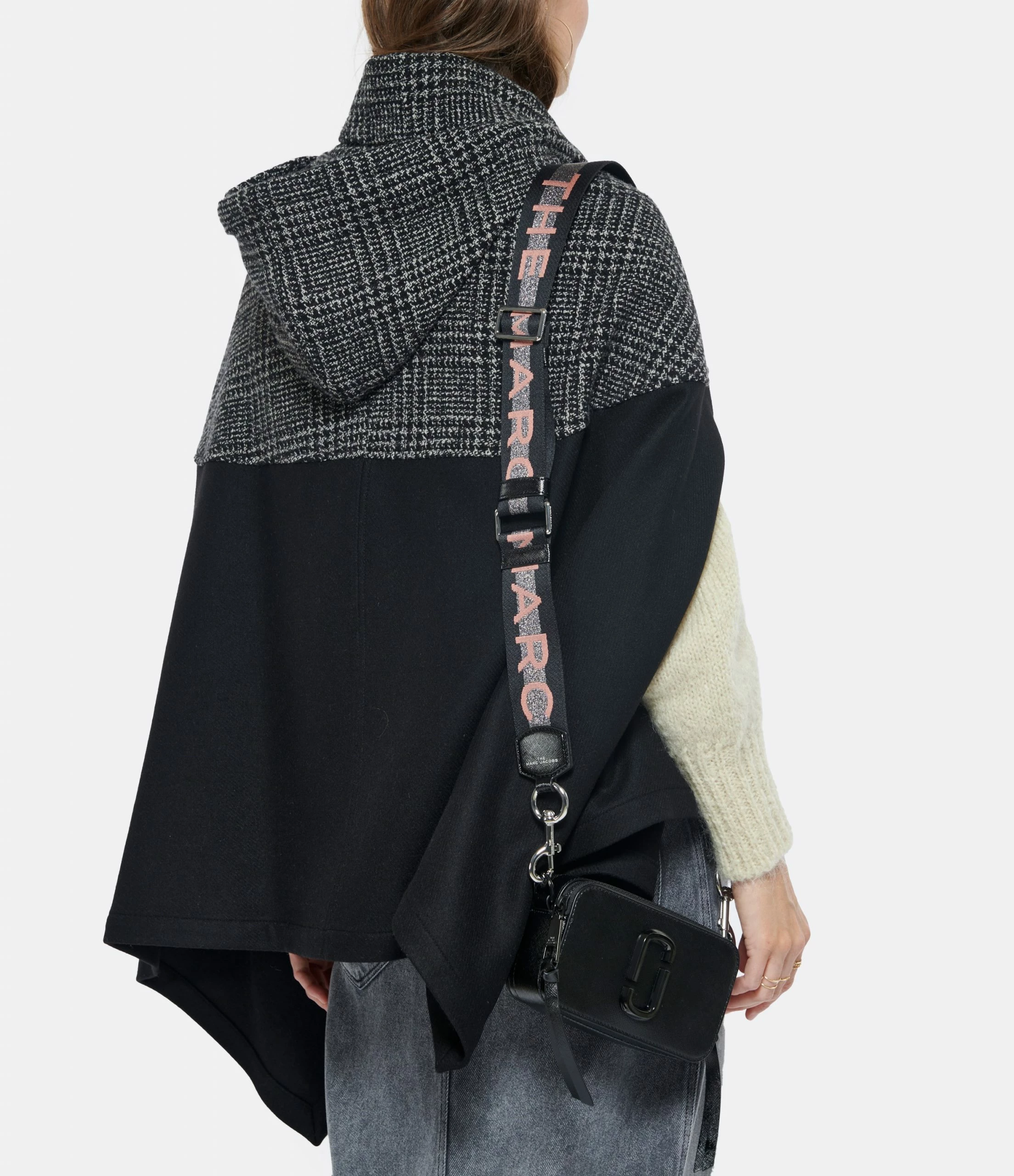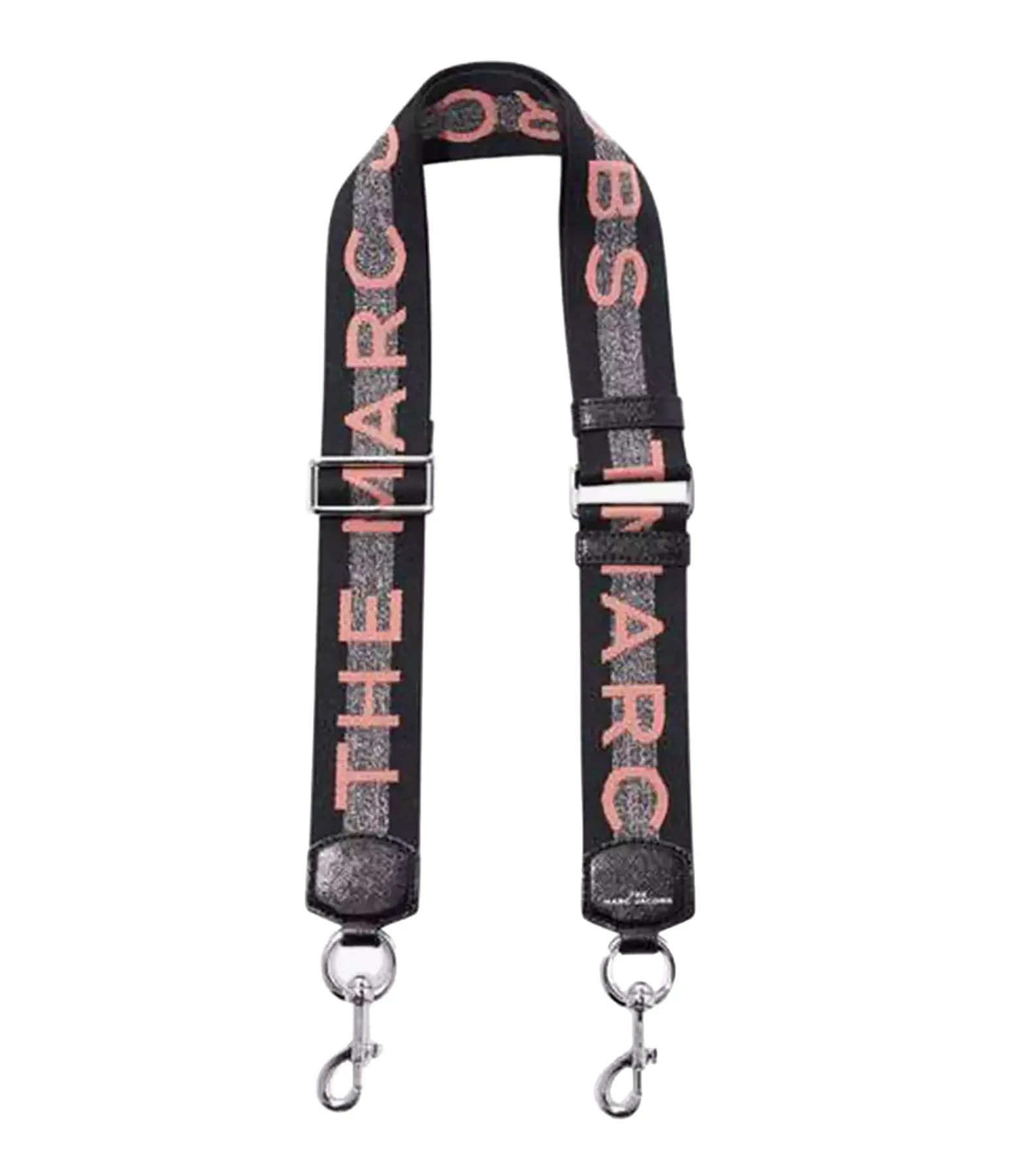 Bandoulière en toile noire avec inscription “MARC JACOBS” tissée sur une bande argentée. Ajustable et amovible par mousqueton métallique argent.