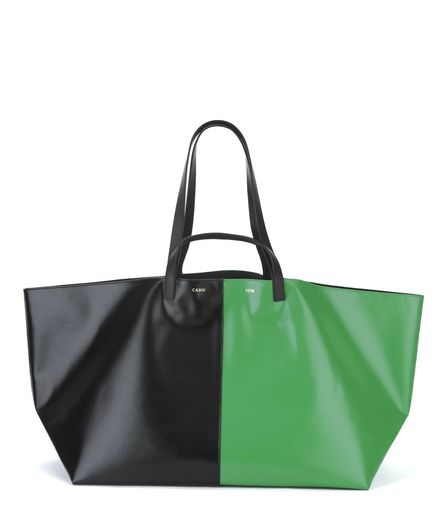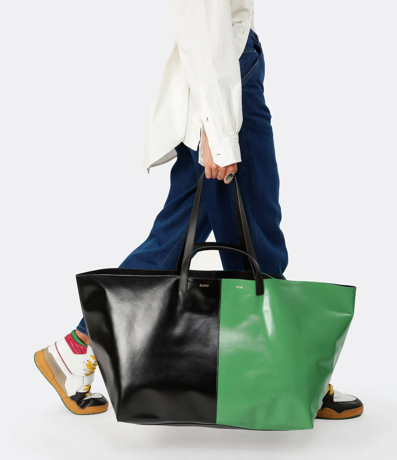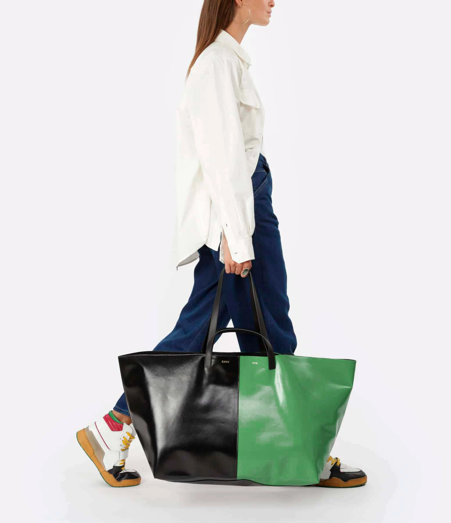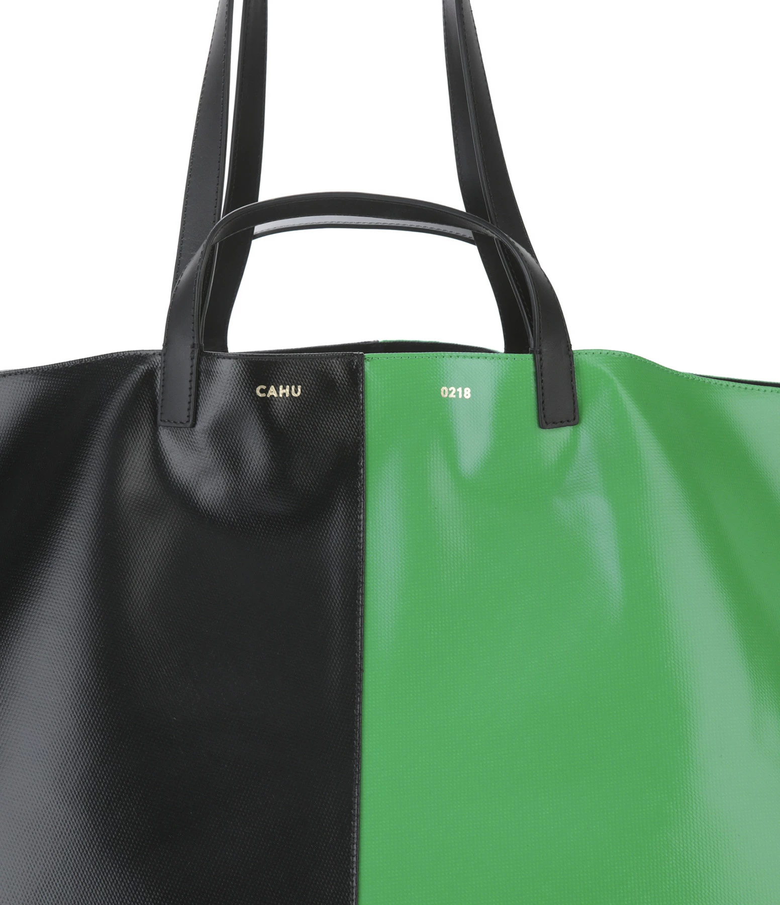 Sac cabas en toile PVC imperméable vert et noir. Deux poignées et deux anses en cuir. Logo imprimé en doré sur devant. Intérieur doublé en coton composé d’un compartiment avec une poche plaquée.