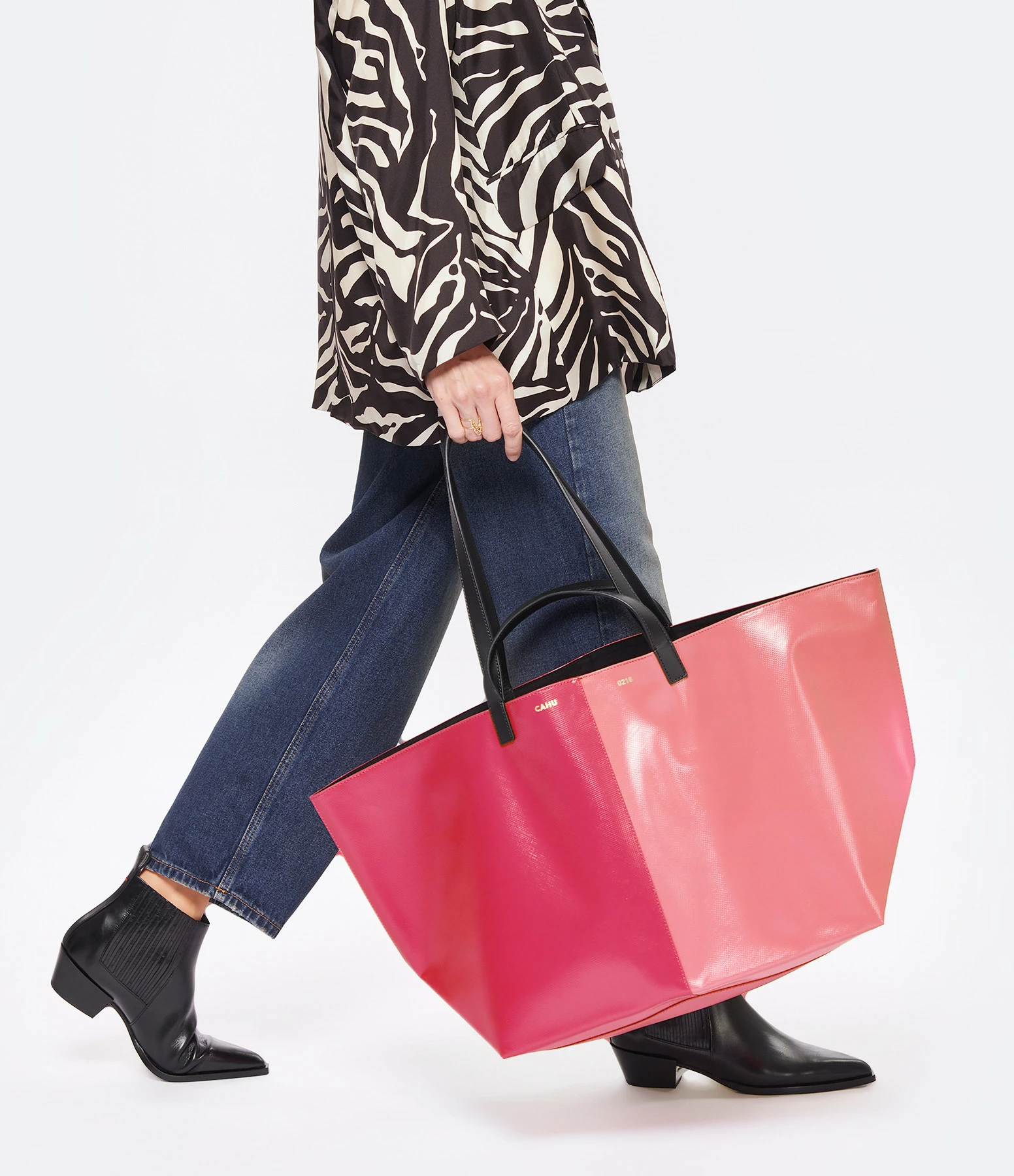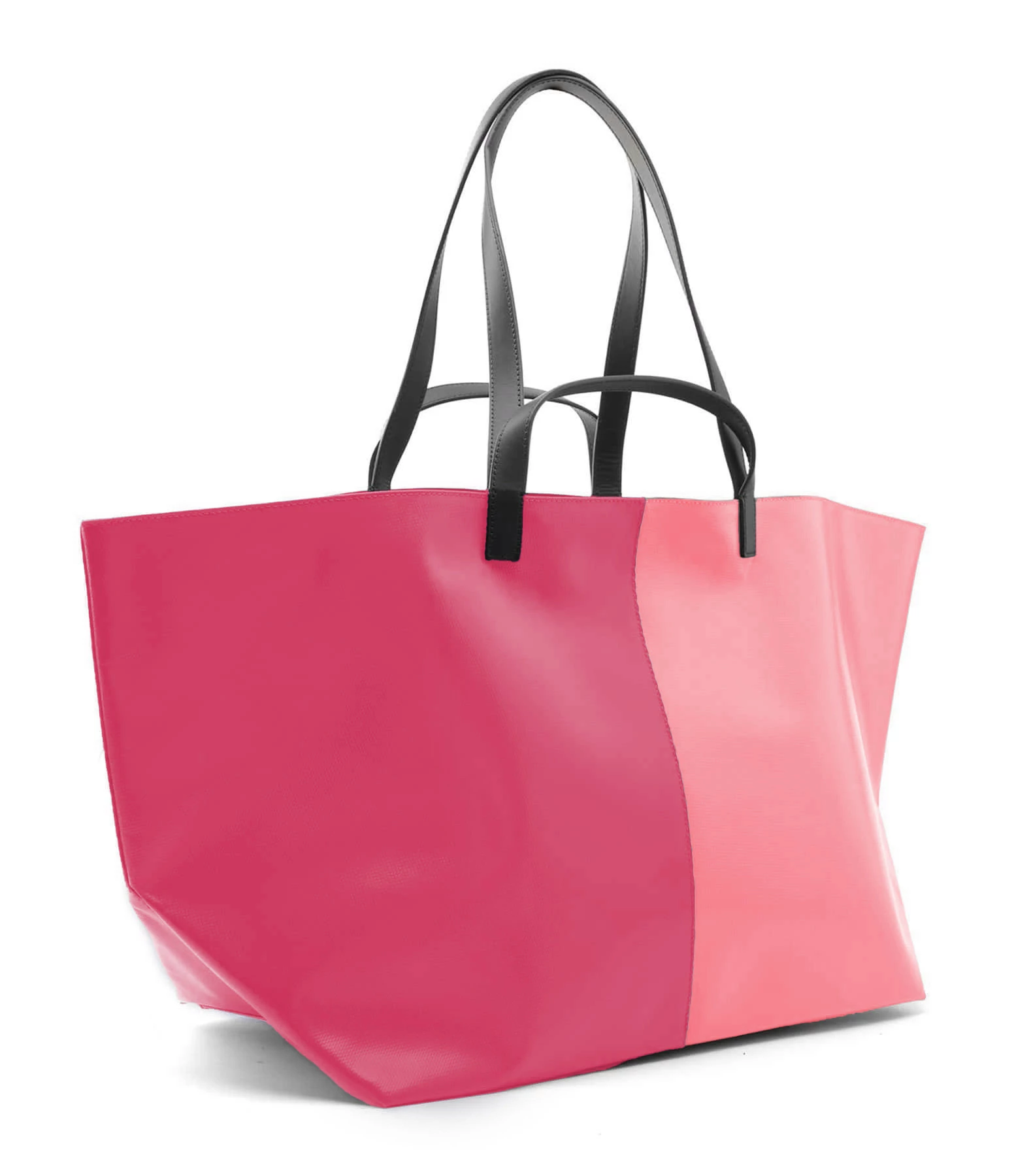 Sac cabas en toile PVC imperméable rose et fuchsia. Deux poignées en cuir pour porté main et deux anses en cuir pour porté épaules. Logo imprimé en doré sur devant. Intérieur doublé en coton composé d’un compartiment avec une poche plaquée.