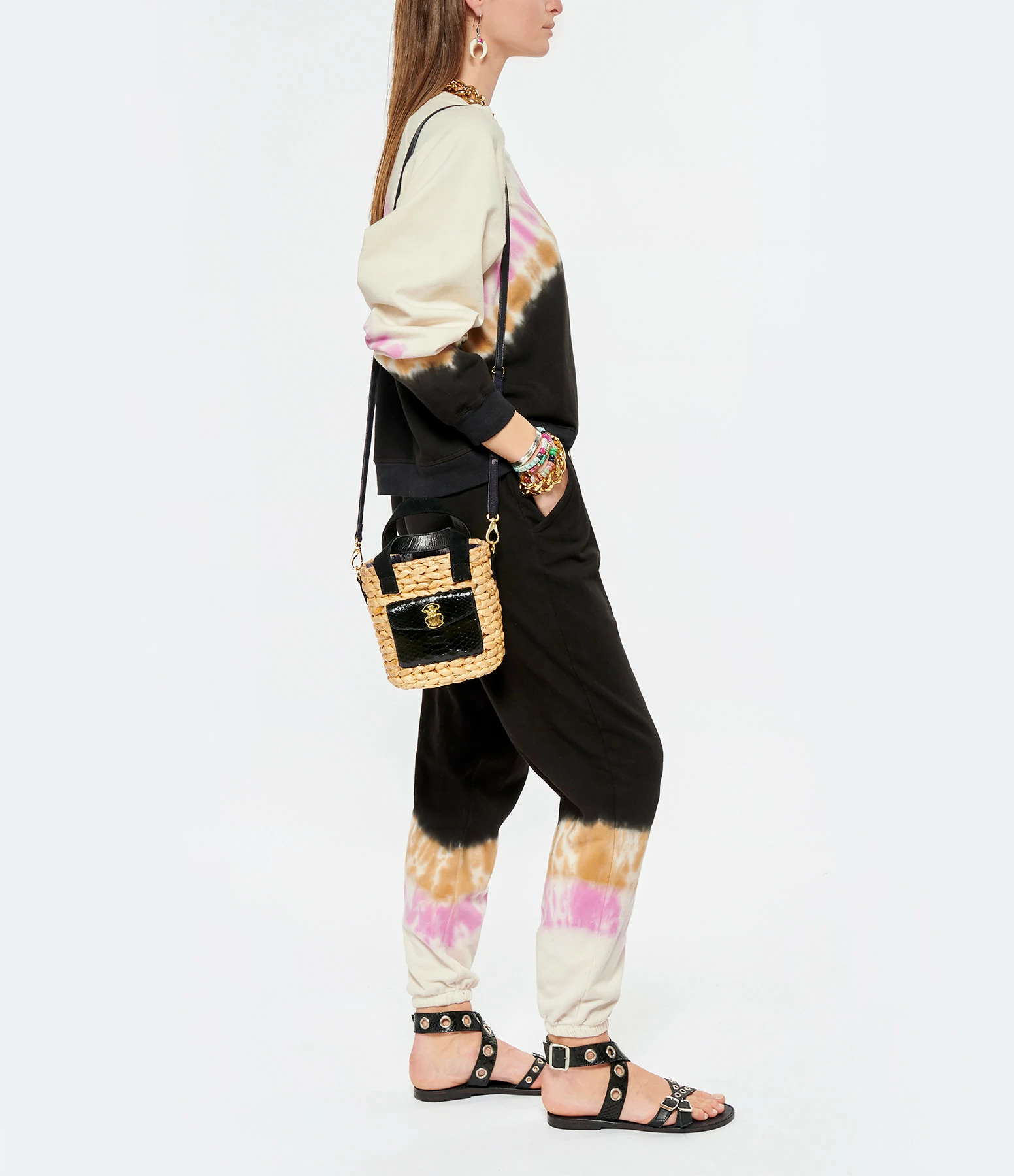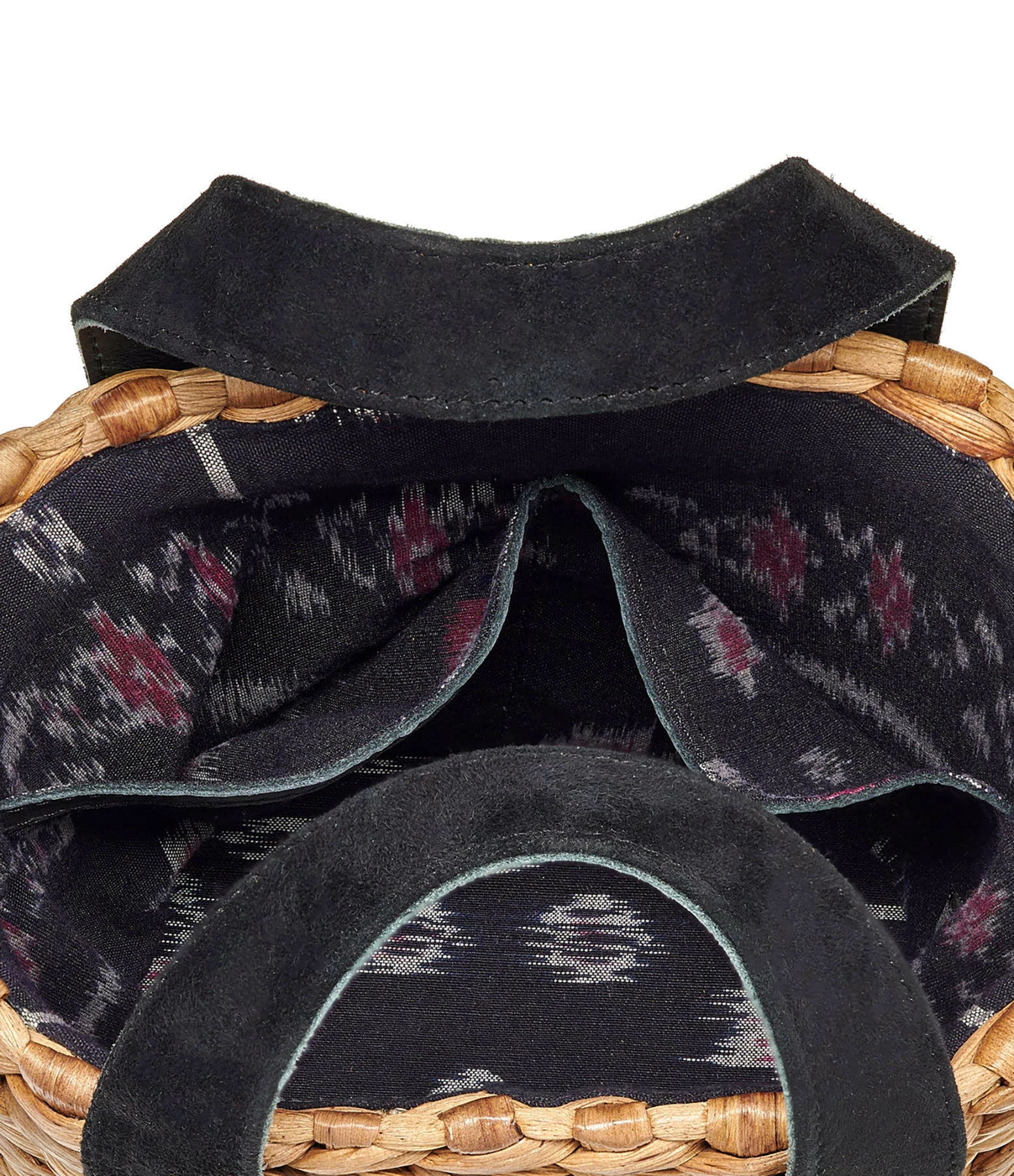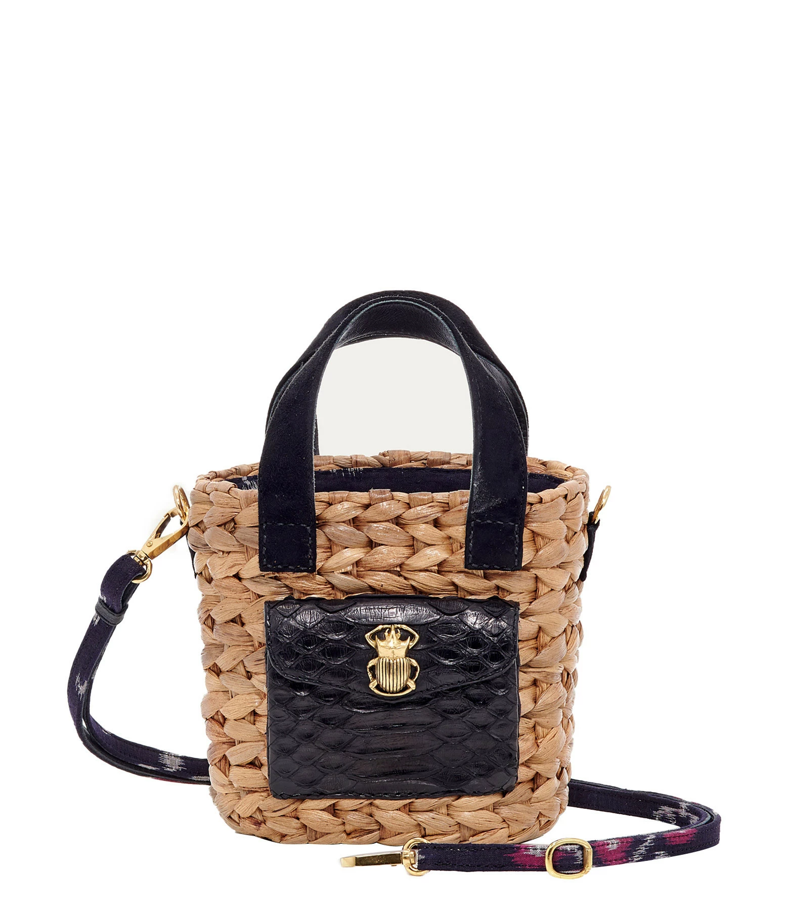 Petit panier en feuilles de jacinthe tressées avec mini pochette en python noir orné d’un scarabée doré à l’avant. Deux anses en cuir suédé noir. Une bandoulière réglable amovible par mousquetons, tissée à la main et doublée en cuir. Intérieur doublé en tissu imprimé et liens de serrage pour fermer le panier.