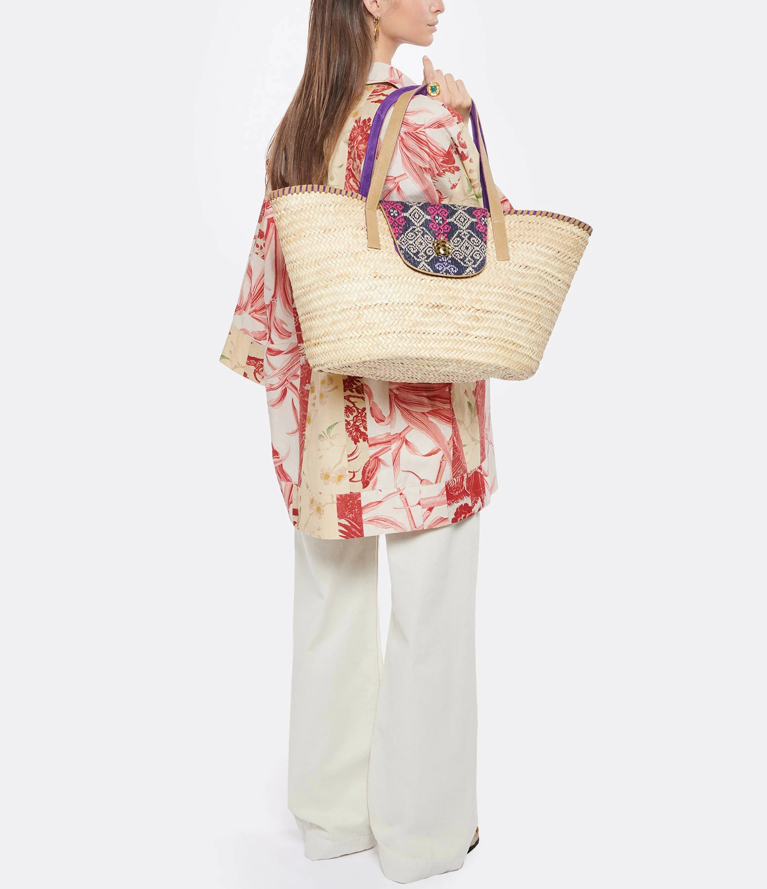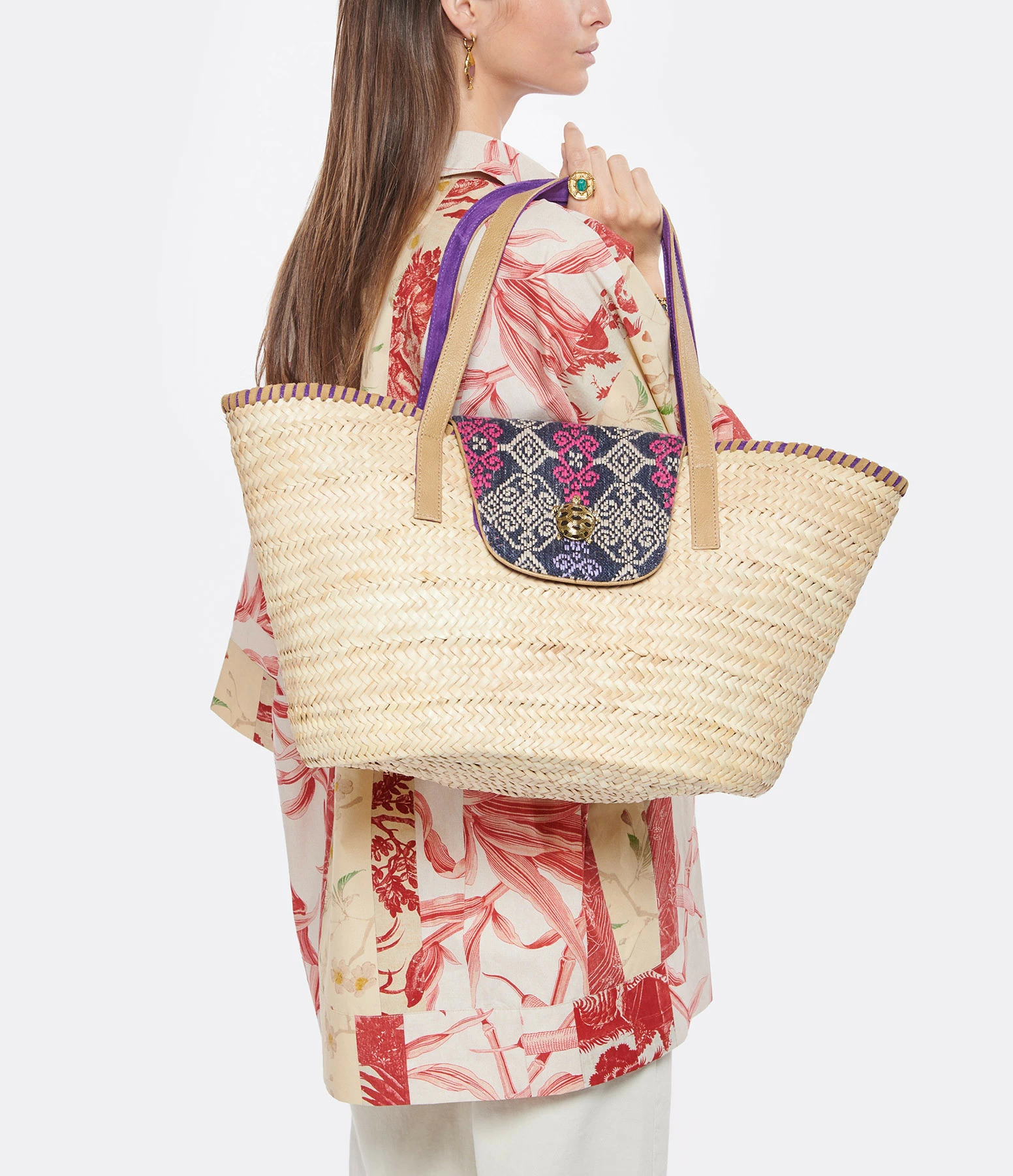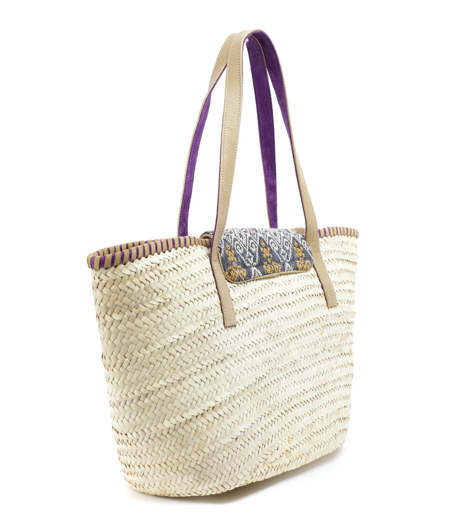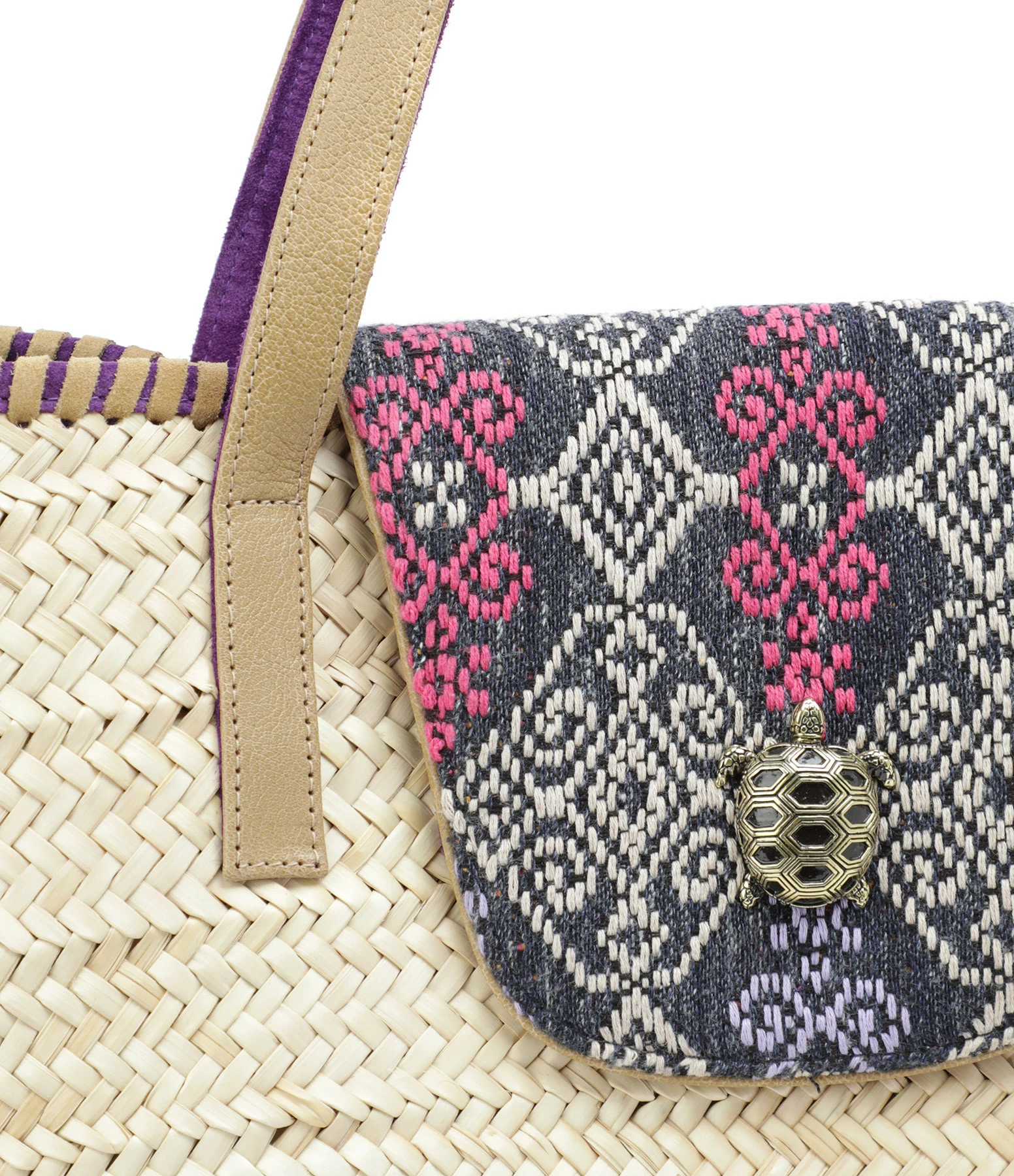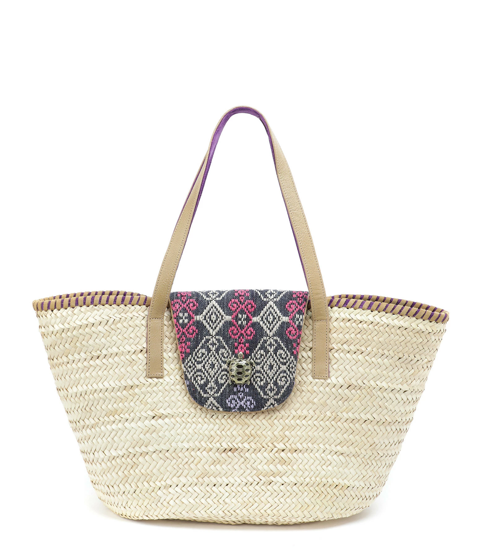 Panier en osier, en tissu et cuir. Rabat aimanté en tissu imprimé et en cuir violet orné d’une tortue en laiton. Anses en cuir beiges et violettes. Intérieur en tissu imprimé. Deux poches intérieures dont une une zippée.