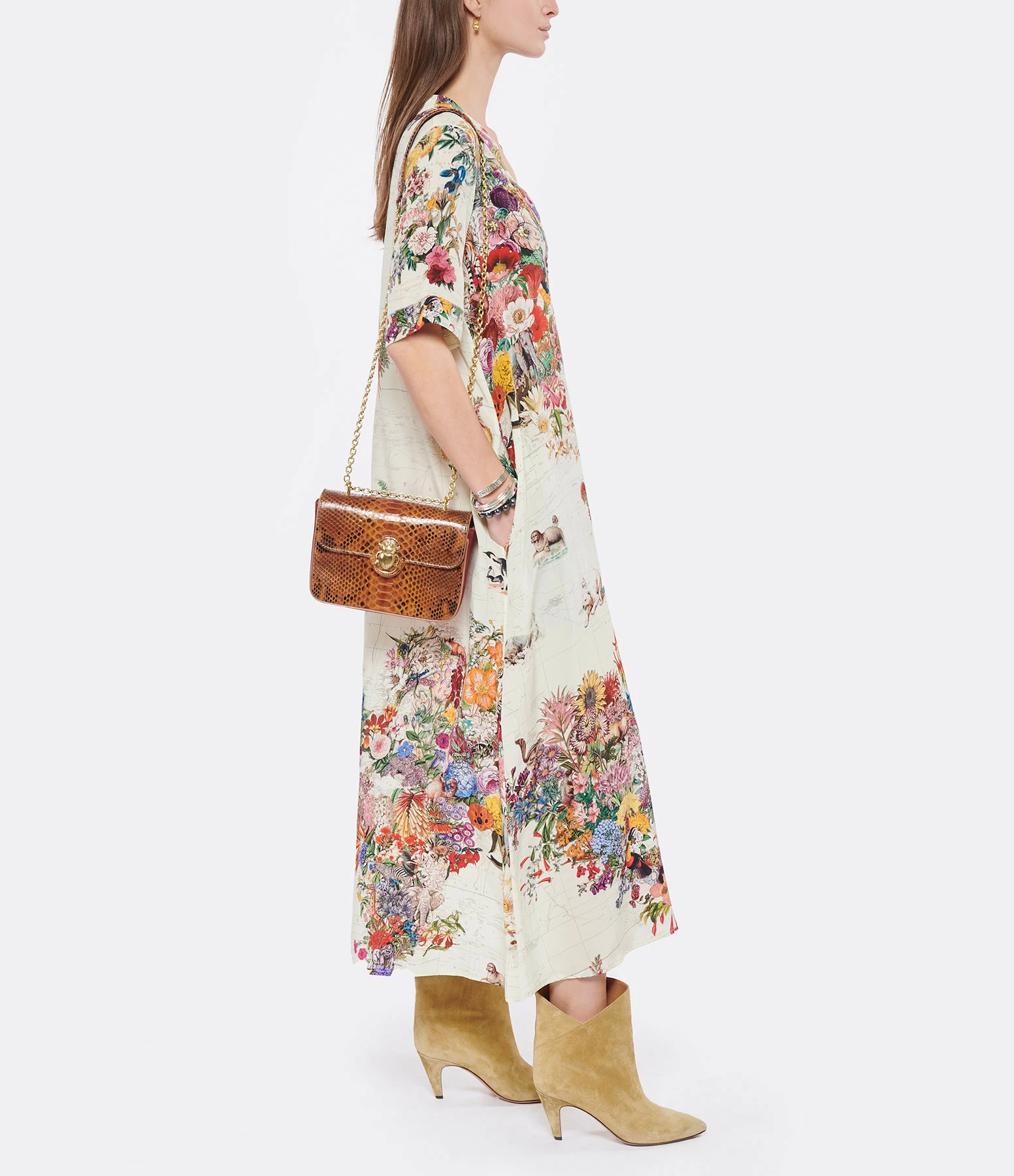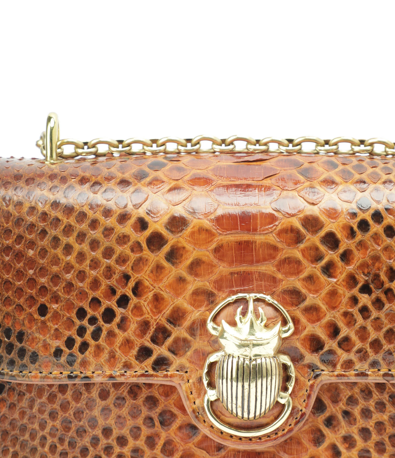 Sac bandoulière en python marron et cuir suédé bordeaux. Bandoulière chaîne à porter en simple ou en double. Fermoir par rabat aimanté avec bijoux scarabée doré. Intérieur doublé en coton avec une poche zippée.