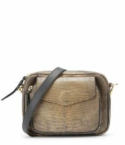Sac en lézard et cuir suédé effet doré vieilli pour femme. Compartiment avec une poche à l’avant. Poche interne. Bandoulière amovible avec crochets et réglable doublée en cuir.