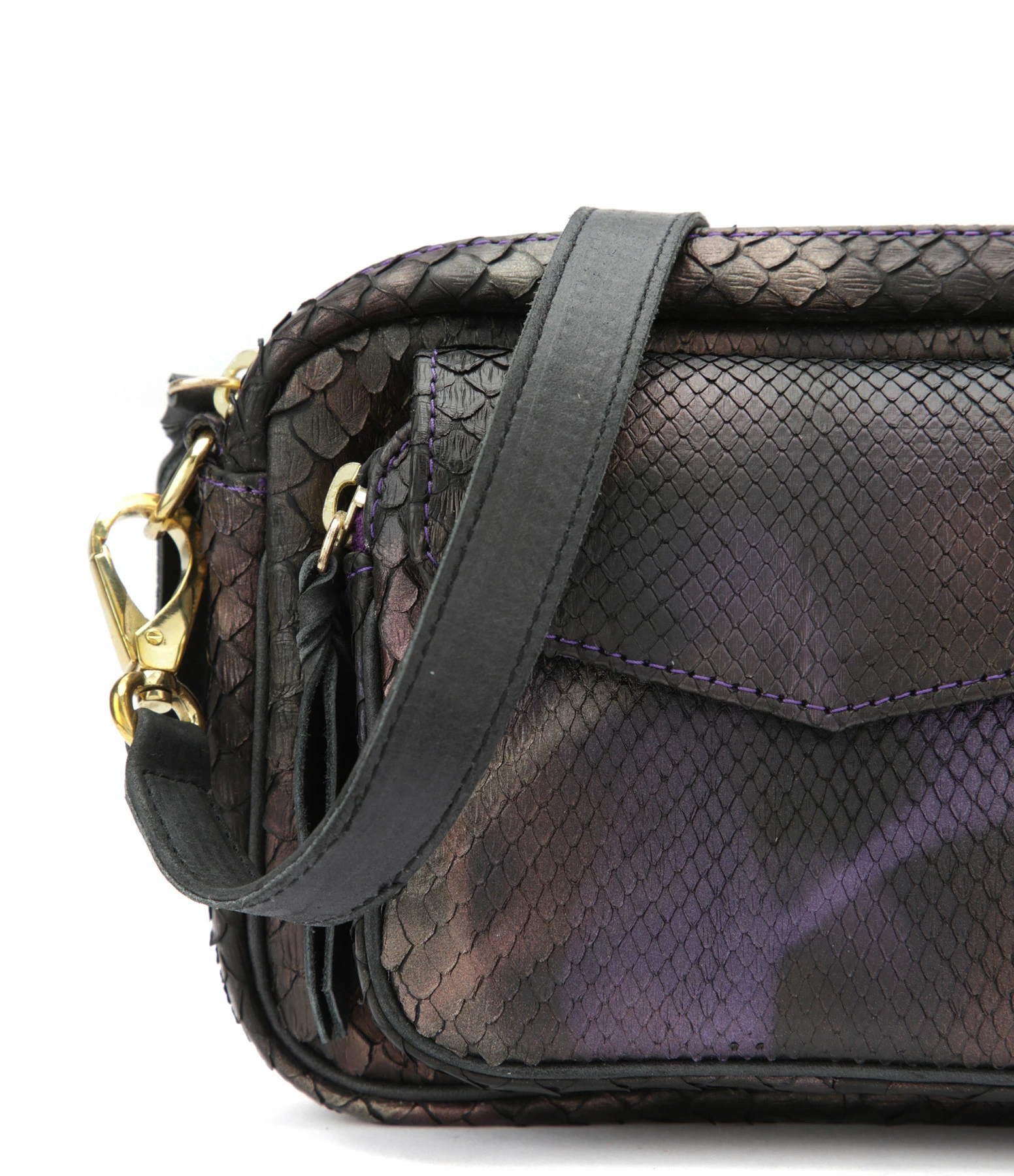 Sac en python violet et noir pour femme. Compartiment avec une poche à l’avant. Poche interne. Bandoulière amovible avec crochets et réglable doublée en cuir.