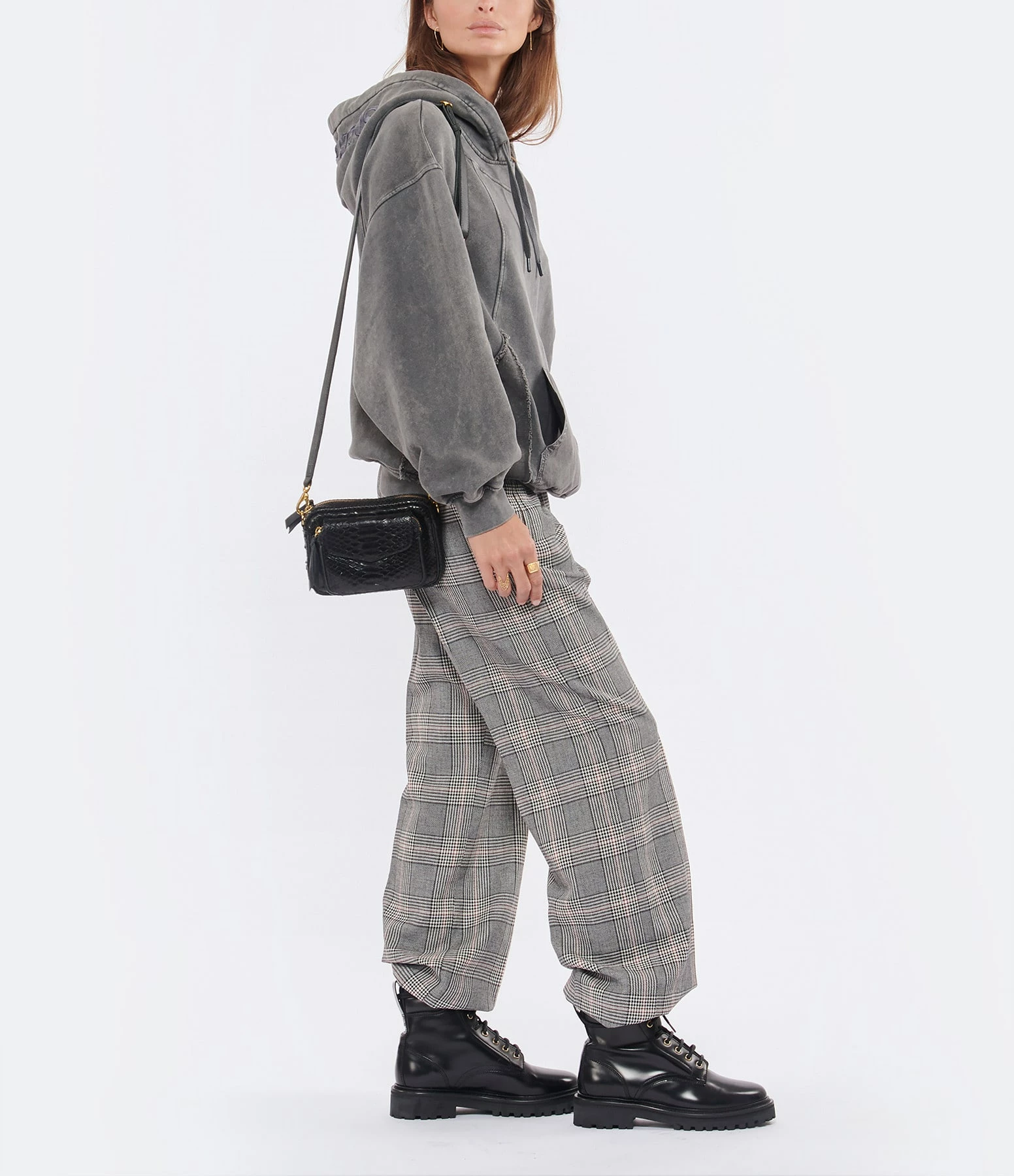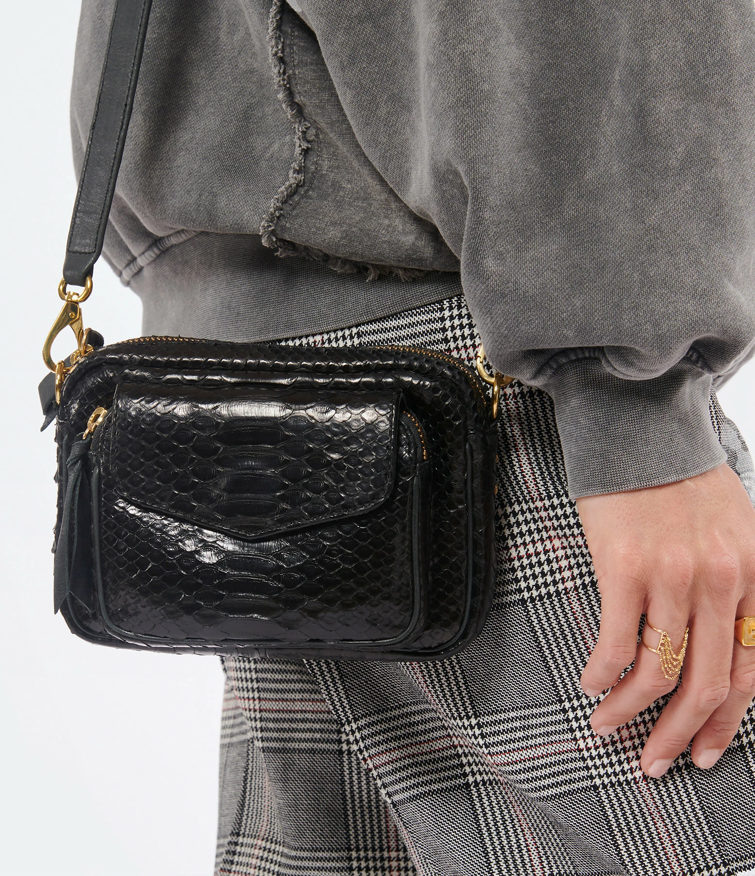 Sac en python noir. Compartiment avec une poche à l’avant. Poche interne. Bandoulière amovible avec crochets et réglable doublée en cuir.