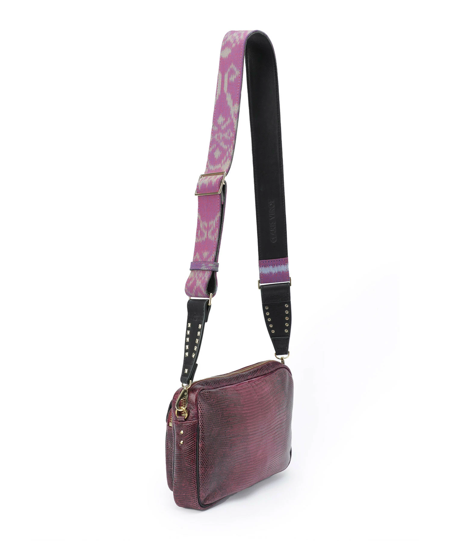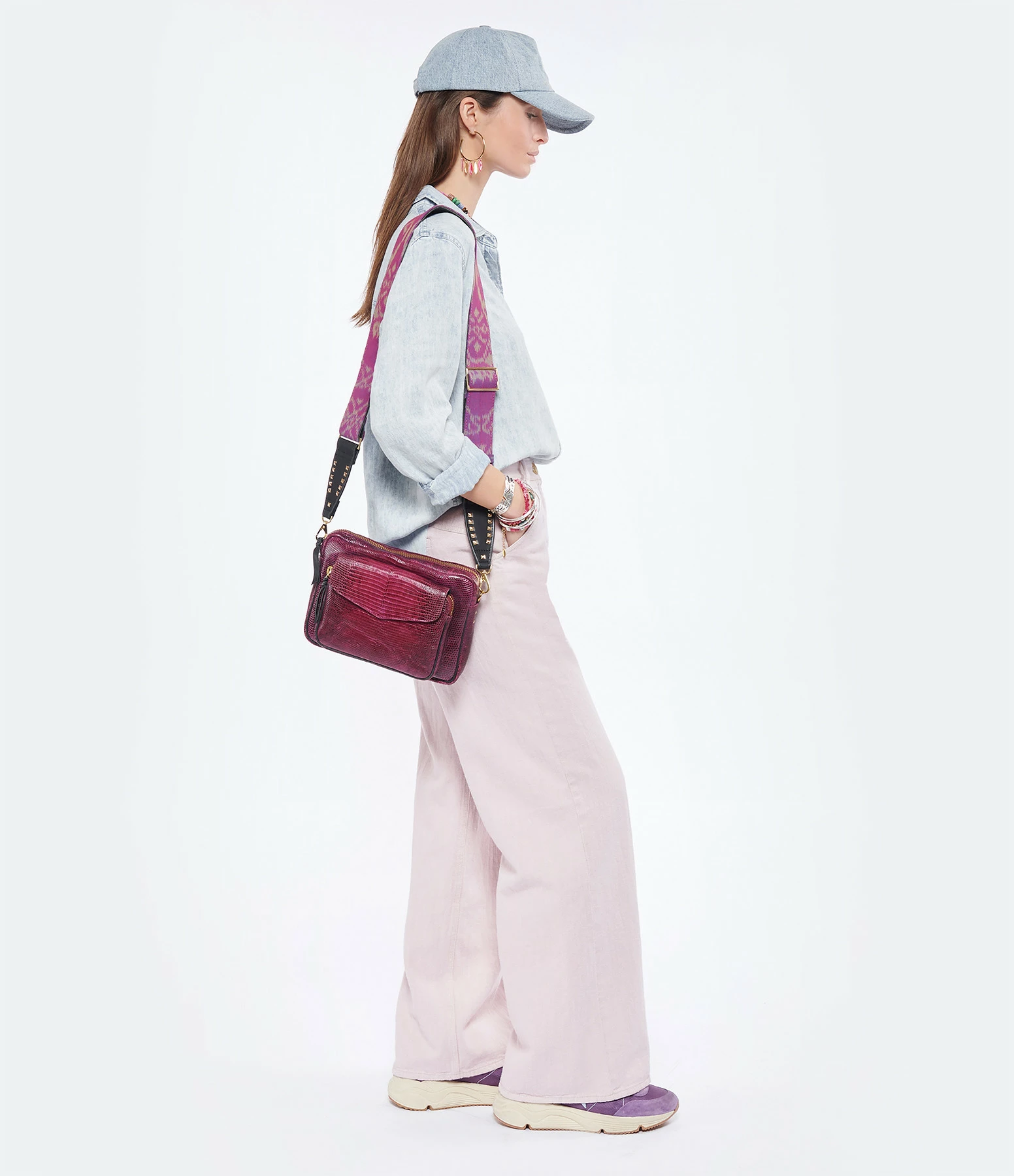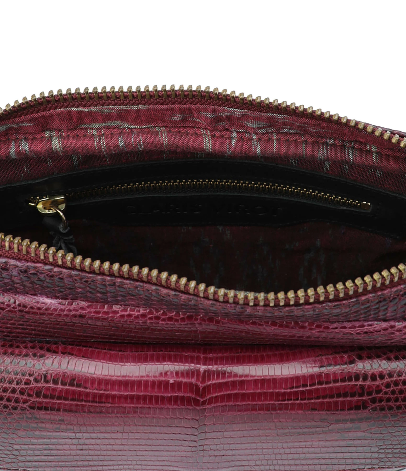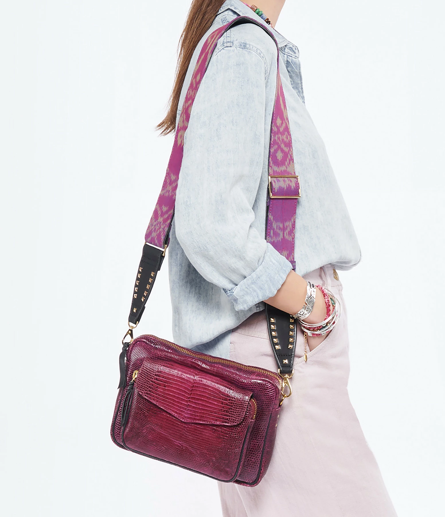 Sac en lézard violet pour femme. Deux compartiments. Fermeture zippée et poche avant aimantée à rabat. Poche intérieure. Bandoulière tissée à la main amovible avec crochets et réglable doublée en cuir. Intérieur doublé en coton avec un poche zippée.