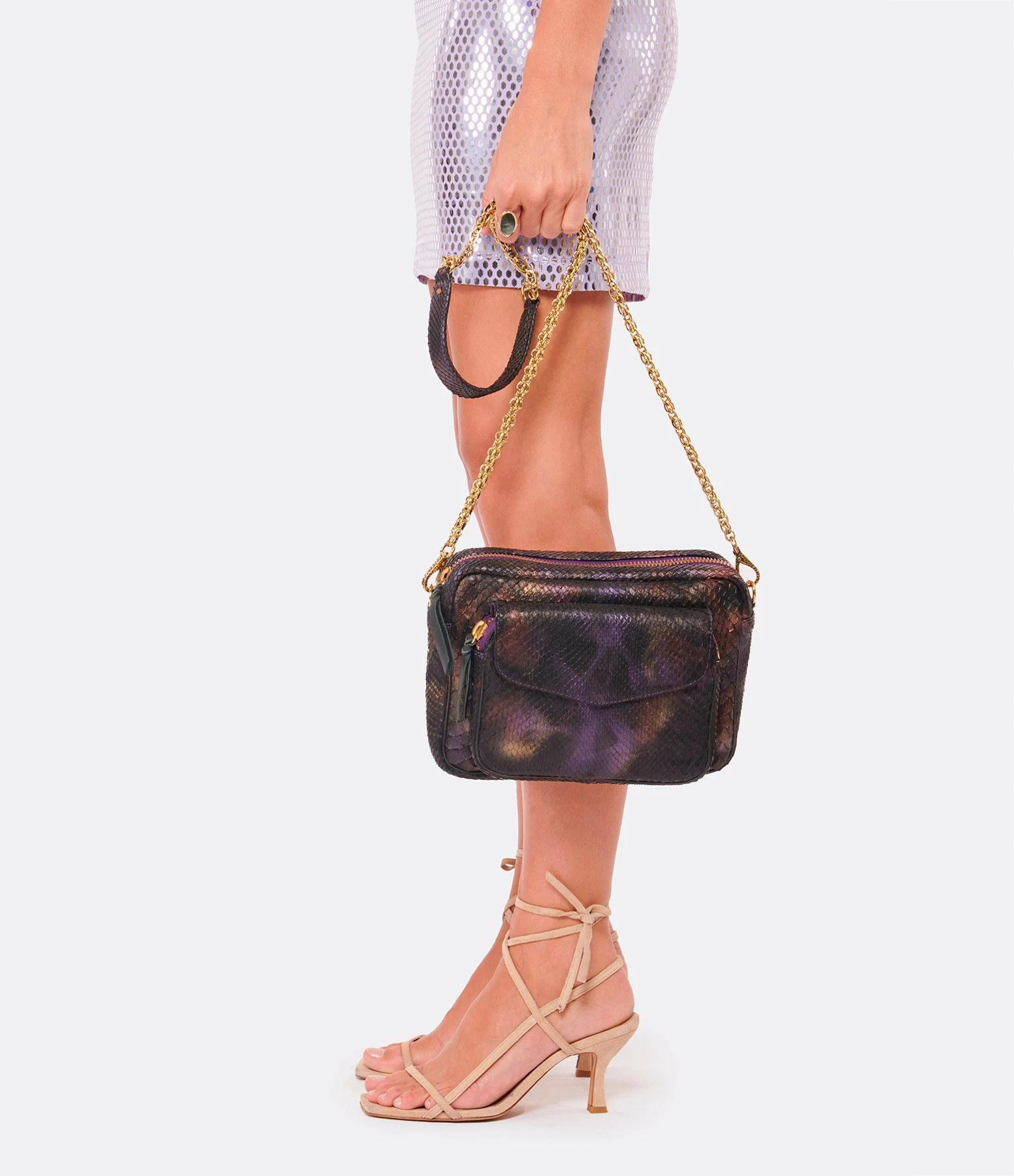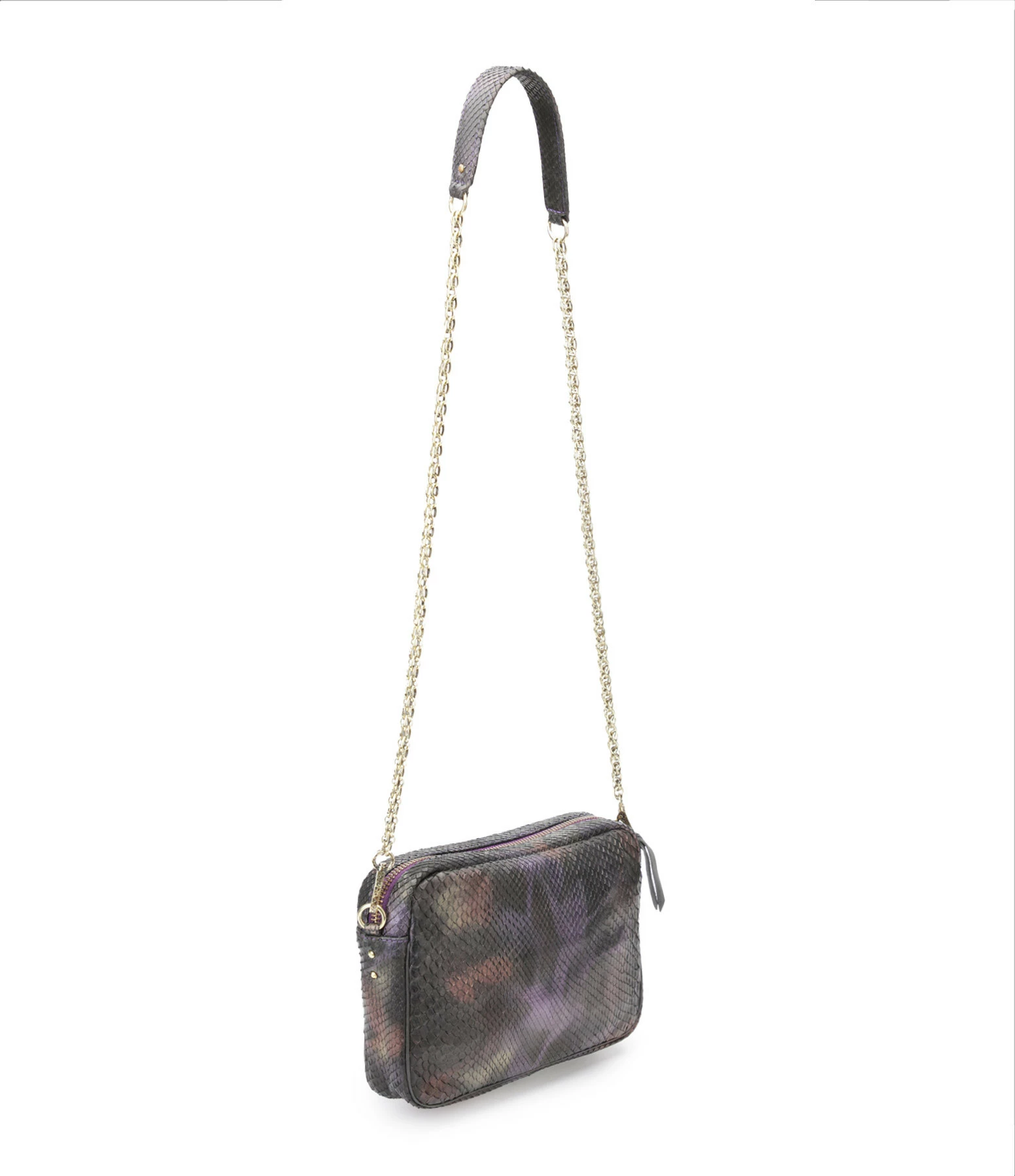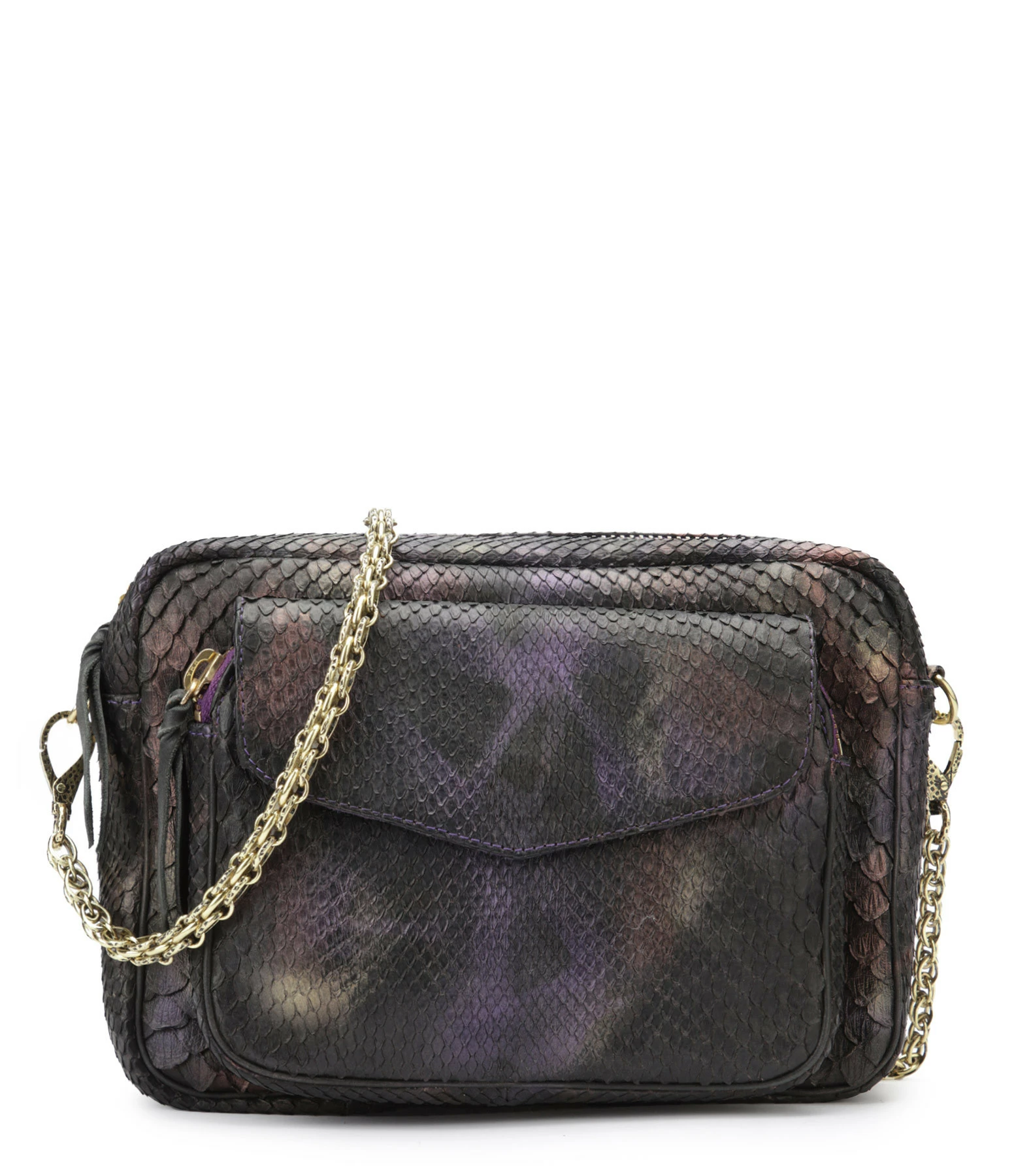 Sac en python violet foncé pour femme. Deux compartiments. Fermeture zippée et poche avant aimantée à rabat. Poche intérieure. Chaîne bandoulière à gros maillons. Intérieur doublé en coton avec un poche zippée.