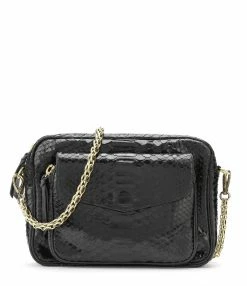 Sac en python noir pour femme. Deux compartiments. Fermeture zippée et poche avant aimantée à rabat. Poche intérieure. Chaîne bandoulière à gros maillons. Intérieur doublé en coton avec une poche zippée.
