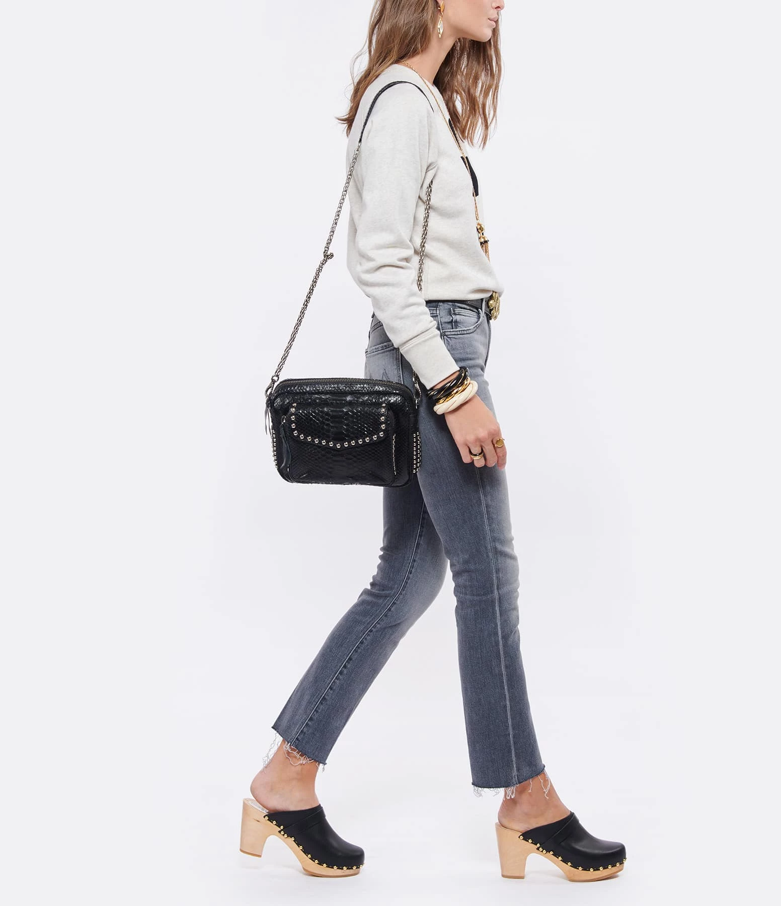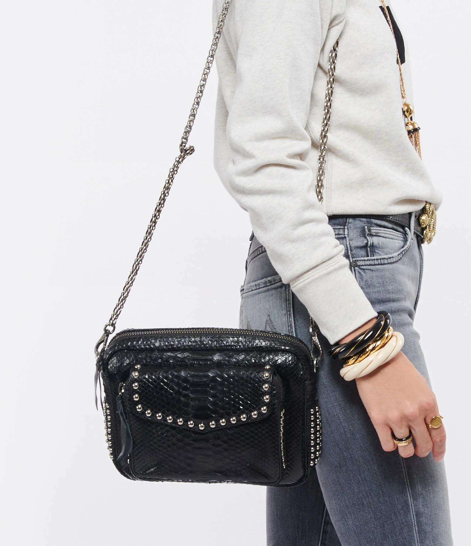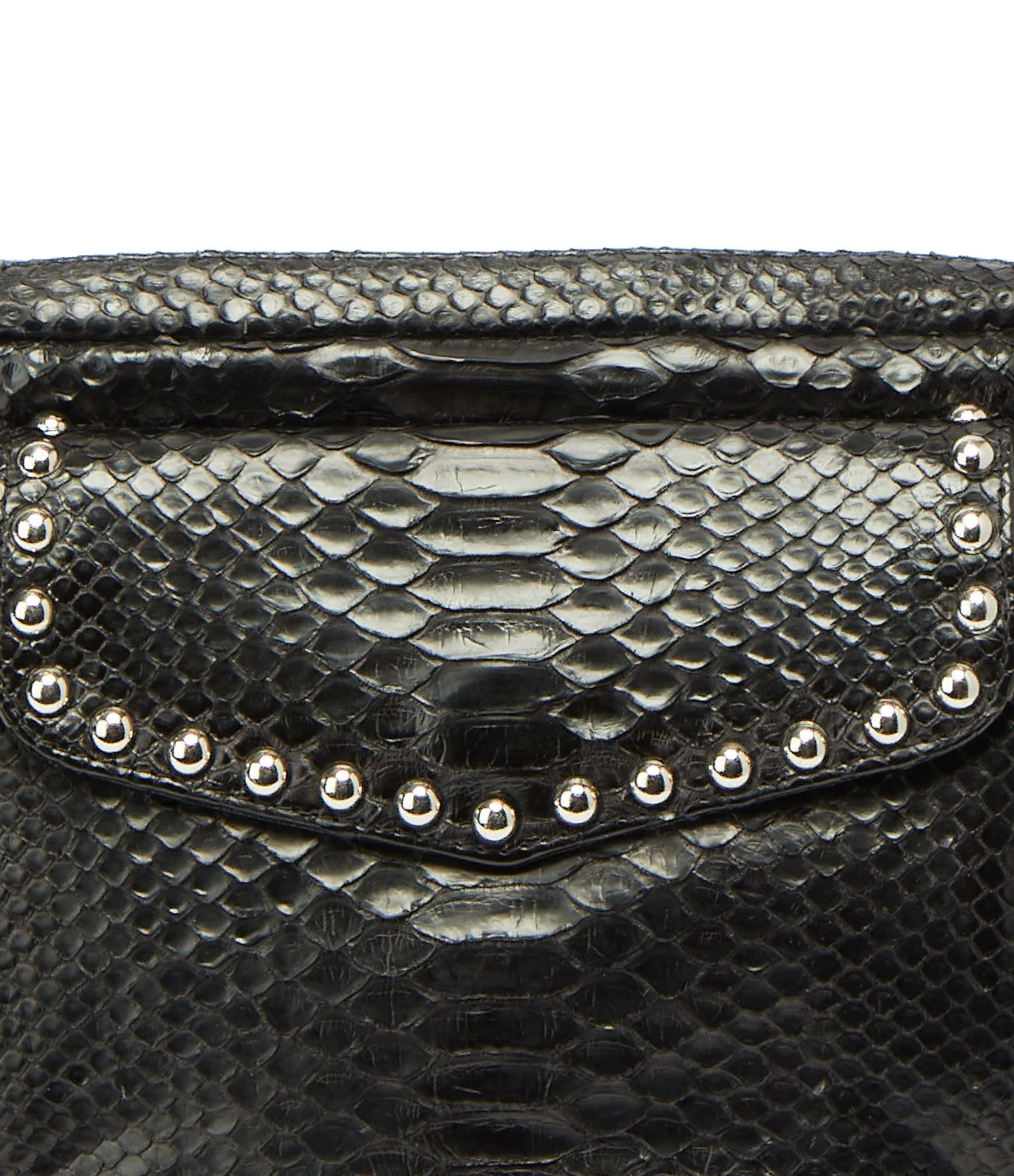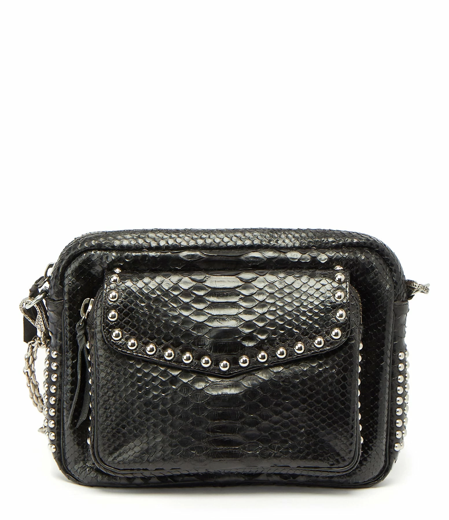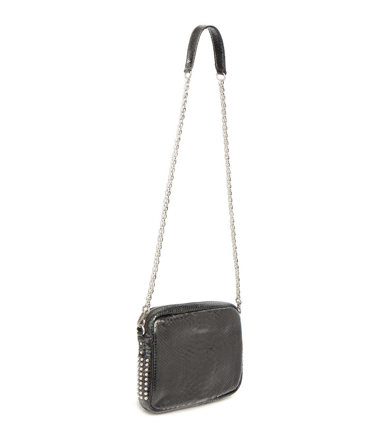 Sac en python noir et clous argentés pour femme. Deux compartiments. Fermeture zippée et poche avant aimantée à rabat. Poche intérieure. Chaîne bandoulière à gros maillons. Intérieur doublé en coton.
