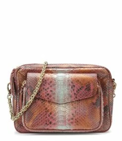 Sac en python marron orangé pour femme. Deux compartiments. Fermeture zippée et poche avant aimantée à rabat. Poche intérieure. Chaîne bandoulière à gros maillons. Intérieur doublé en coton avec un poche zippée.