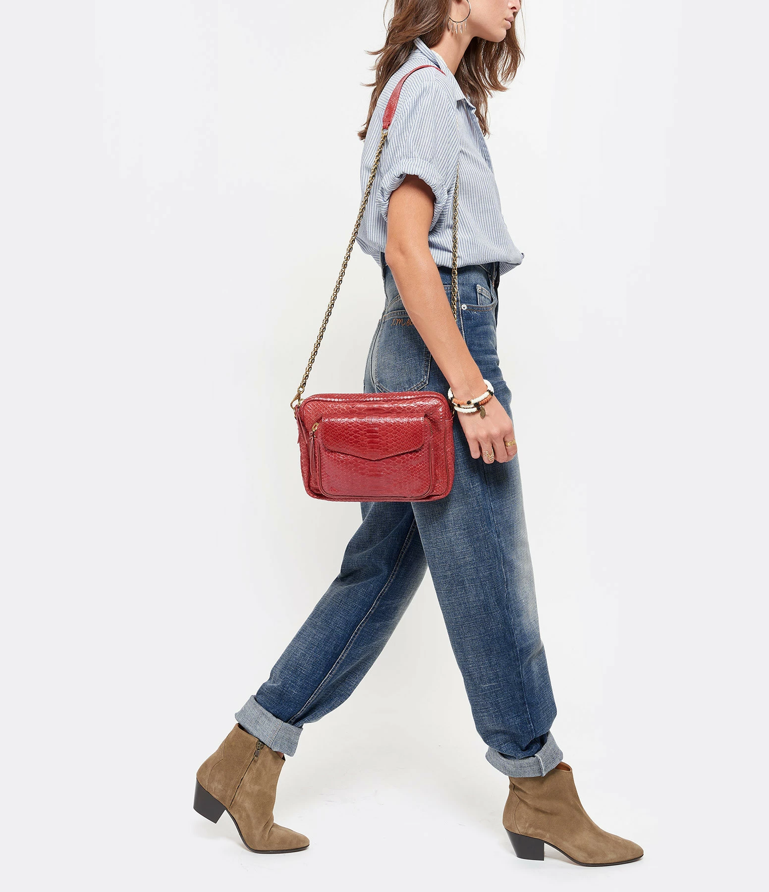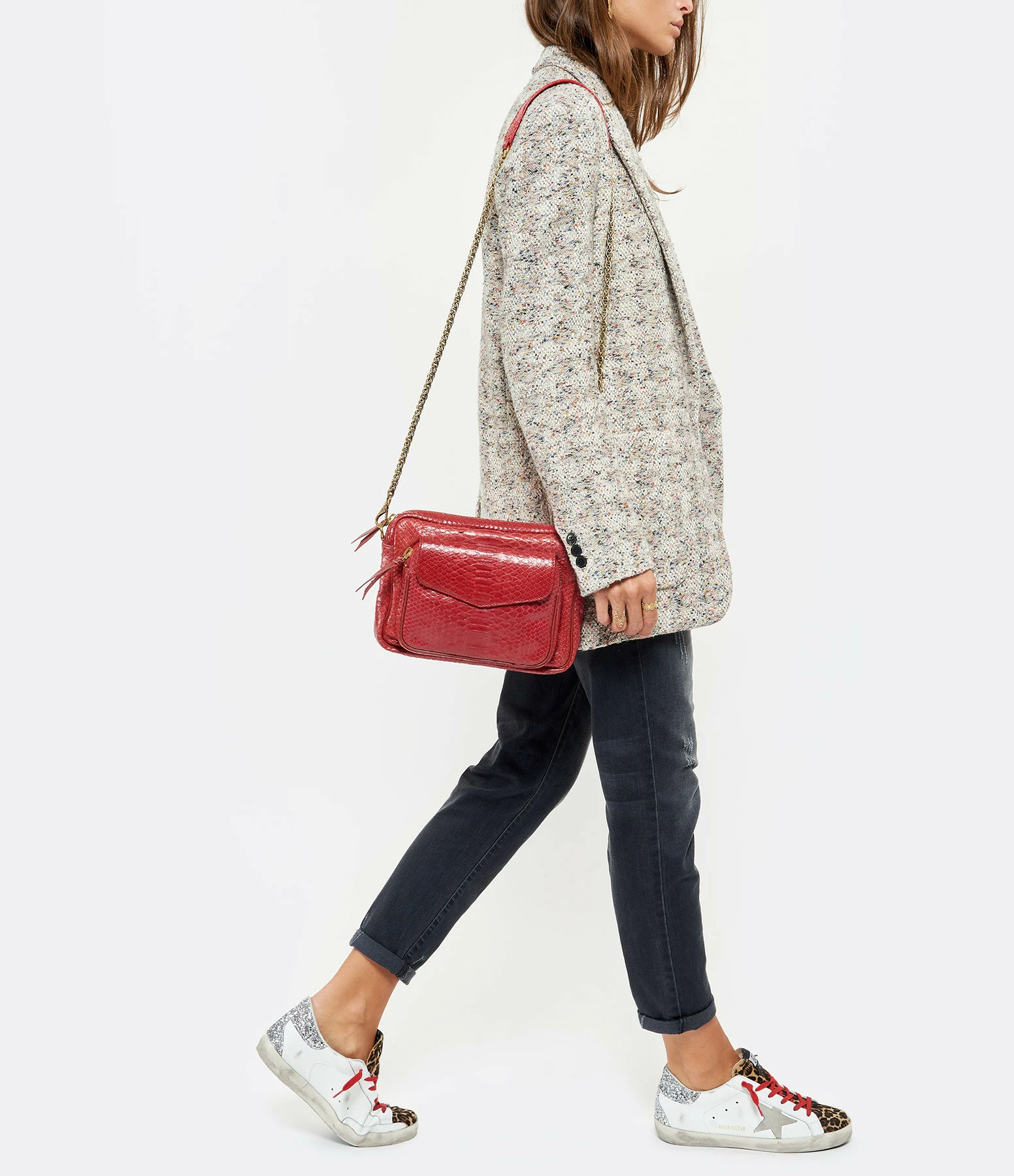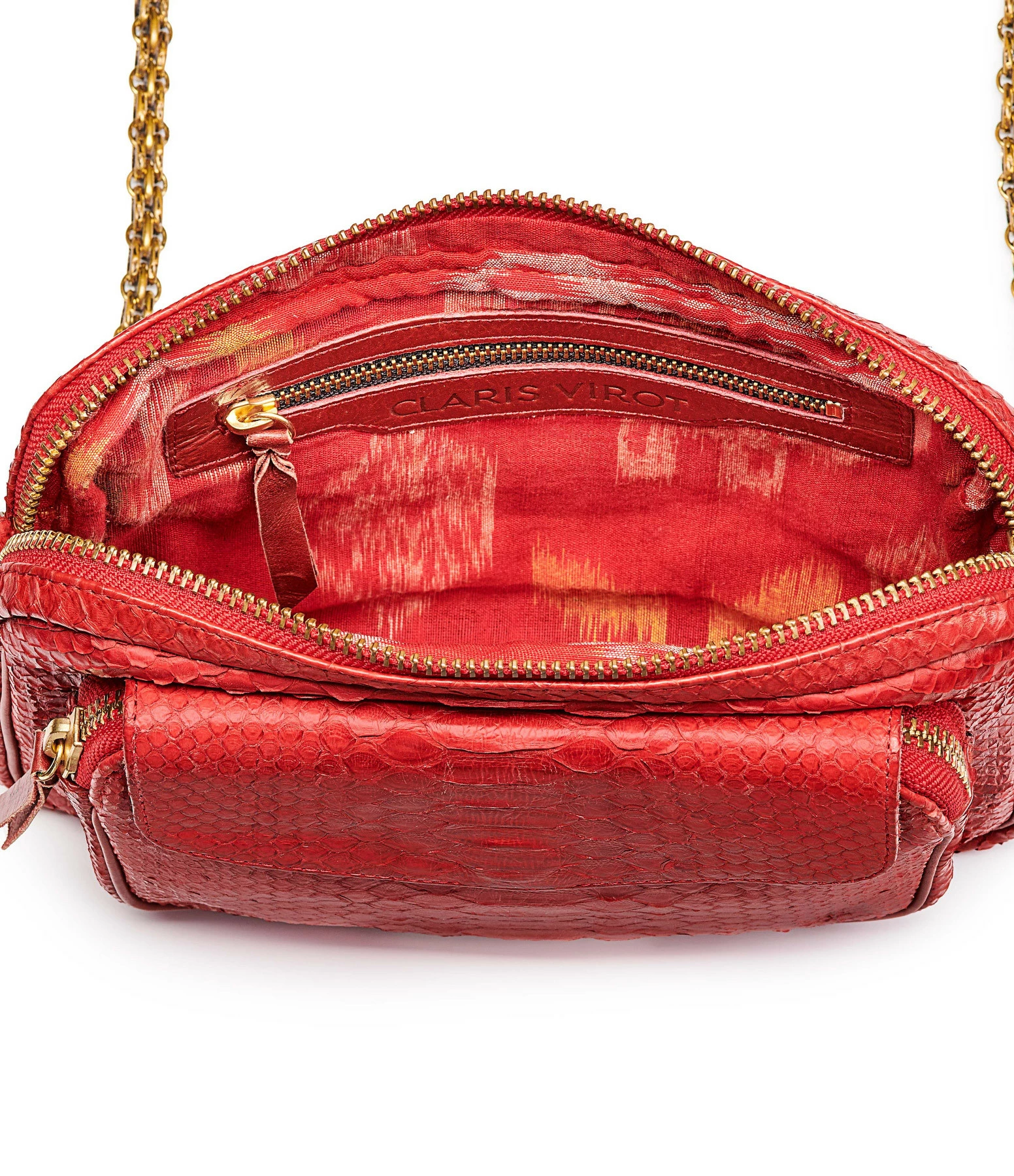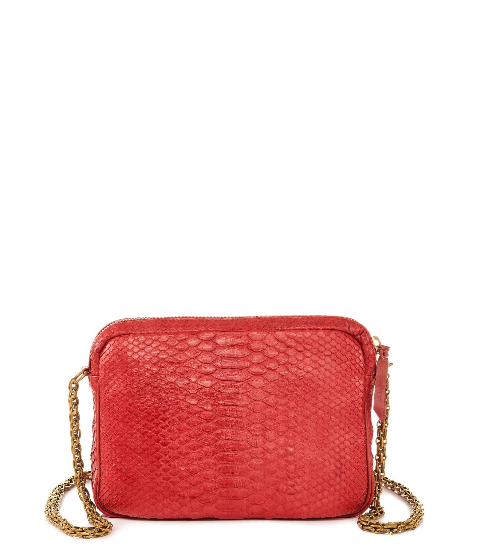 Sac en python rouge pour femme. Deux compartiments. Fermeture zippée et poche avant aimantée à rabat. Poche intérieure. Chaîne bandoulière à gros maillons. Intérieur doublé en coton avec un poche zippée.