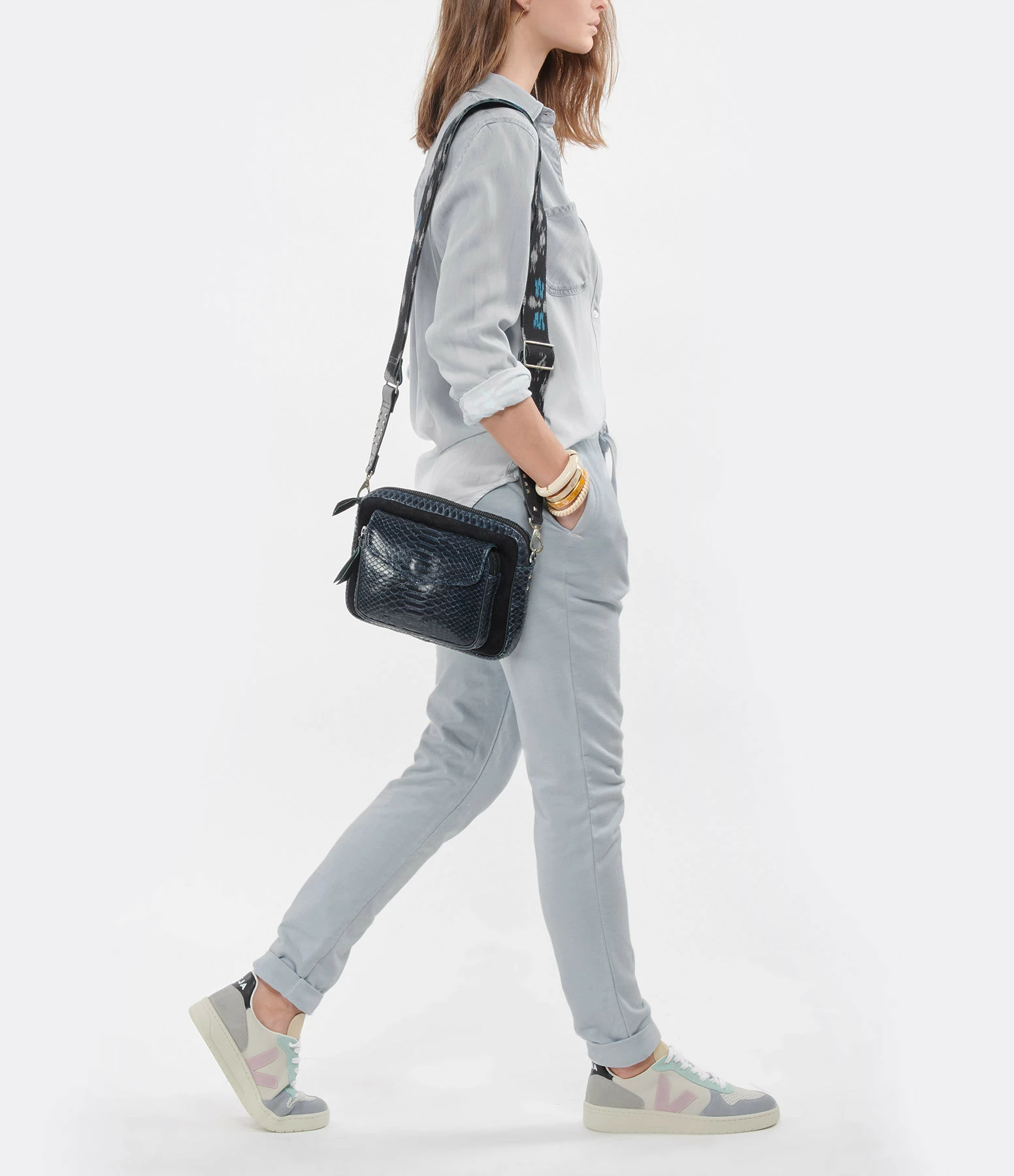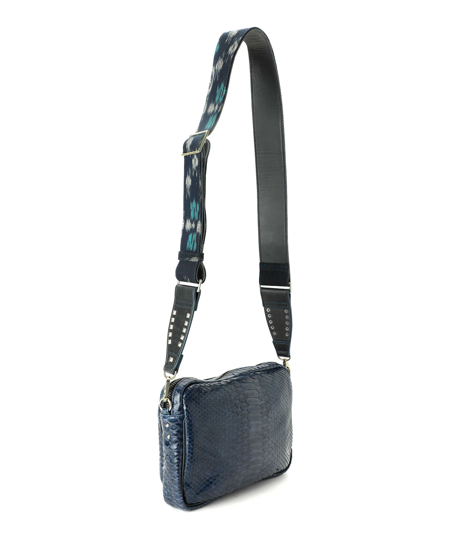 Sac en python bleu pour femme. Deux compartiments. Fermeture zippée et poche avant aimantée à rabat. Poche intérieure zippée. Bandoulière tissée à la main amovible avec crochets et réglable doublée en cuir. Intérieur doublé en coton.