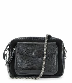 Sac en python et cuir suédé noir pour femme. Deux compartiments. Fermeture zippée et poche avant aimantée à rabat. Poche intérieure. Chaîne bandoulière amovible à gros maillons. Intérieur doublé en coton.