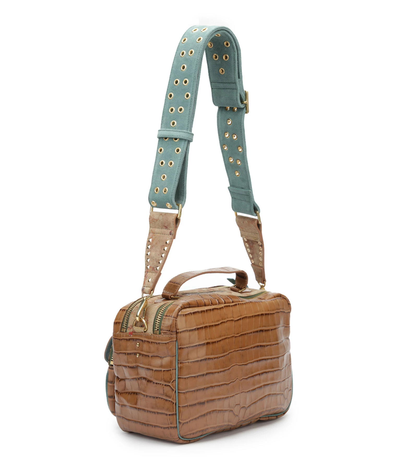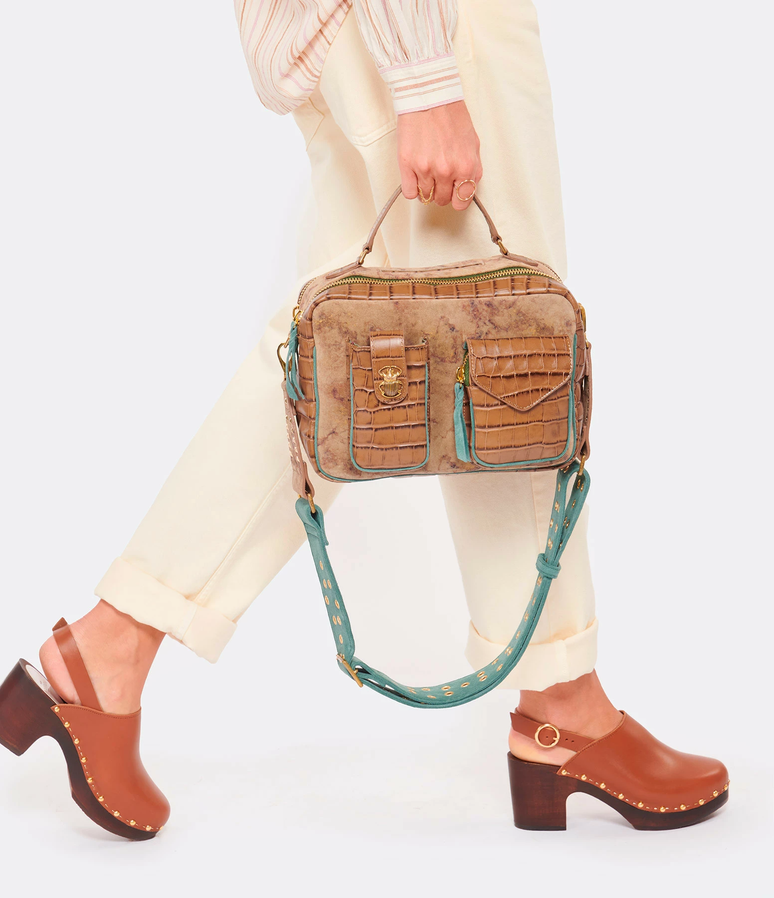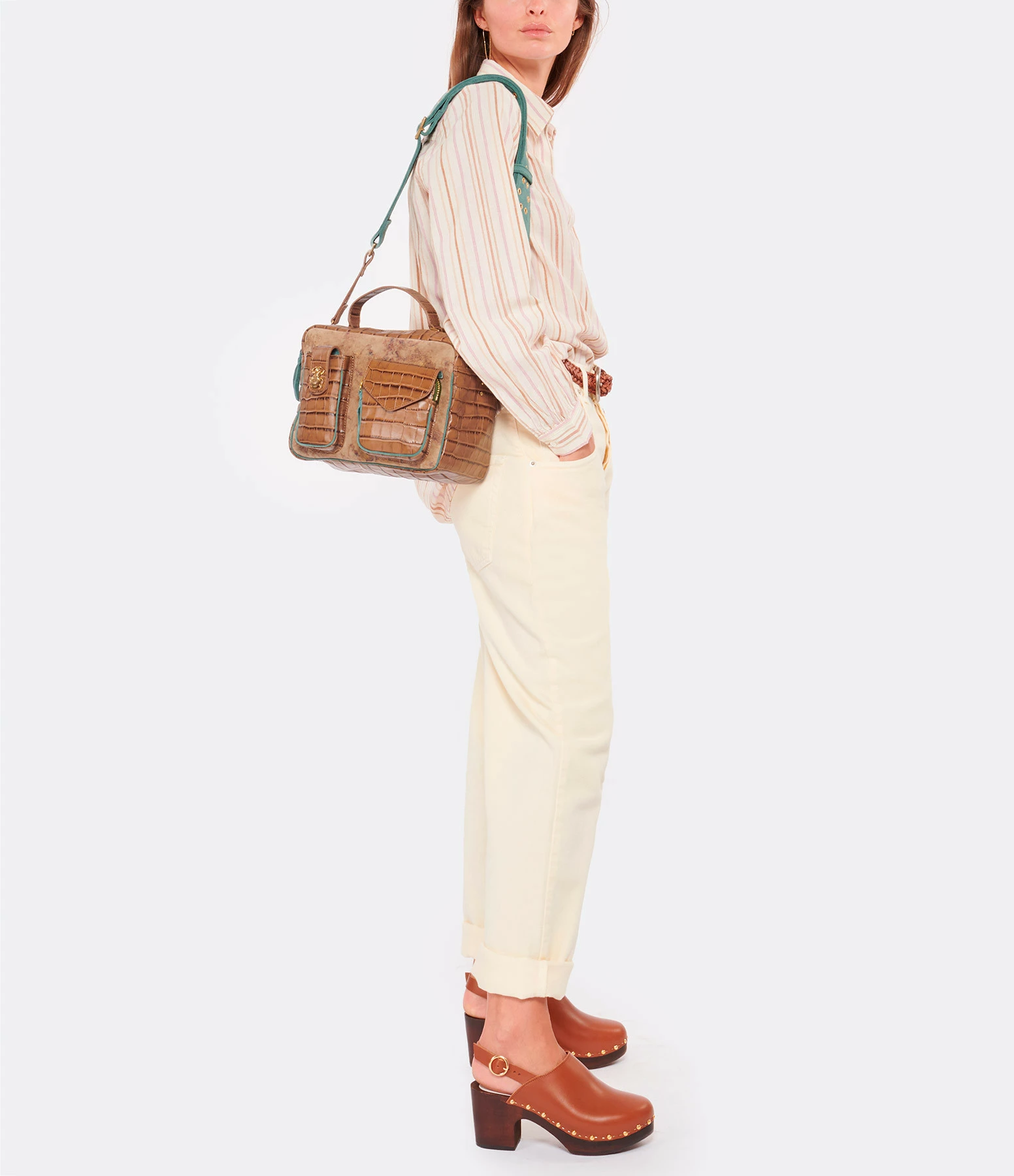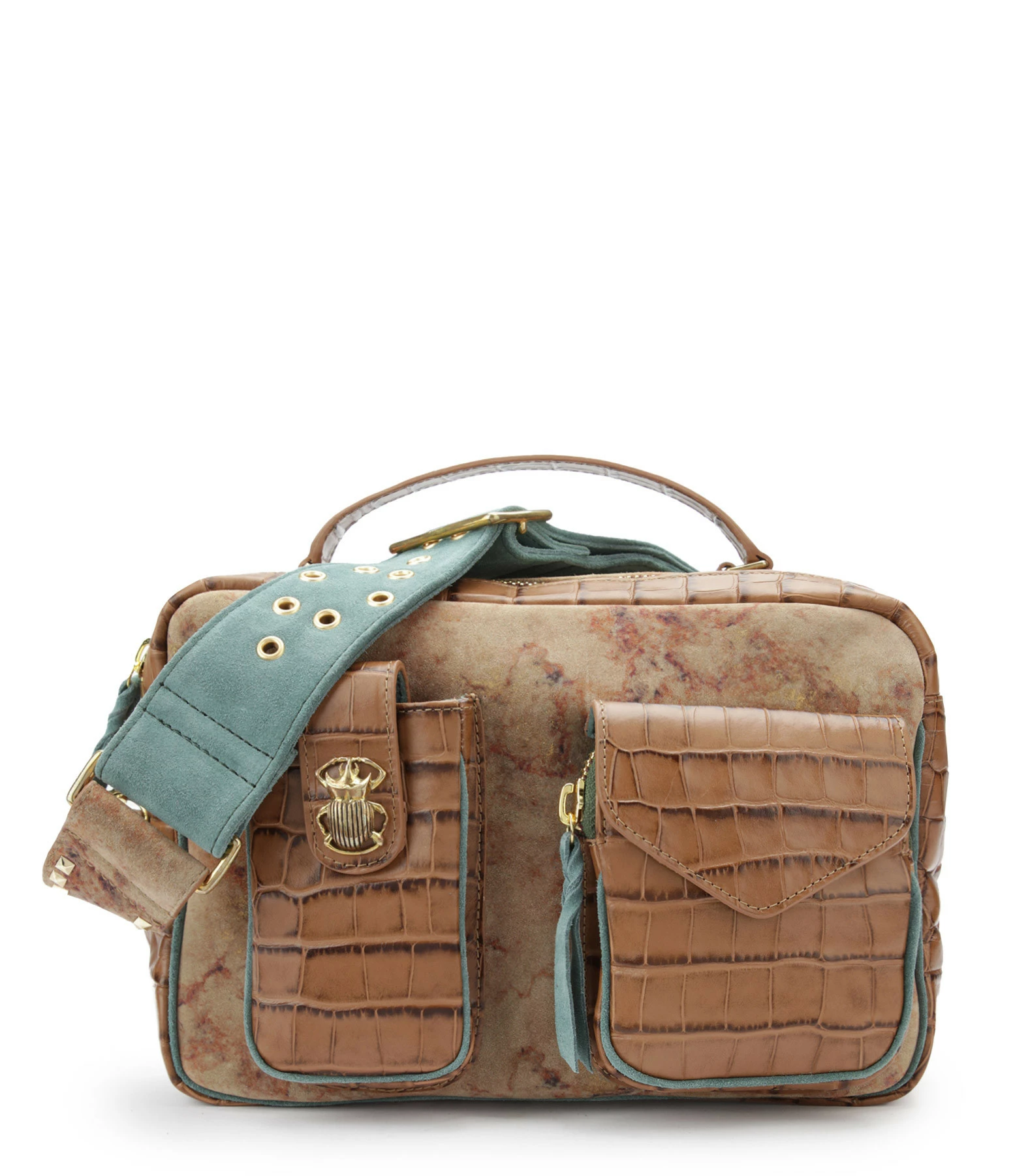 Sac en cuir embossé marron et cuir suédé vert pour femme. Grand format. Bandoulière amovible en cuir suédé vert avec crochets. Poignet pour un porté main. Deux grands compartiments fermés par des zips. Une poche passepoilée entre les deux compartiments. Poche intérieure zippée. Deux poches sur le devant avec un détails scarabée. Intérieur doublé en coton.