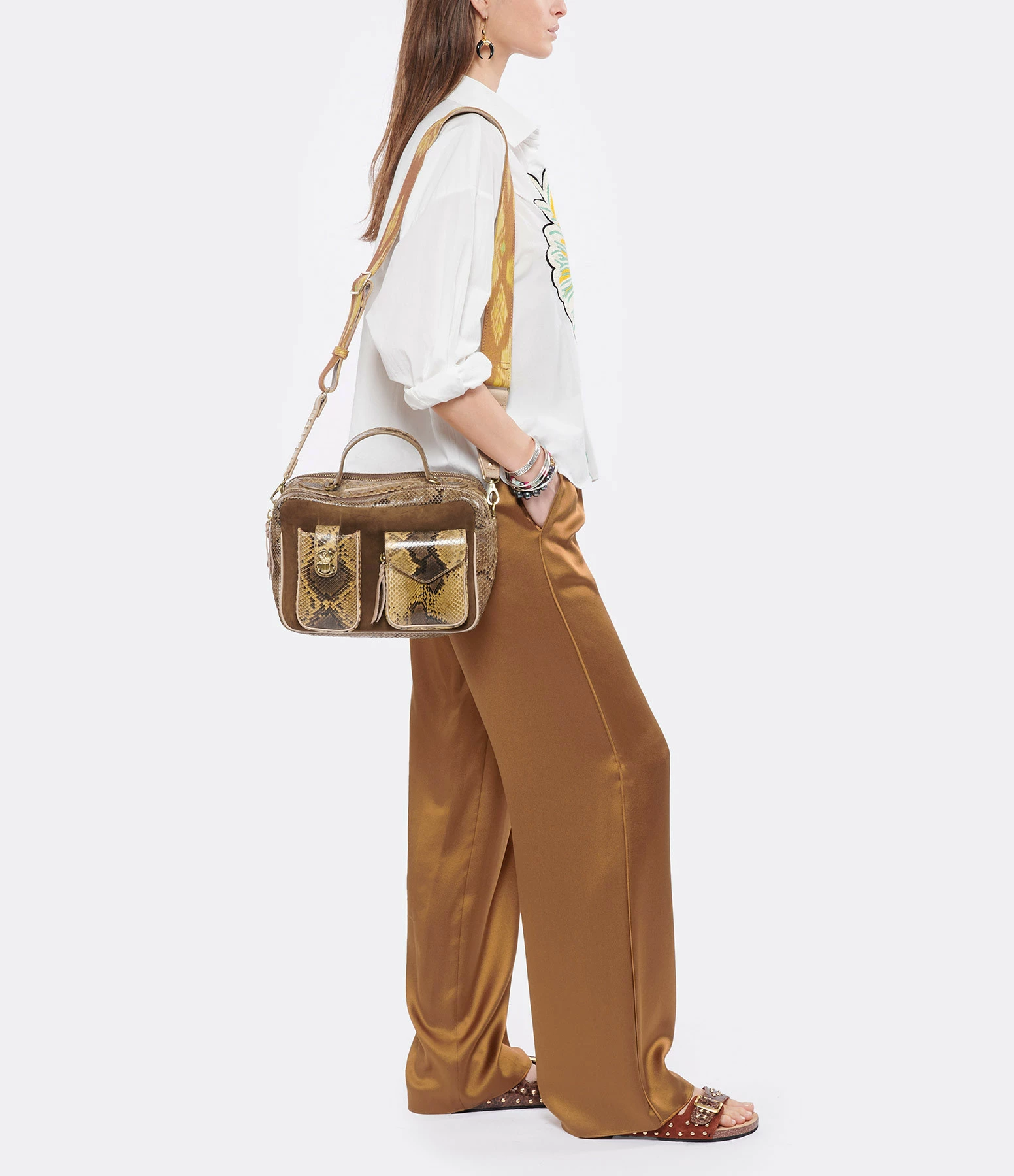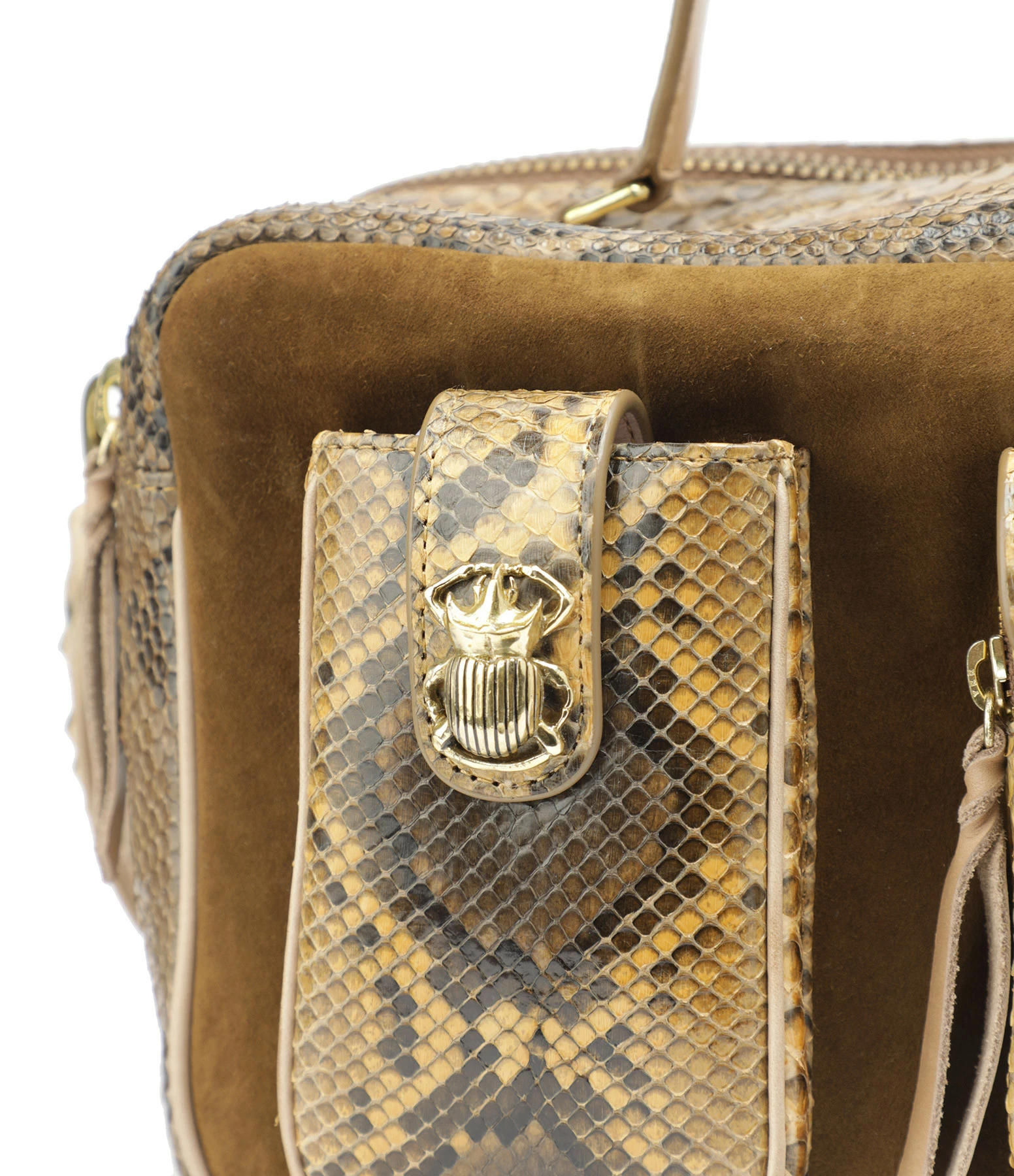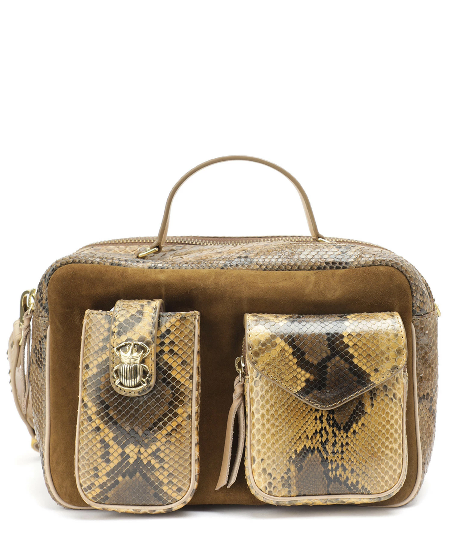 Sac python et cuir suédé marron pour femme. Grand format. Bandoulière amovible tissée à la main et doublée en cuir avec crochets. Poignet pour un porté main. Deux grands compartiments fermés par des zips. Une poche passepoilée entre les deux compartiments. Poche intérieure fermée par un zip. Deux poches sur le devant avec un détail scarabée. Intérieur doublé en coton.