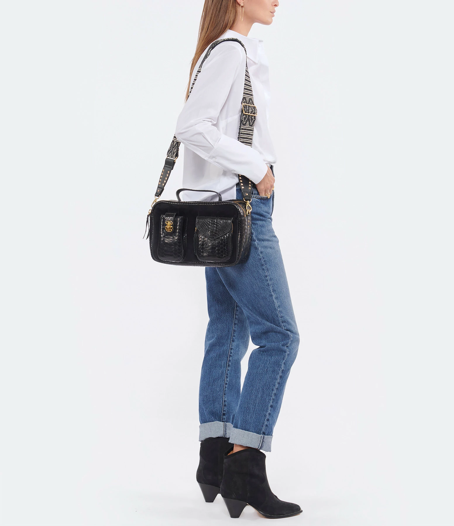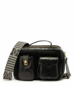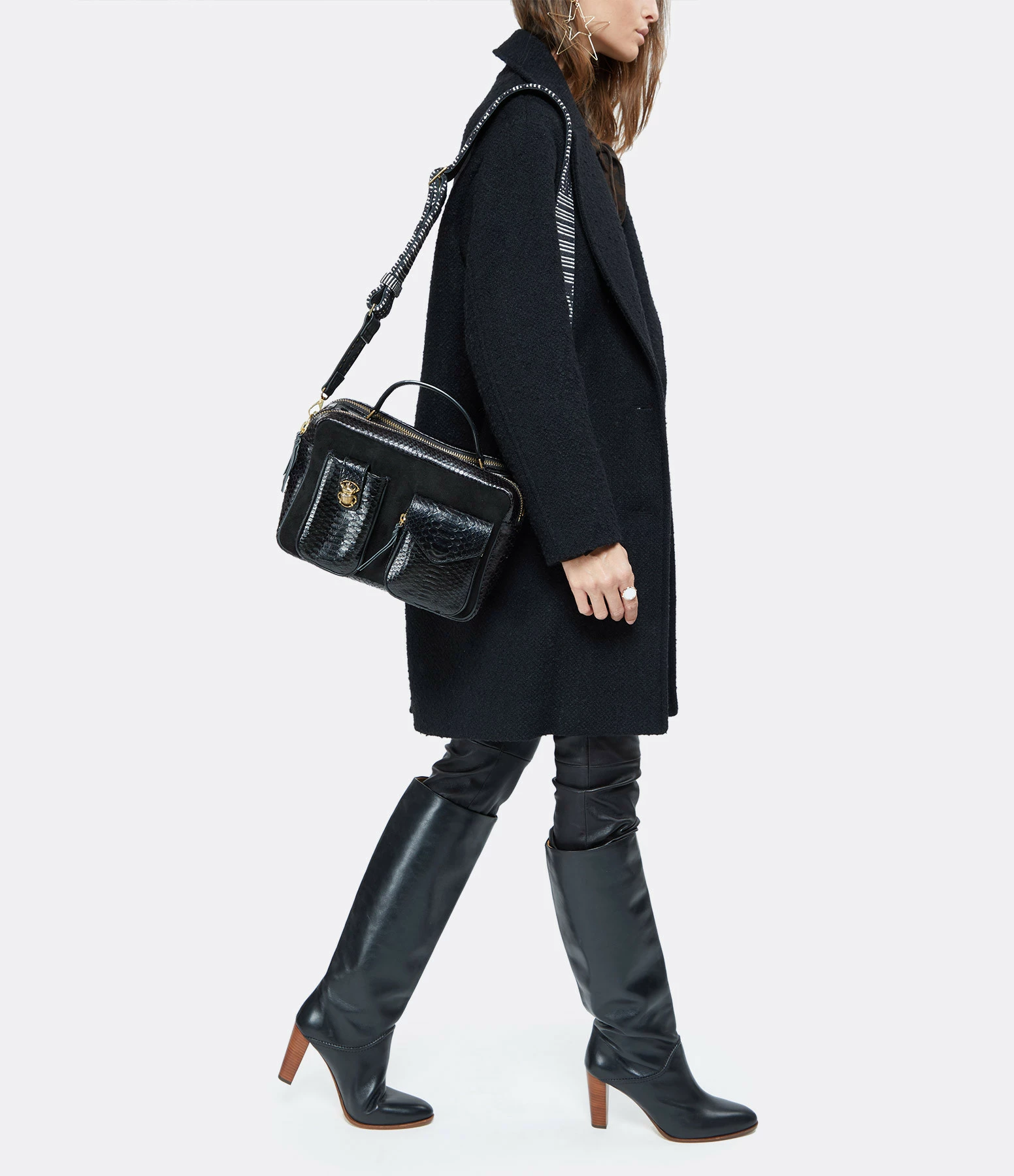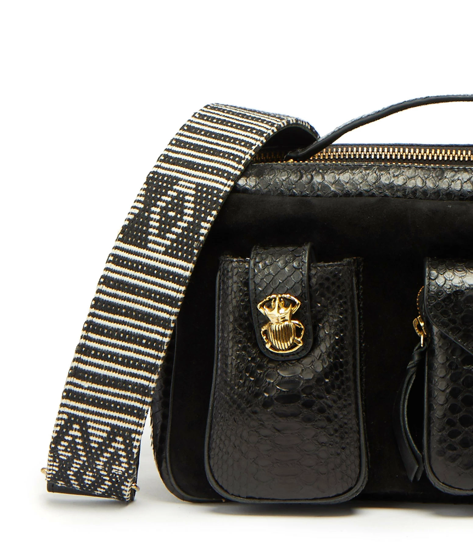 Sac en python et cuir suédé noir pour femme. Grand format. Bandoulière amovible tissée à la main et doublée en cuir avec crochets. Poignet pour un porté main. Deux grands compartiments fermés par des zips. Une poche passepoilée entre les deux compartiments. Poche intérieure zippée. Deux poches sur le devant avec un détails scarabée. Intérieur doublé en coton.