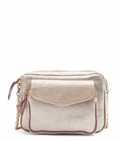 Sac en cuir platine pour femme. Deux compartiments. Fermeture zippée et poche avant aimantée à rabat. Poche intérieure. Chaîne bandoulière à gros maillons. Intérieur doublé en coton.