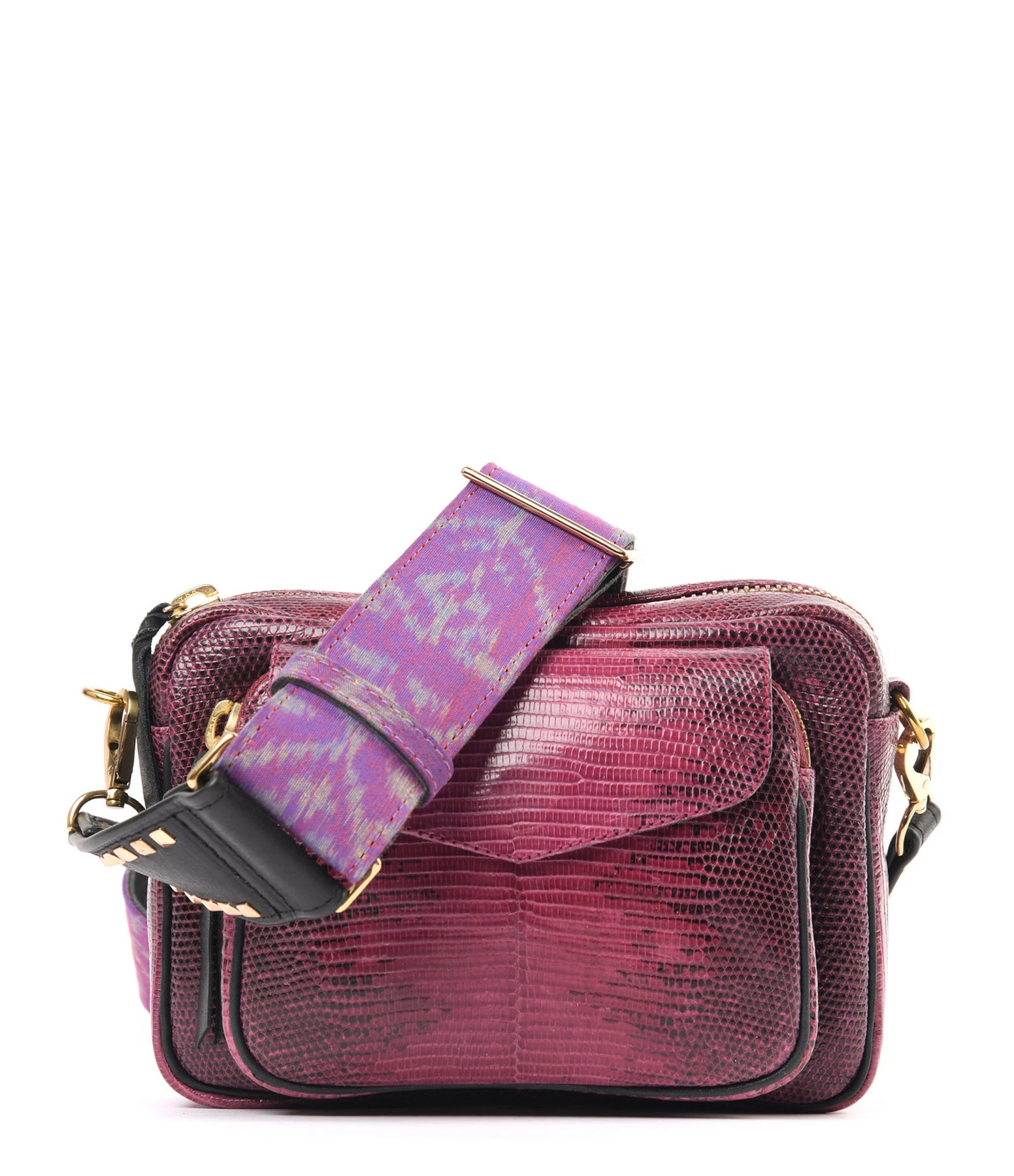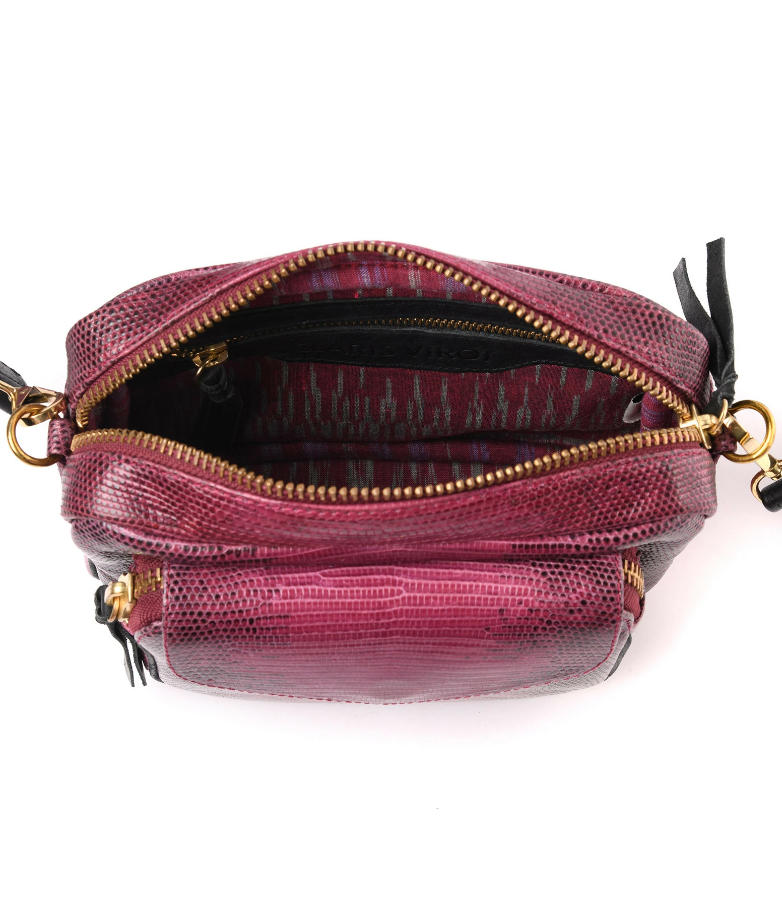 Sac en lézard violet pour femme. Deux compartiments. Fermeture zippée et poche avant aimantée à rabat. Poche intérieure. Bandoulière réglable et amovible tissée à la main avec crochets, doublée en cuir. Intérieur doublé en coton.