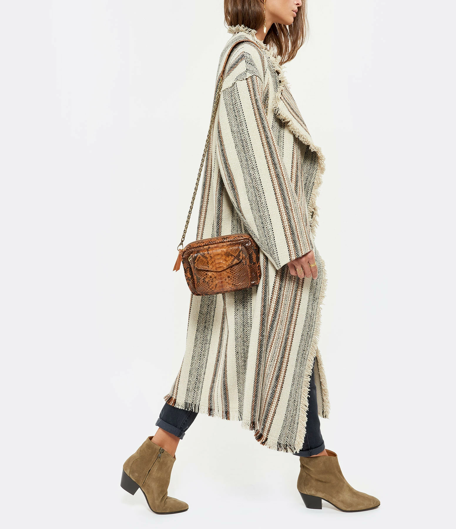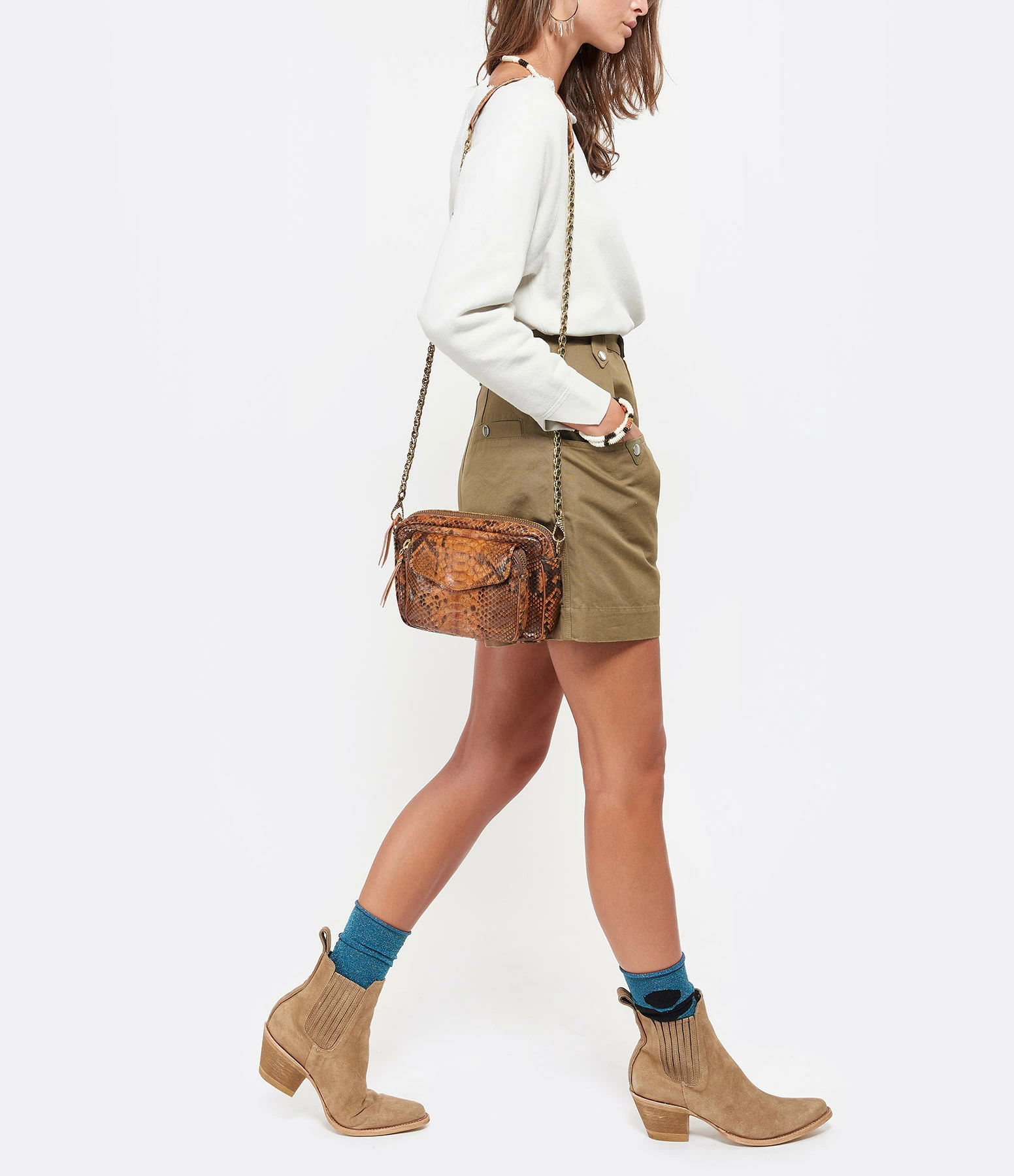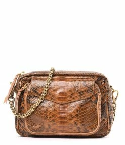 Sac en python marron pour femme. Deux compartiments. Fermeture zippée et poche avant aimantée à rabat. Poche intérieure. Chaîne bandoulière à gros maillons. Intérieur doublé en coton.