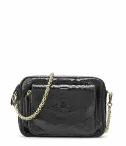 Sac en python noir pour femme. Deux compartiments. Fermeture zippée et poche avant aimantée à rabat. Poche intérieure. Chaîne bandoulière à gros maillons. Intérieur doublé en coton.