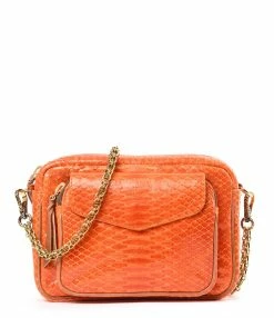 Sac en python orange pour femme. Deux compartiments. Fermeture zippée et poche avant aimantée à rabat. Poche intérieure. Chaîne bandoulière à gros maillons. Intérieur doublé en coton.