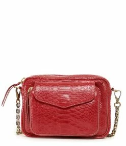 Sac en python rouge pour femme. Deux compartiments. Fermeture zippée et poche avant aimantée à rabat. Poche intérieure. Chaîne bandoulière à gros maillons. Intérieur doublé en coton.