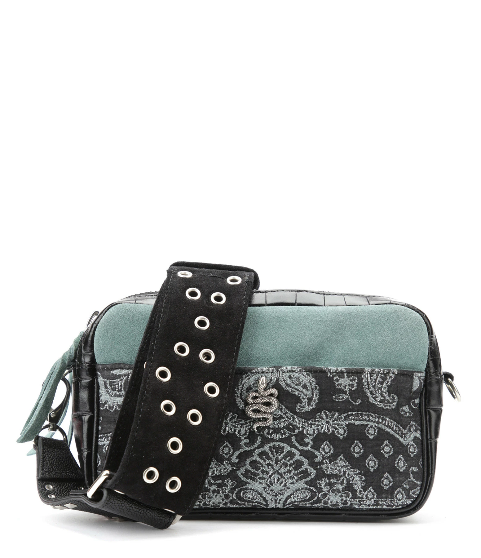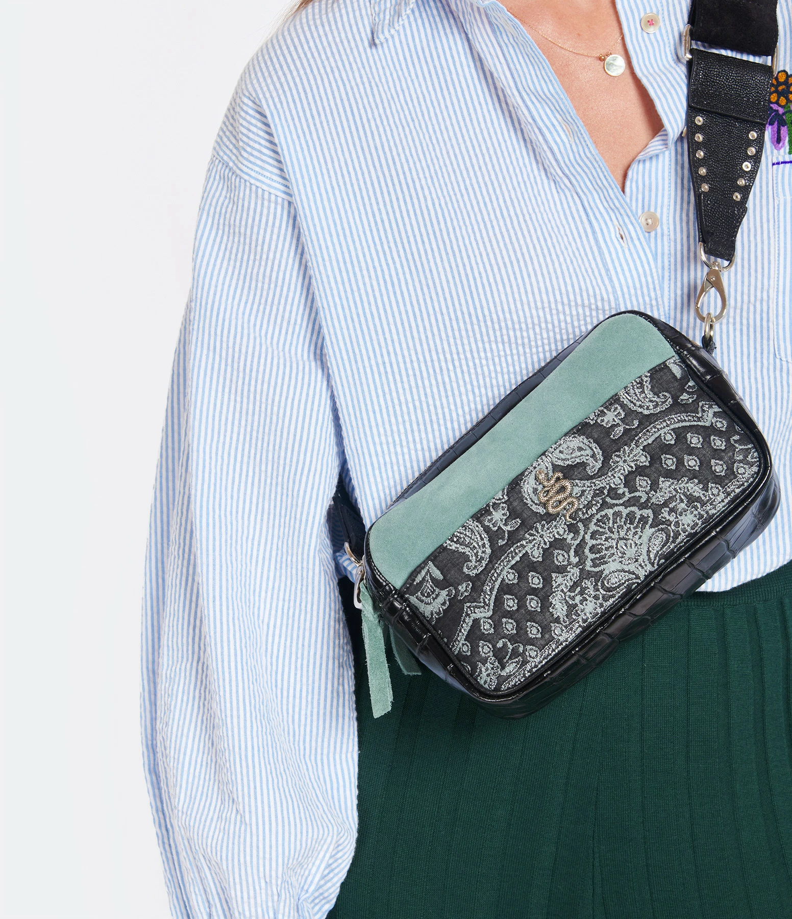 Sac bandoulière en cuir et cuir velours sable et cuir pony léopard. Bijoux tortue doré sur l’avant. Deux compartiments dont une poche centrale. Fermeture zippée et poche avant aimantée. Bandoulière en daim marron amovible et réglable. Intérieur doublé en coton.