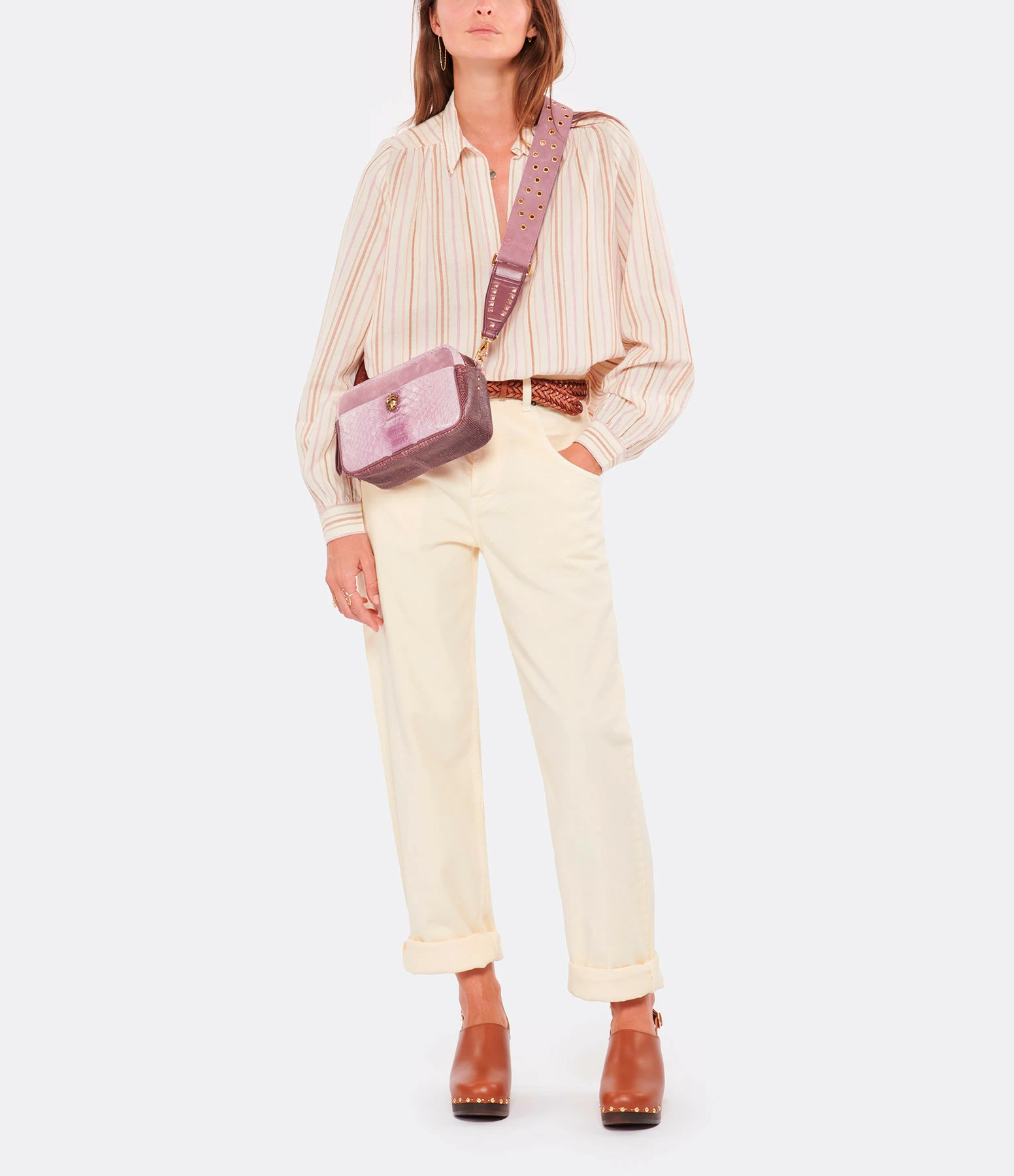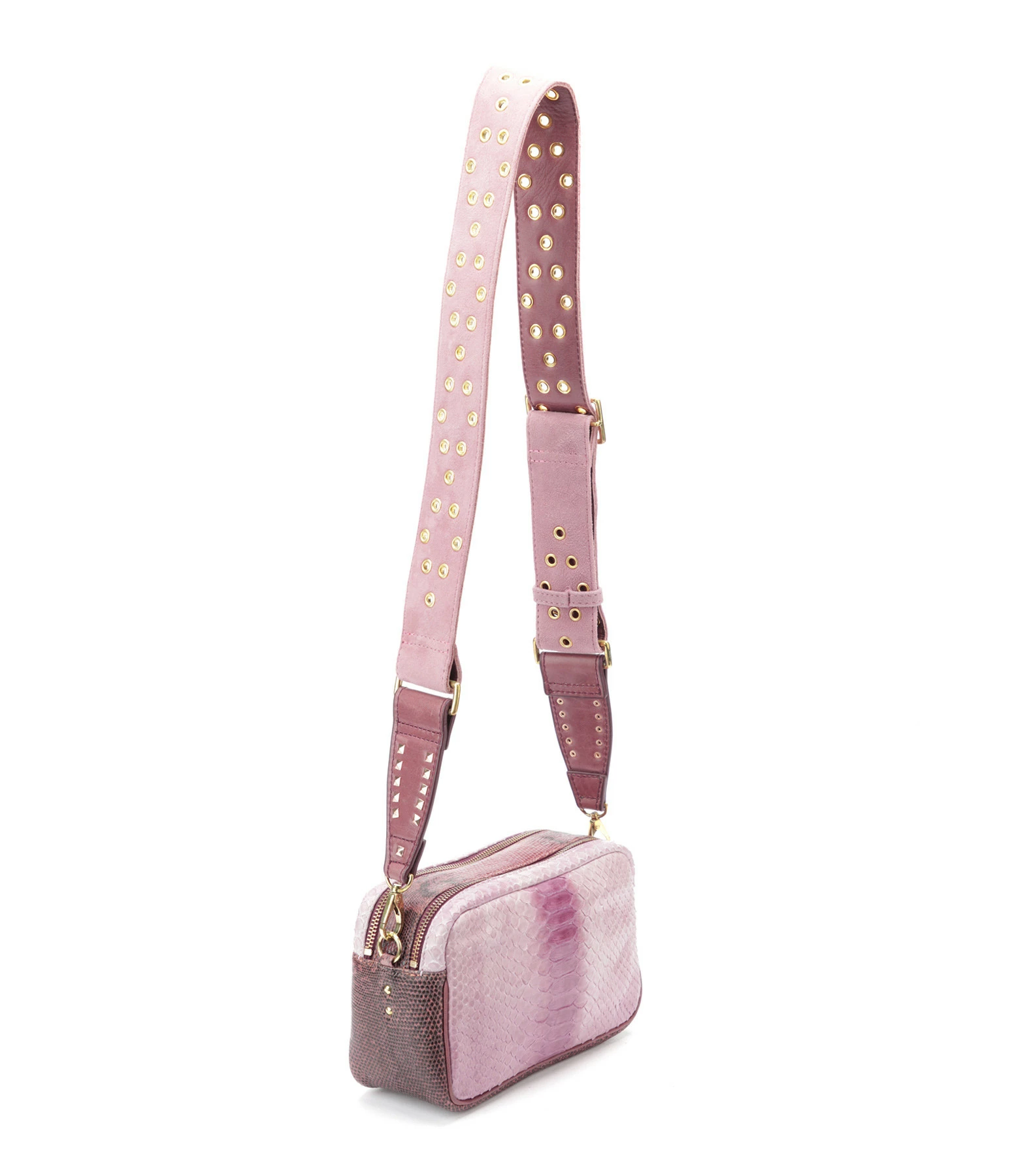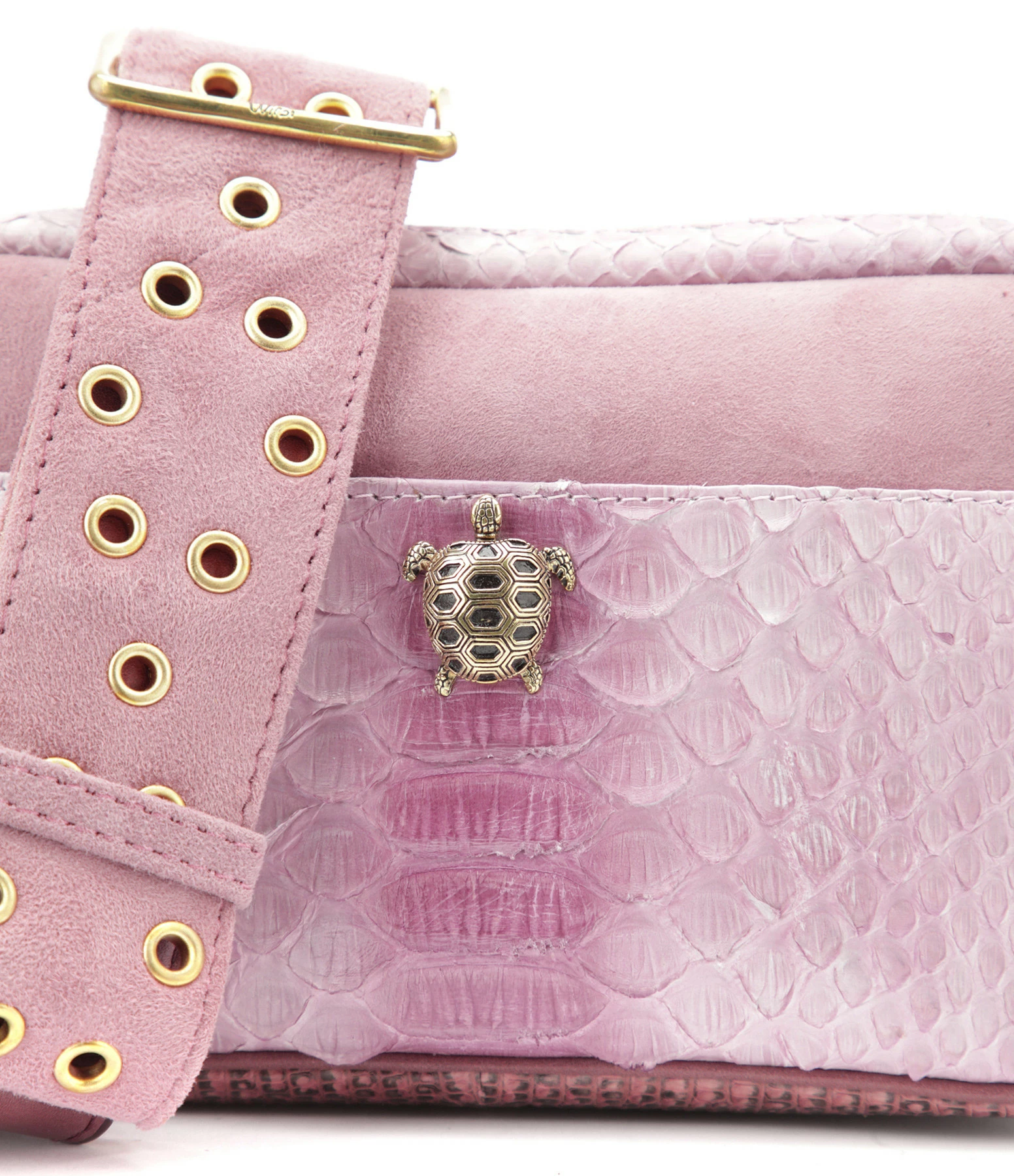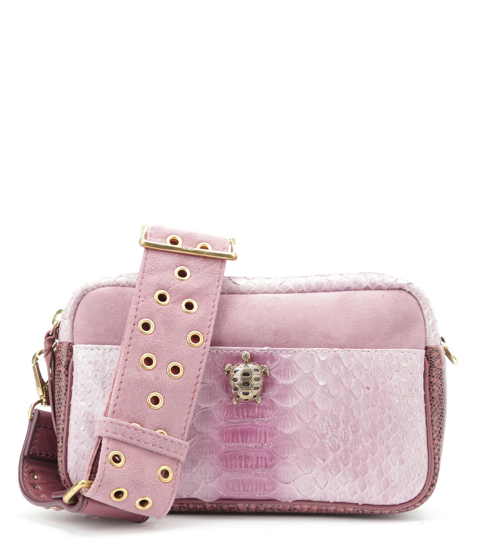 Sac bandoulière en python et cuir suédé rose pour femme. Bijoux tortue doré. Deux compartiments. Fermeture zippée. Poche avant aimantée. Poche intérieure. Bandoulière amovible avec crochets et réglable en plusieurs longueurs. Intérieur doublé en coton. Base plate.