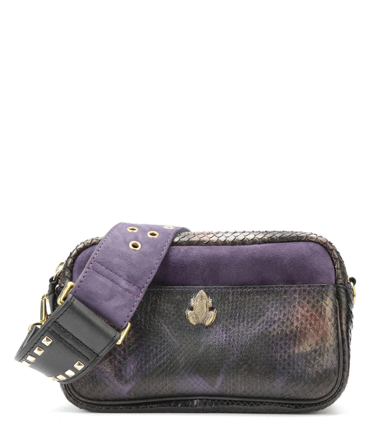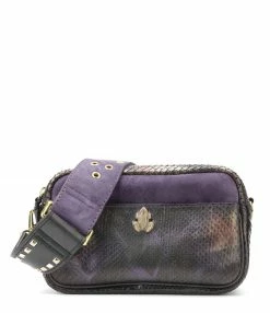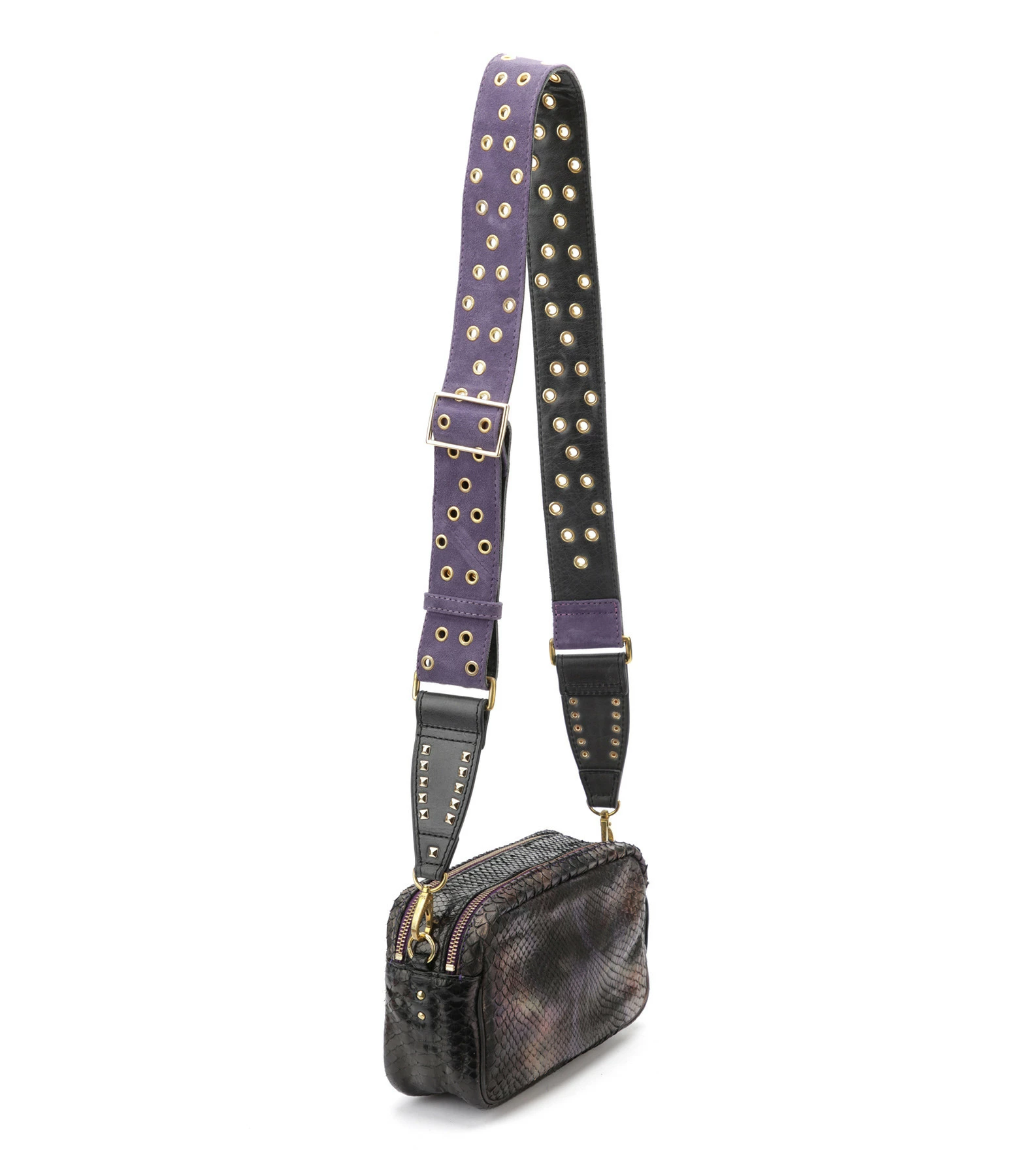 Sac bandoulière en python et cuir suédé noir pour femme. Détails scarabée. Deux compartiments. Fermeture zippée. Poche avant aimantée. Poche intérieure. Bandoulière amovible avec crochets et réglable en plusieurs longueurs. Intérieur doublé en coton. Base plate.