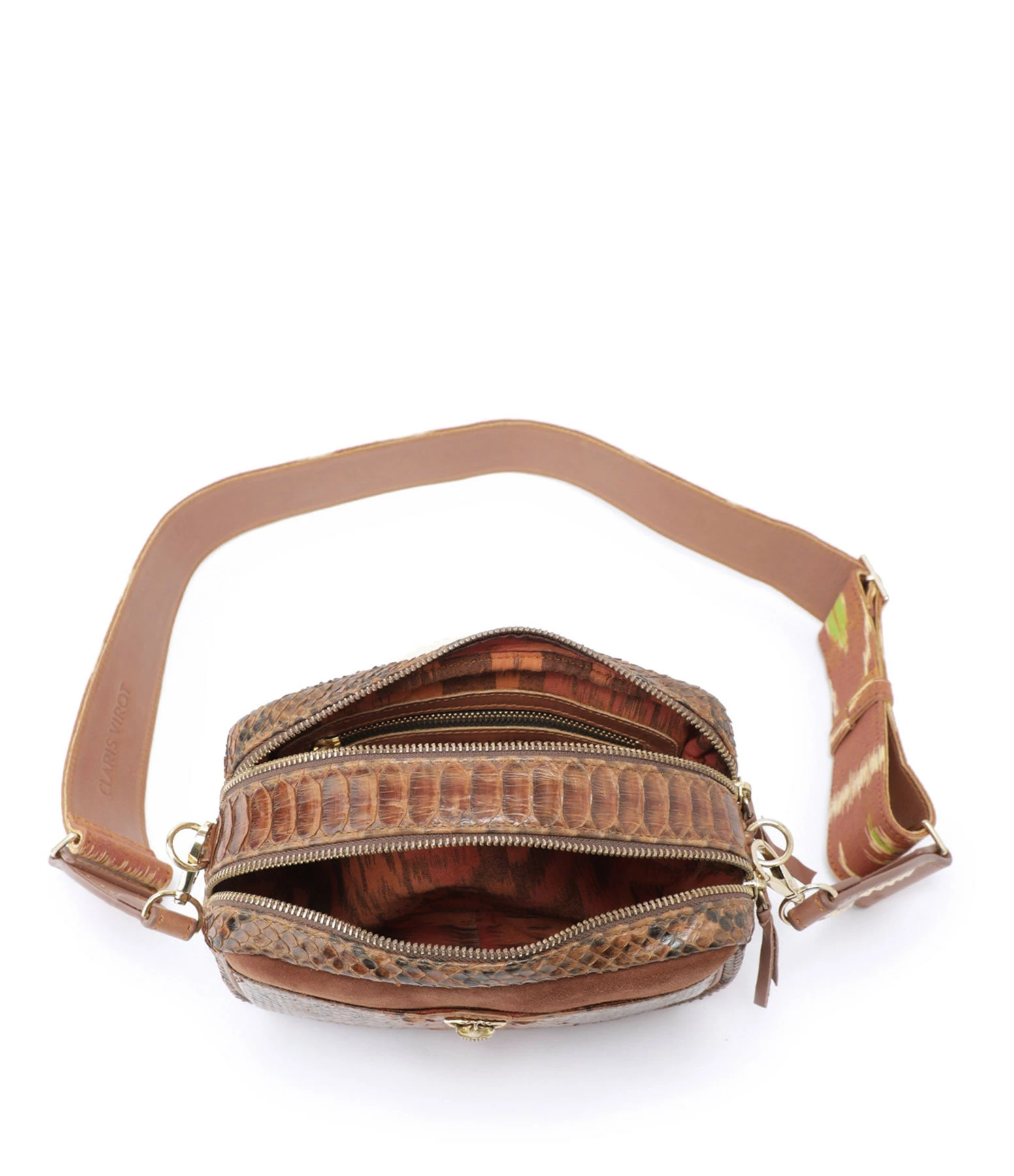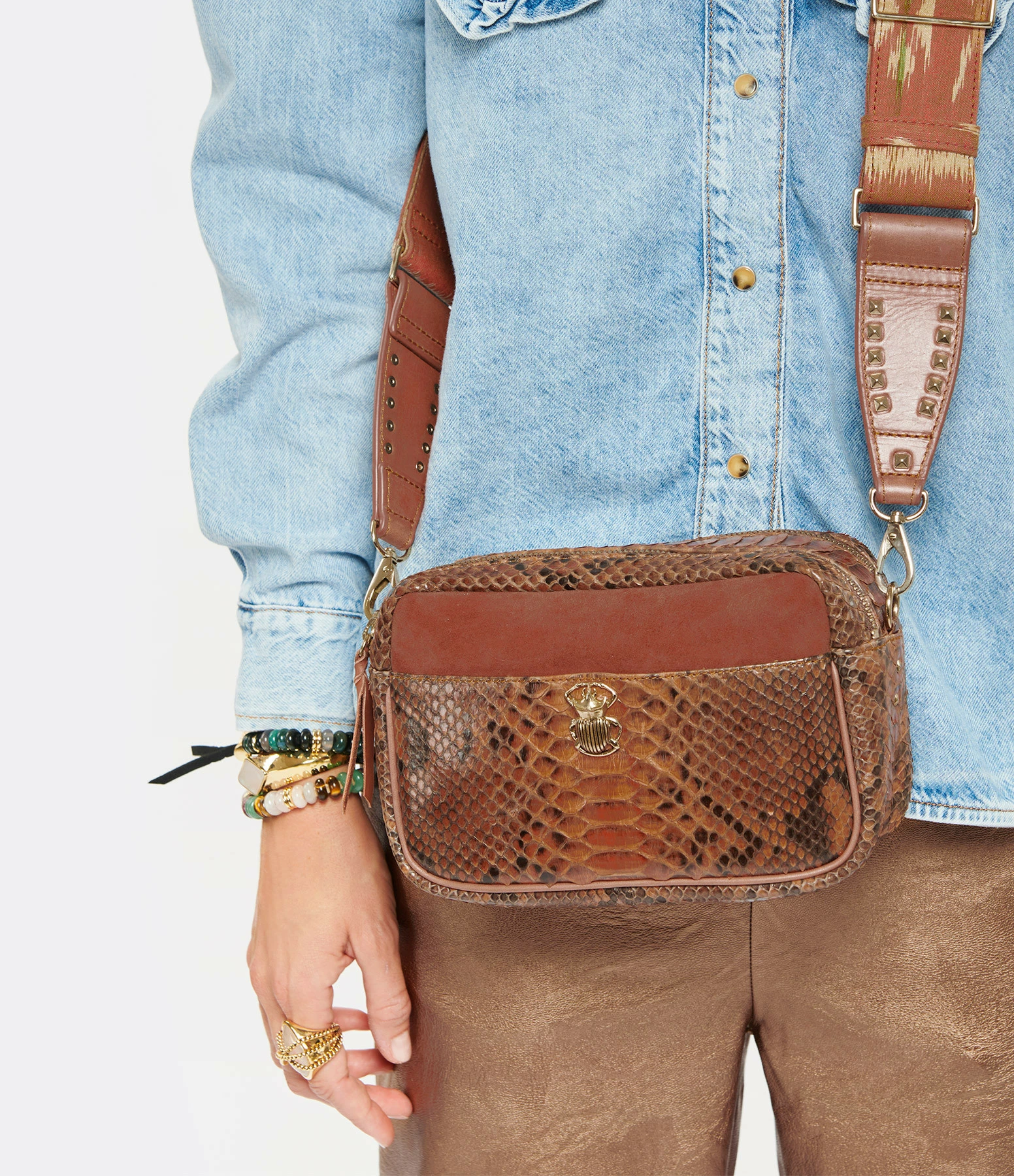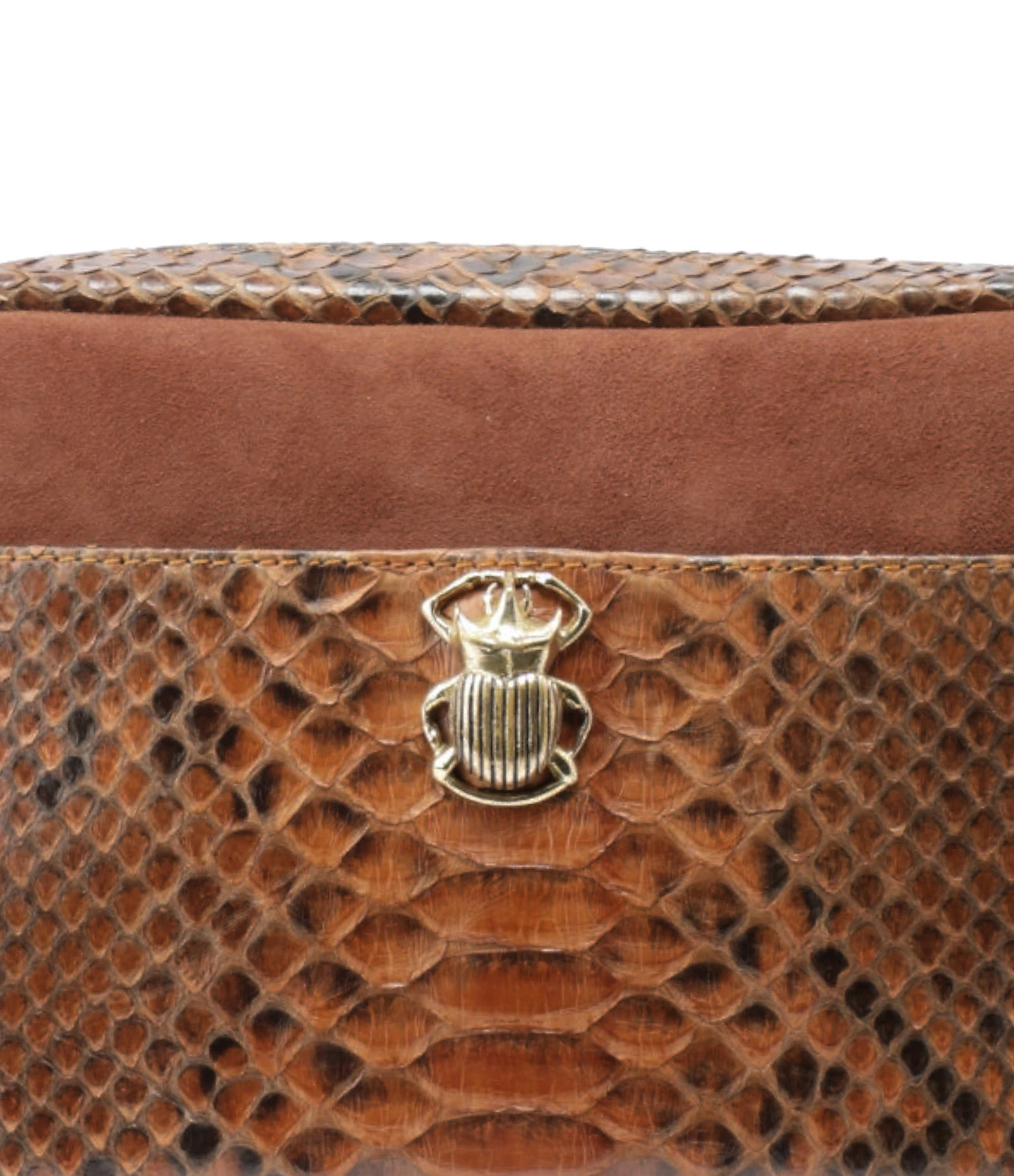 Sac bandoulière en python et cuir suédé orange et marron. Bijoux doré sur l’avant. Deux compartiments dont une poche centrale. Fermeture zippée et poche avant aimantée à rabat. Bandoulière orange cloutée amovible et réglable. Intérieur doublé en coton.