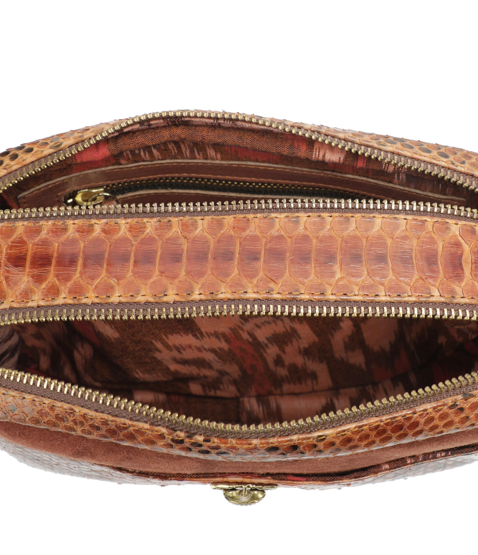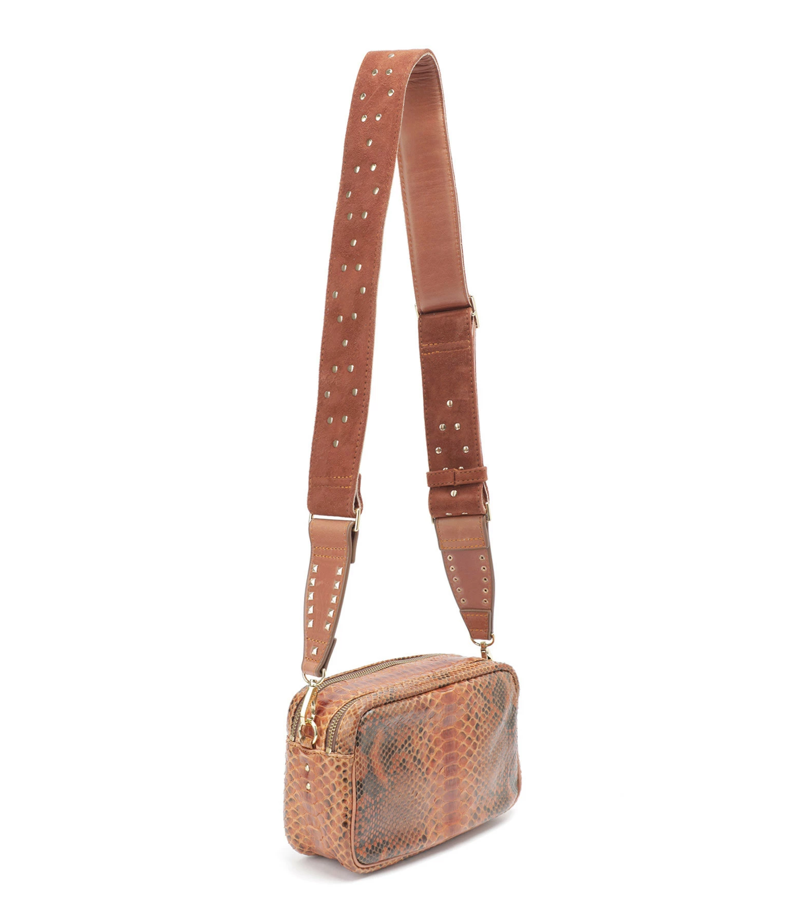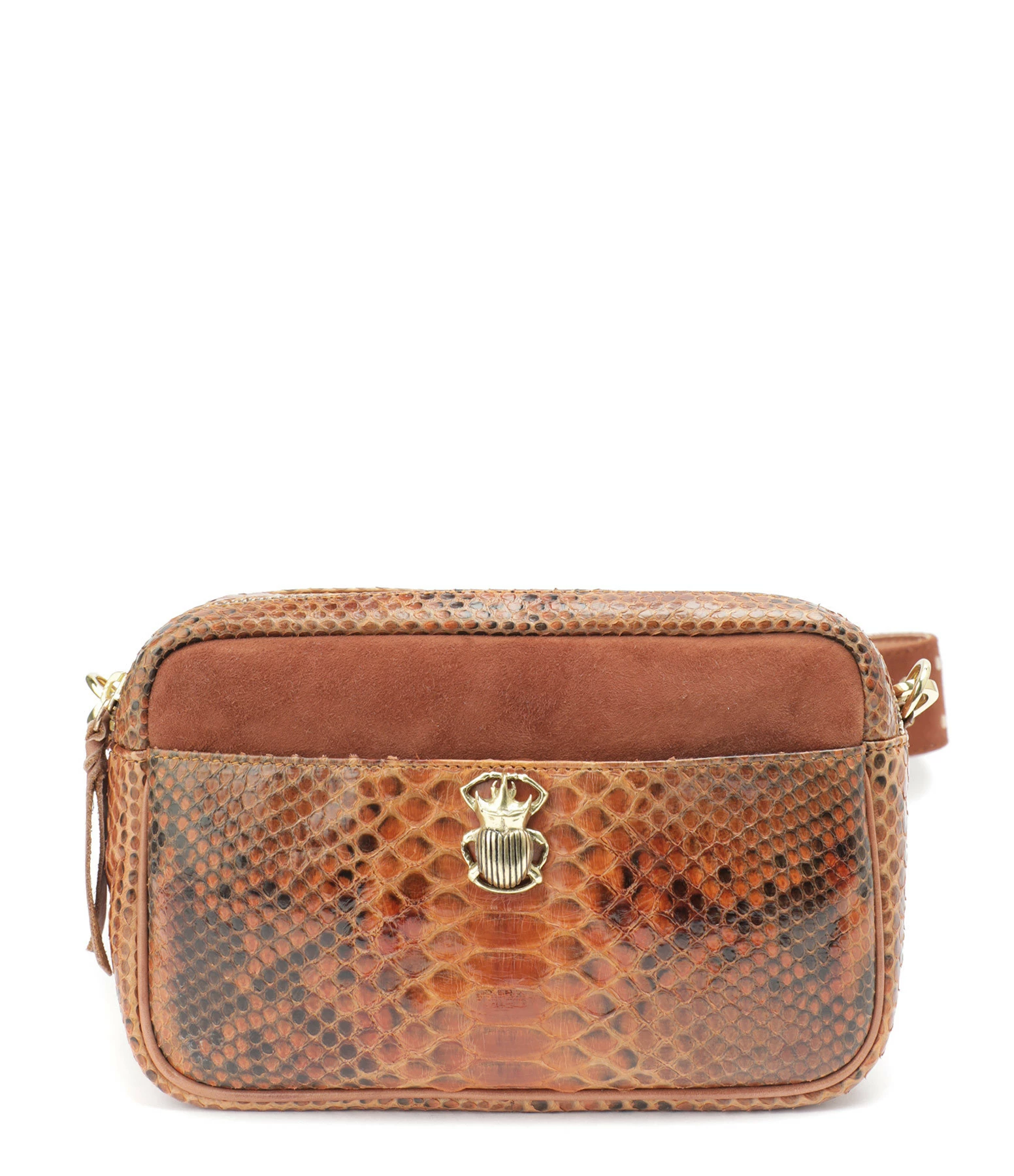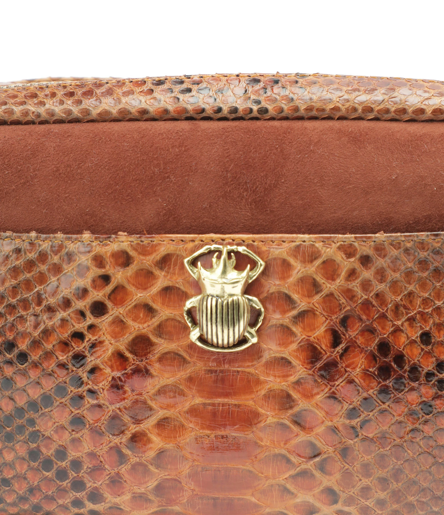 Sac bandoulière en python et cuir suédé marron pour femme. Détail scarabée doré. Deux compartiments. Fermeture zippée. Poche avant aimantée. Poche intérieure. Bandoulière amovible avec crochets et réglable en plusieurs longueurs. Intérieur doublé en coton. Base plate.