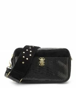 Sac bandoulière en python et cuir suédé noir pour femme. Détails scarabée. Deux compartiments. Fermeture zippée. Poche avant aimantée. Poche intérieure. Bandoulière amovible avec crochets et réglable en plusieurs longueurs. Intérieur doublé en coton. Base plate.