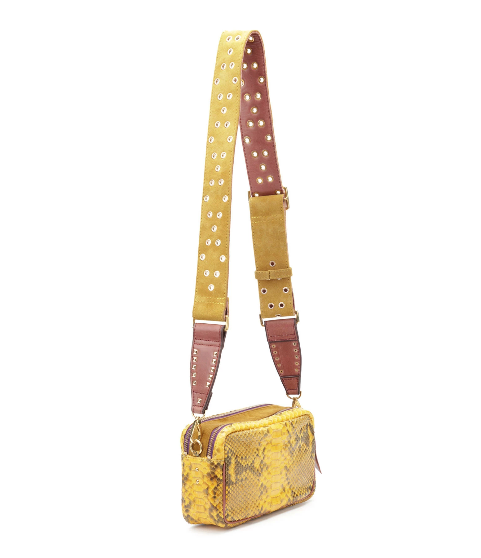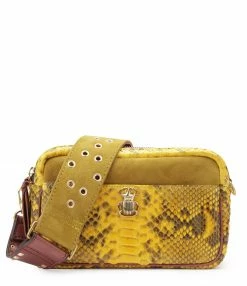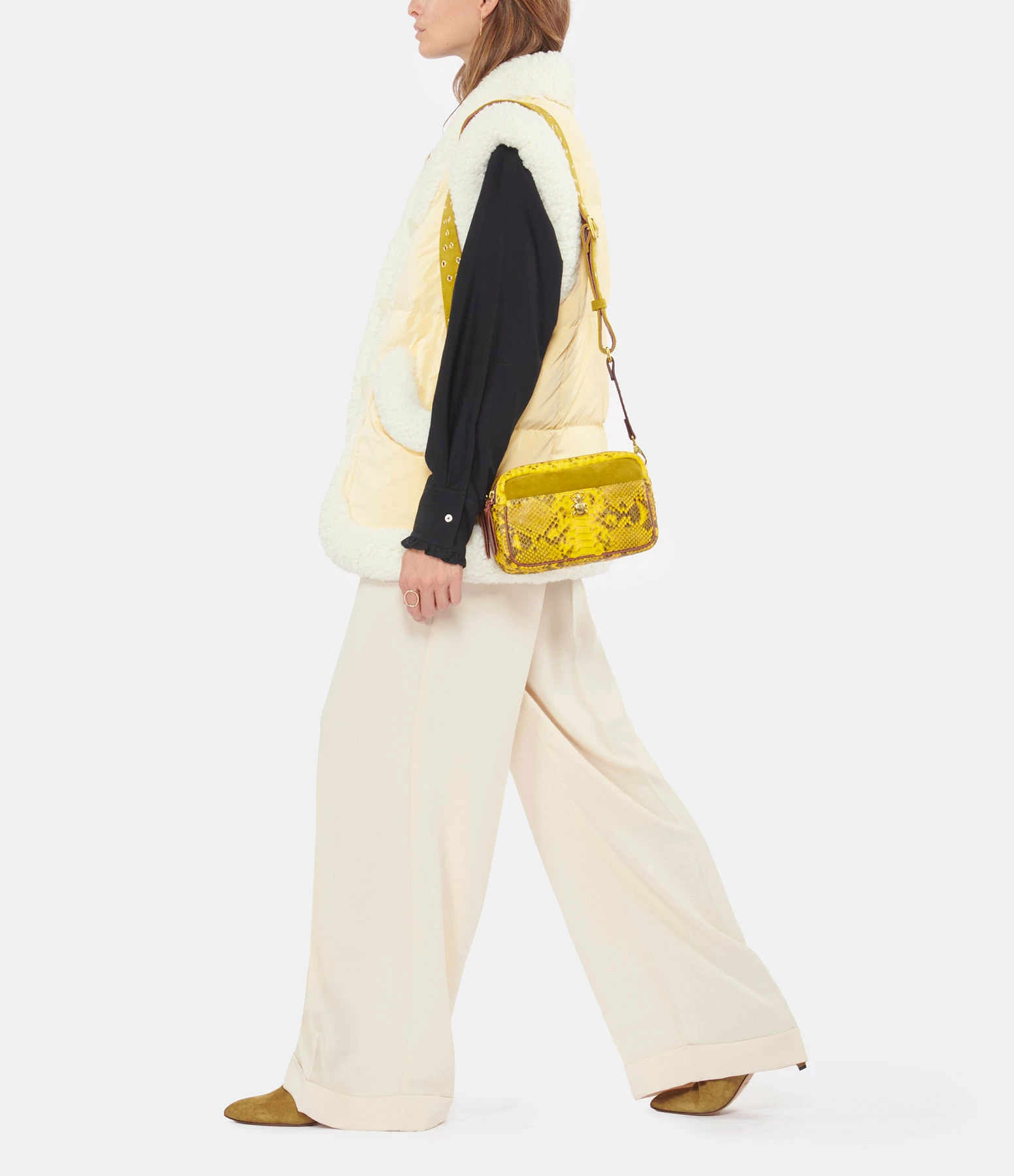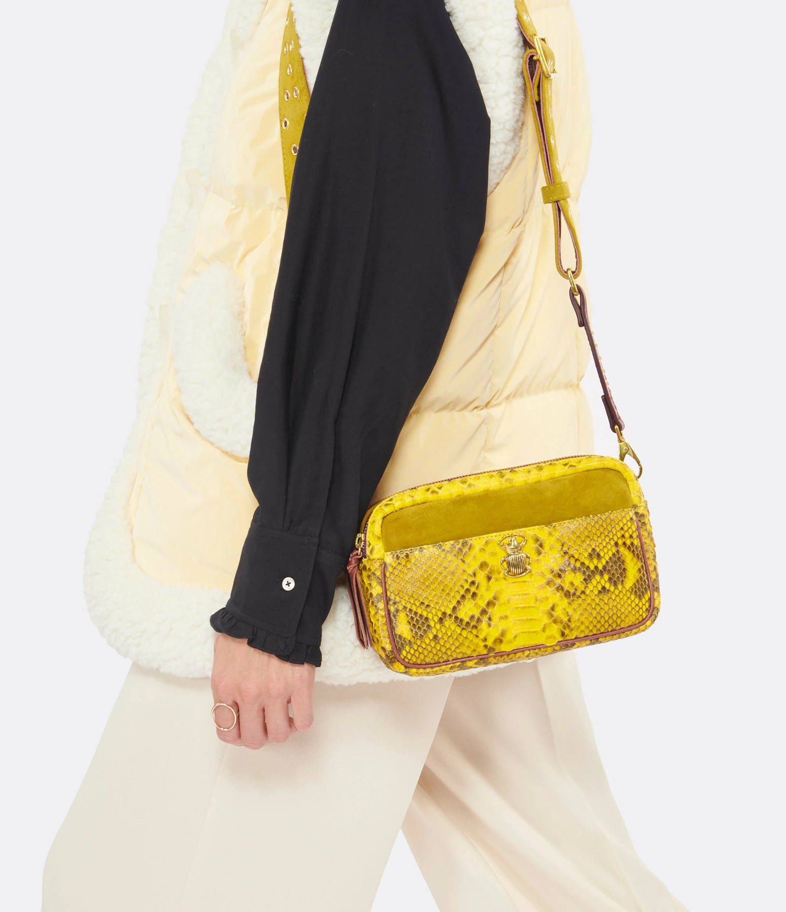 Sac bandoulière en python et cuir suédé jaune pour femme. Bijoux scarabée dorée. Deux compartiments. Fermetures zippées. Poche avant aimantée. Poche intérieure. Bandoulière amovible avec crochets et réglable en plusieurs longueurs. Intérieur doublé en coton. Base plate.