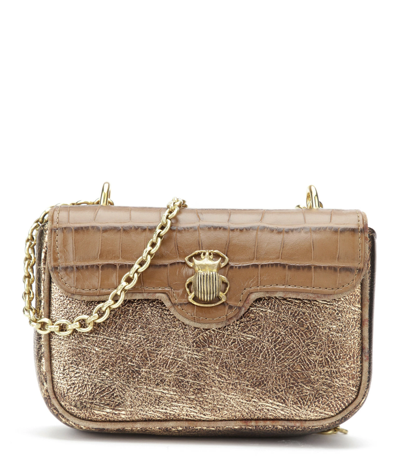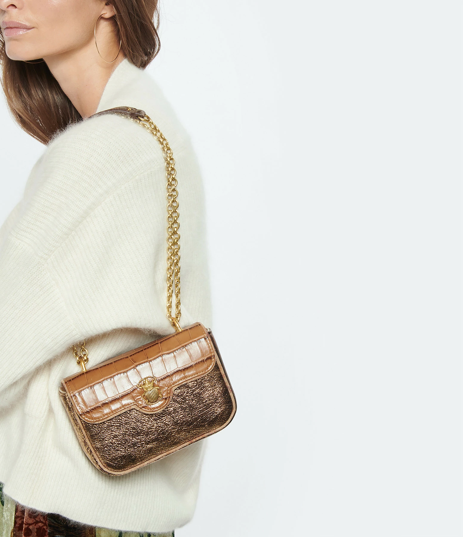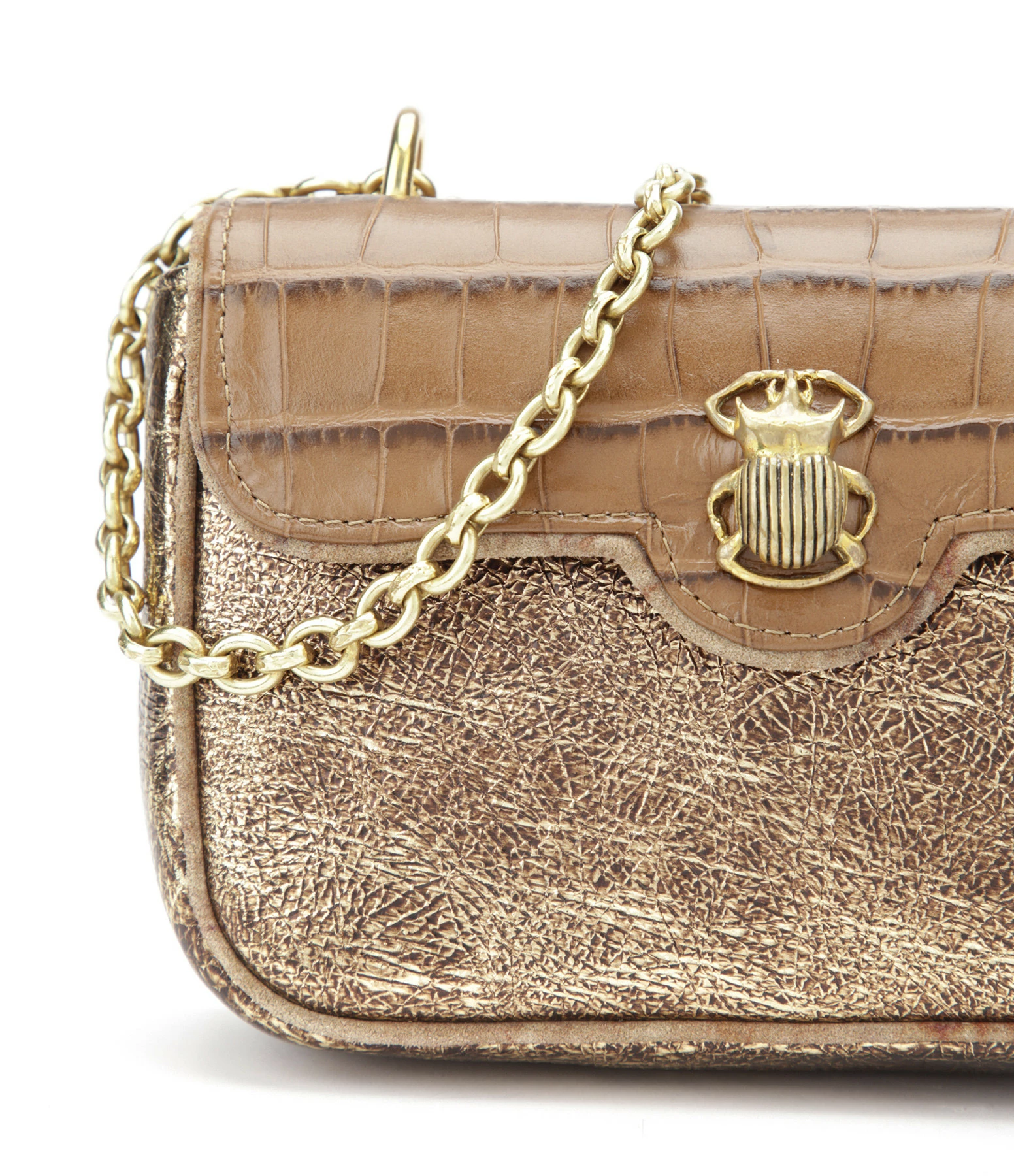 Sac bandoulière en cuir embossé marron et cuir mordoré. Chaîne bandoulière à gros maillons. Fermoir par rabat aimanté avec bijou scarabée doré. Intérieur doublé en cuir suédé avec trois porte-cartes.