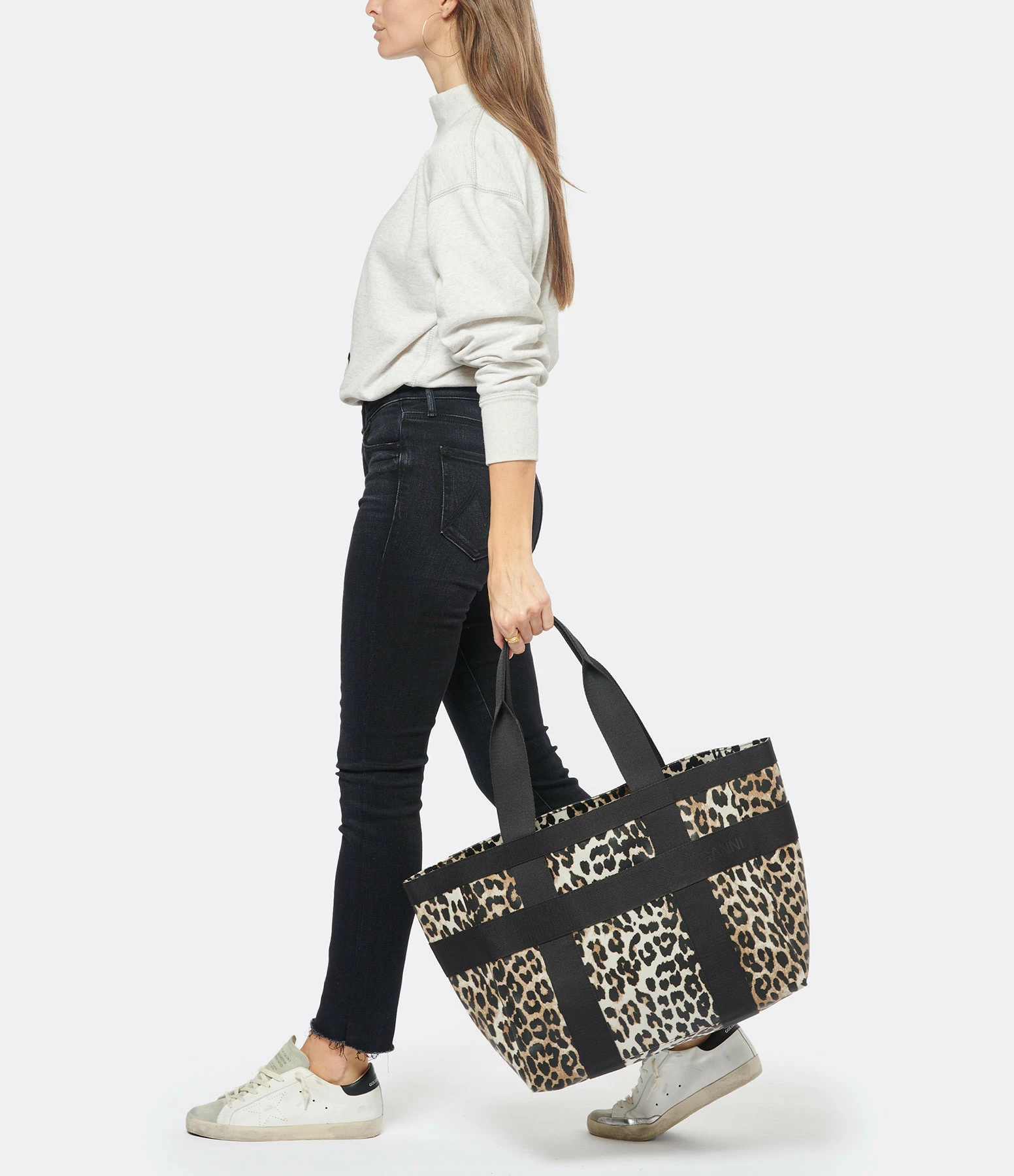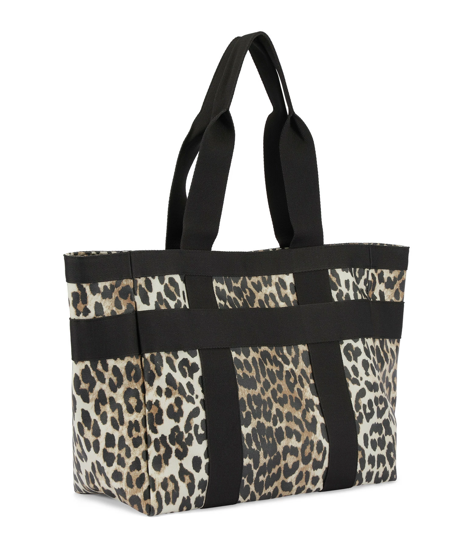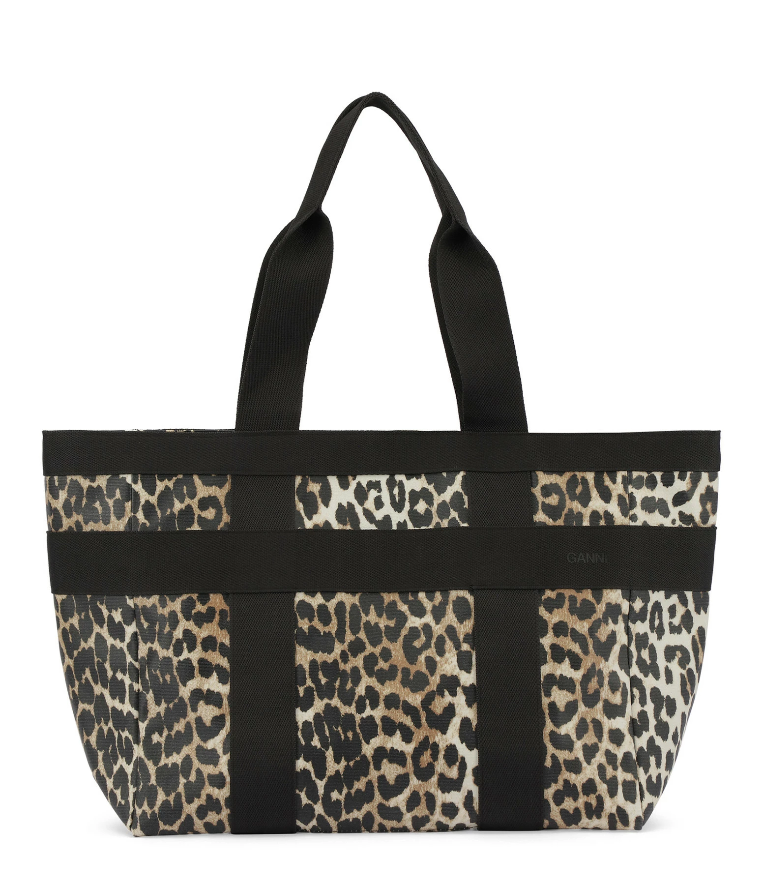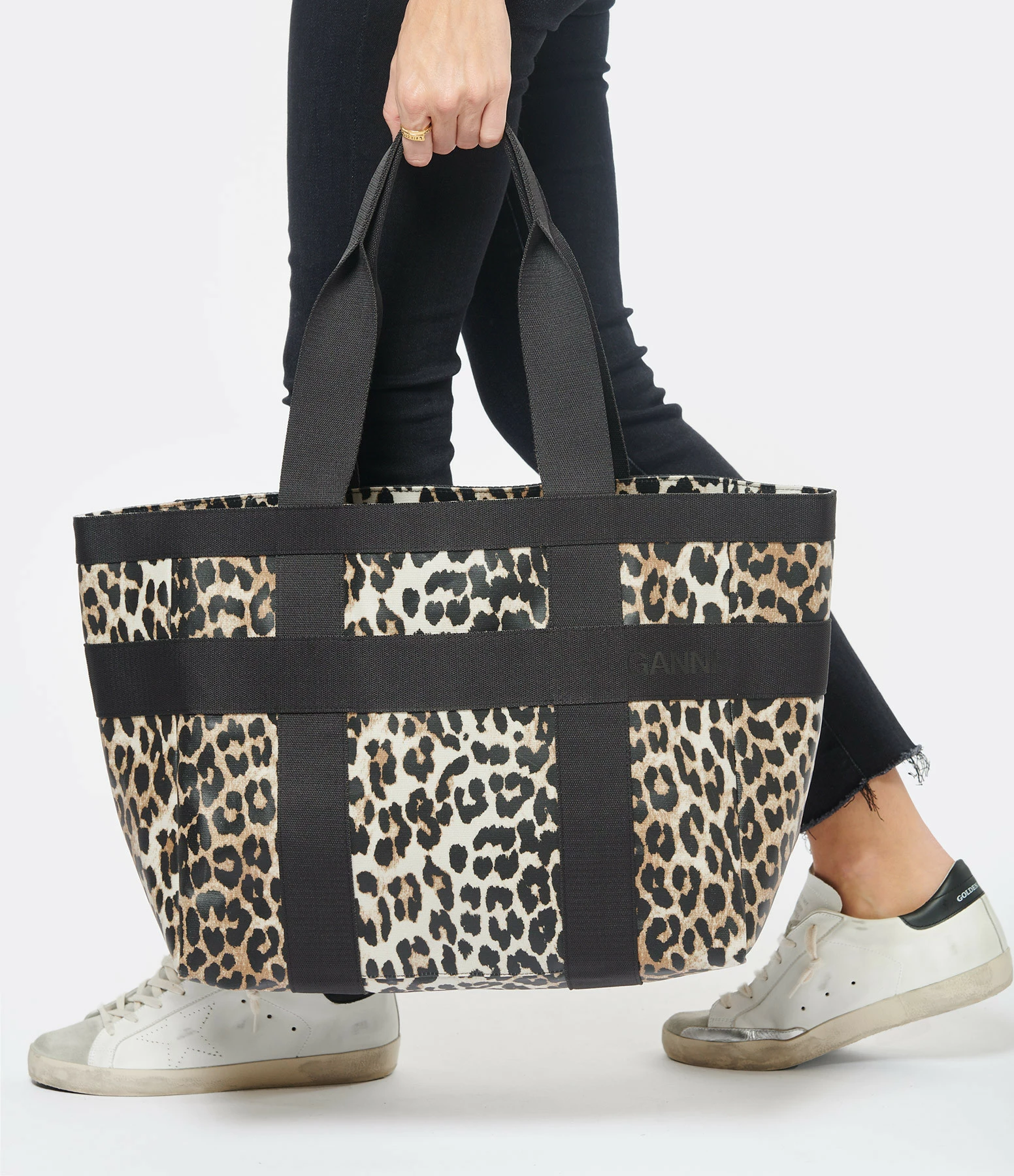 Sac cabas en toile enduite de coton à imprimé léopard. Deux anses. Logo GANNI sur le devant. Fermeture pressionnée. Intérieur doublé organisé en un compartiment avec une poche zippée et deux poches plaquées.
