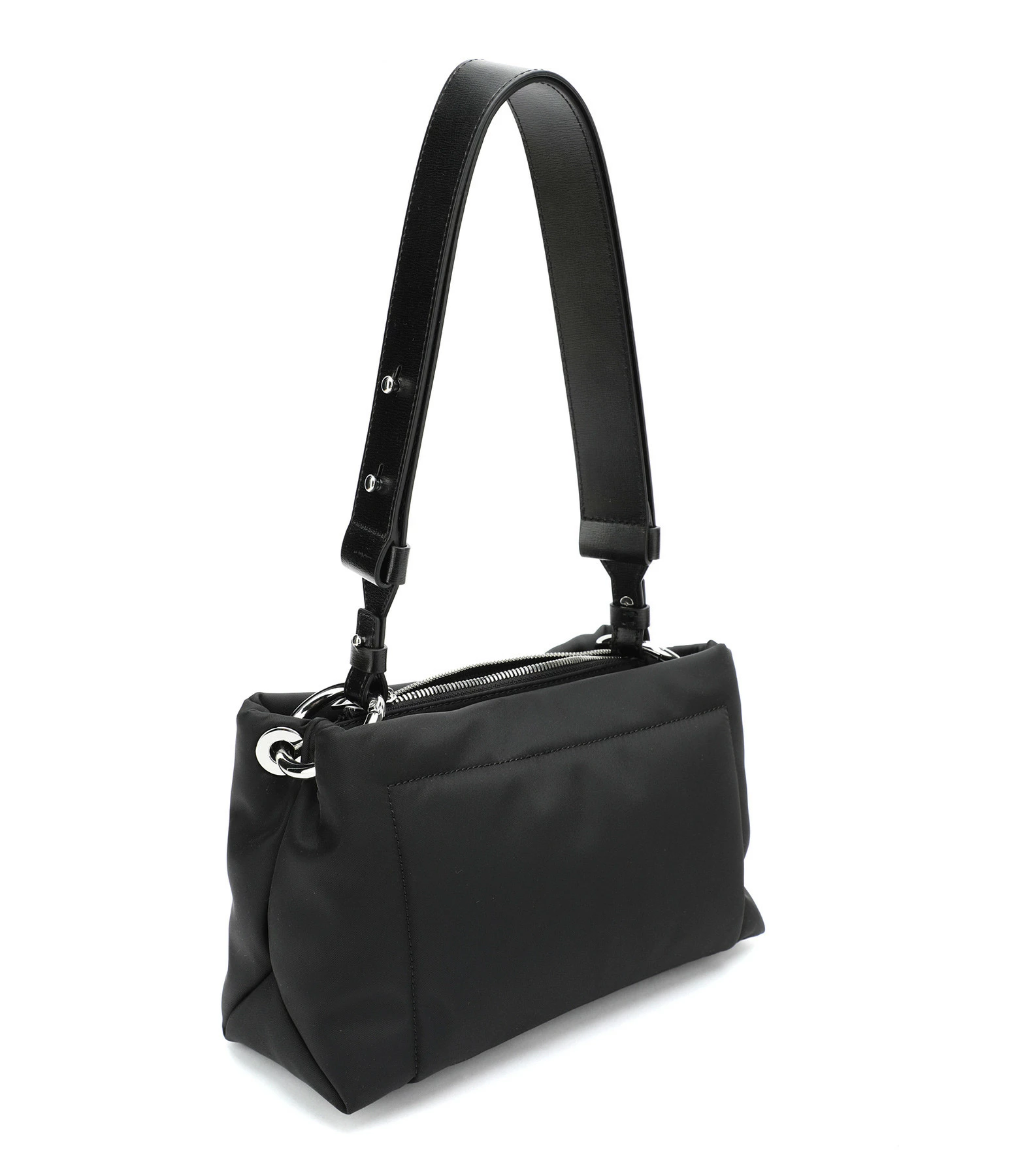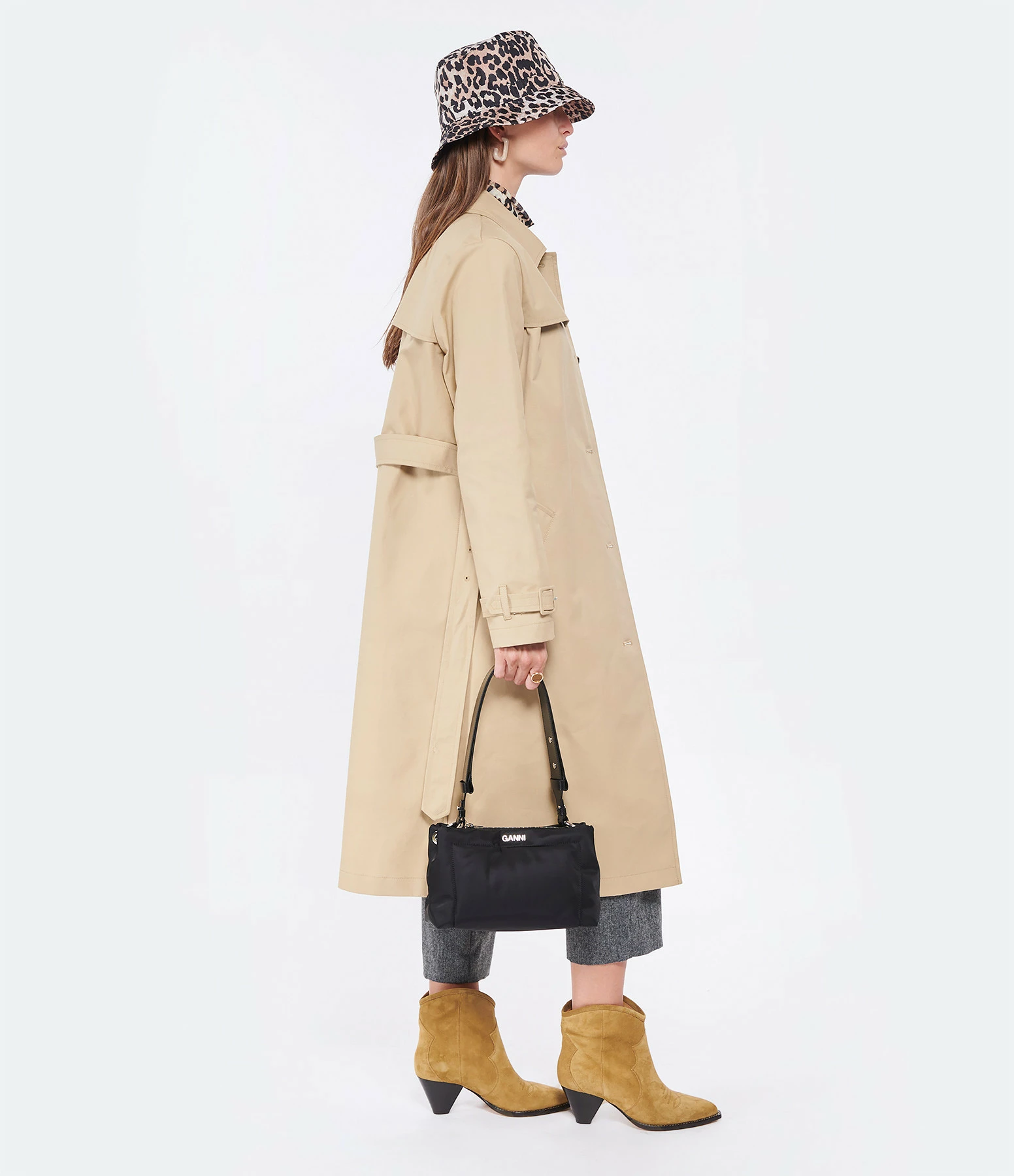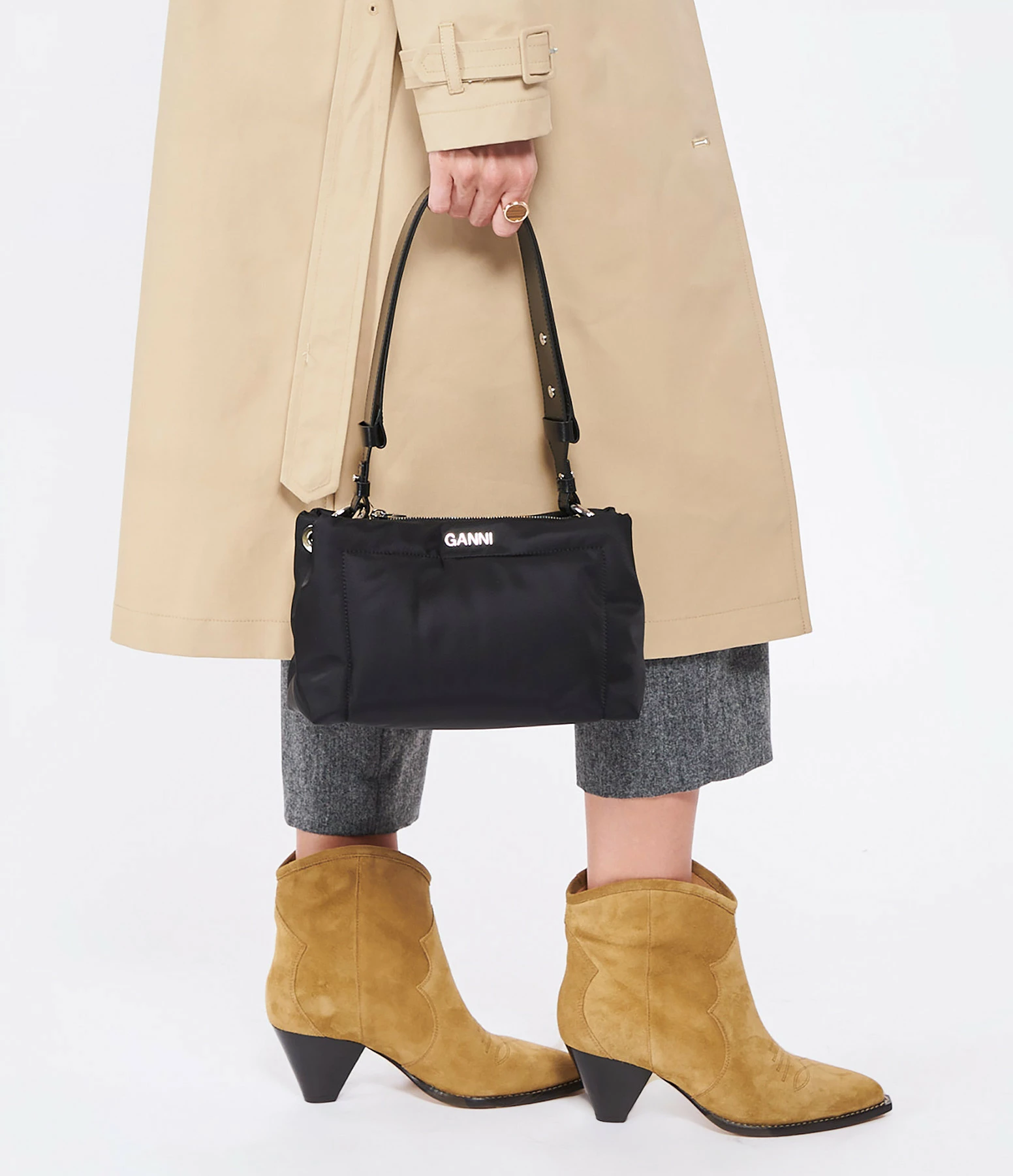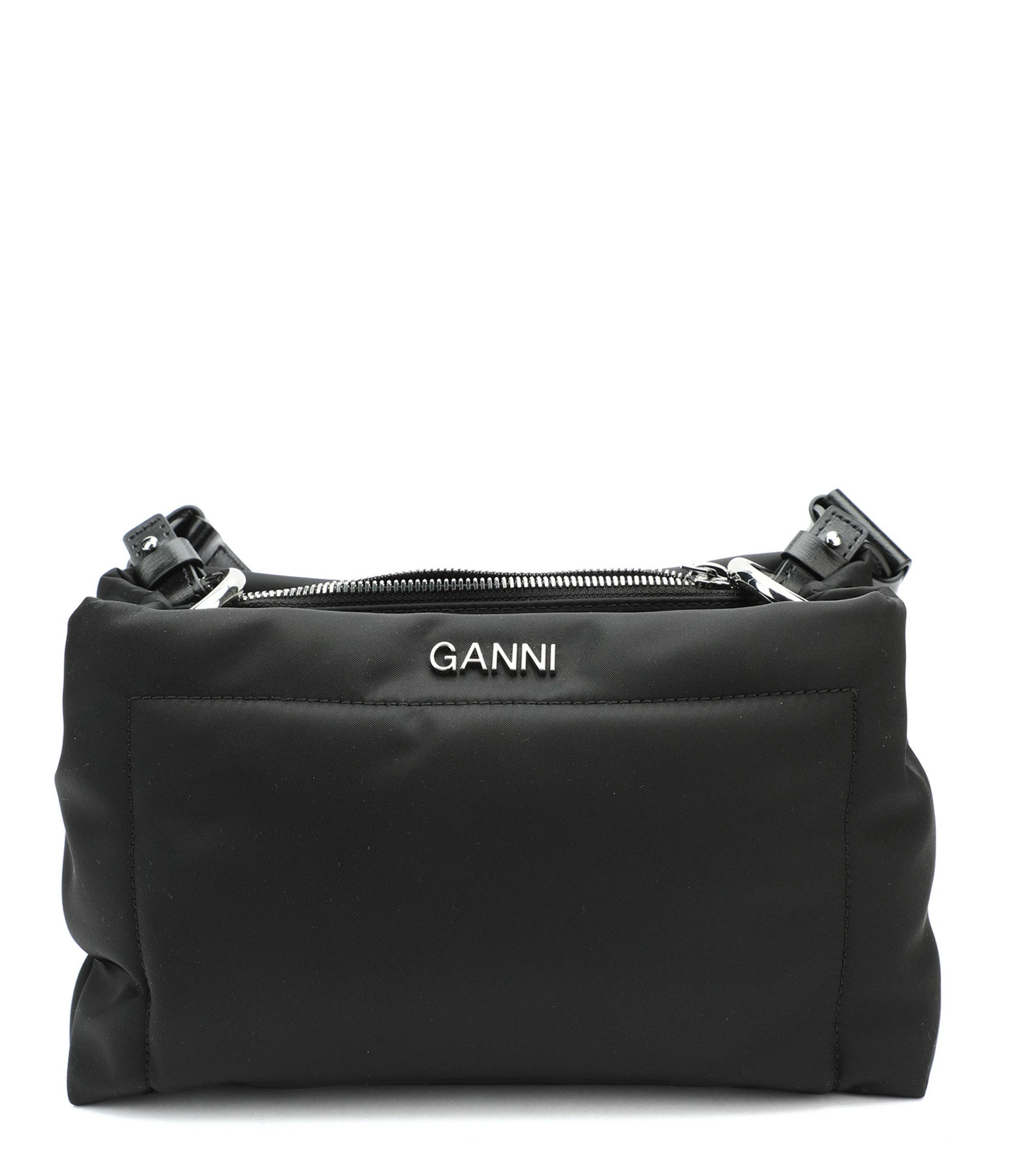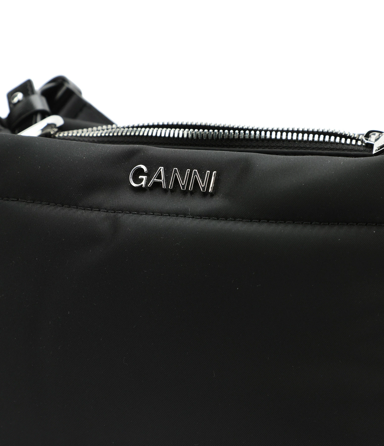 Sac baguette noir. Deux poches rembourrées aimantées et une petite poche centrale zippée. Doublure en coton. Une anse en cuir réglable. Logo “Ganni” à l’avant.