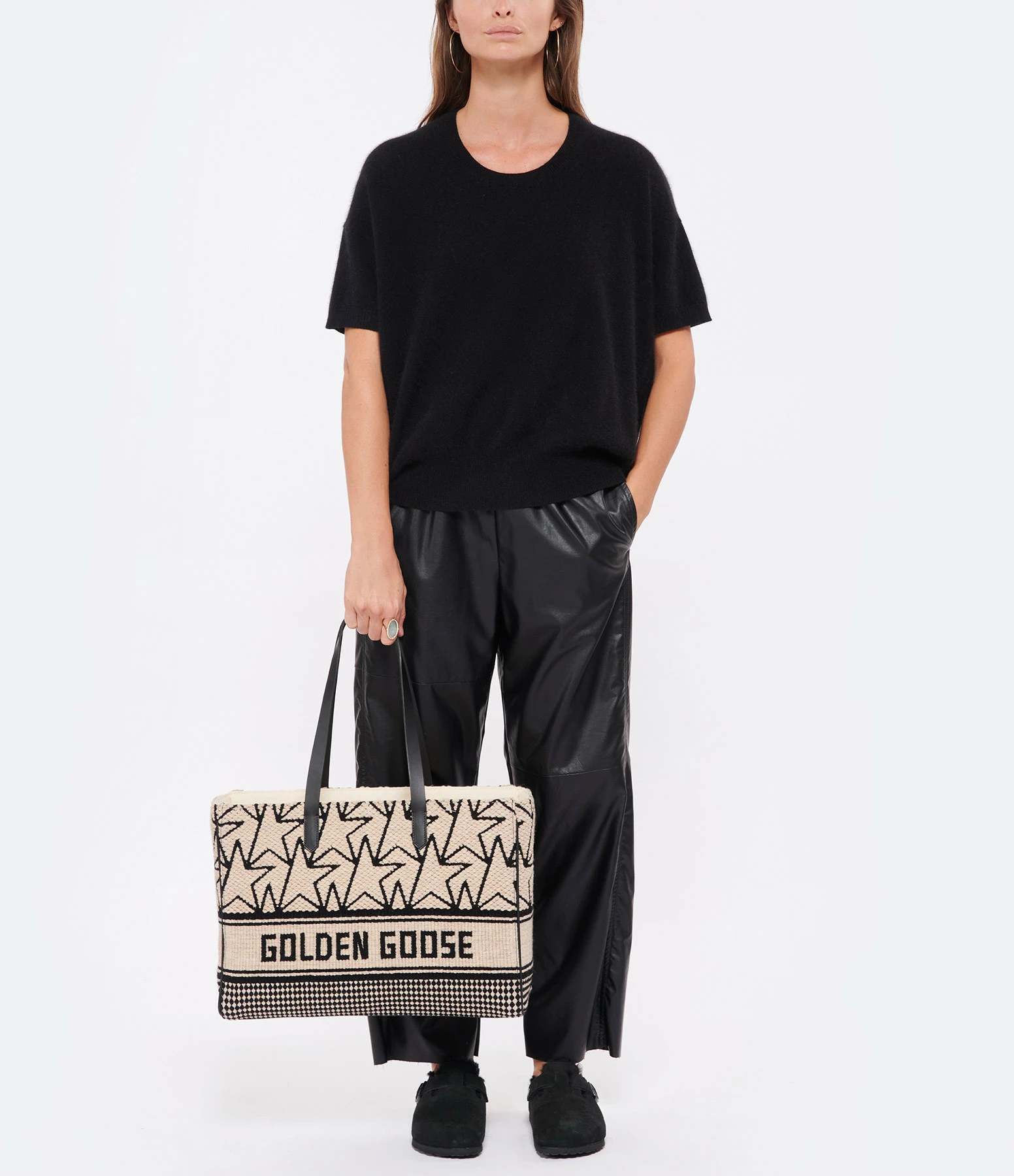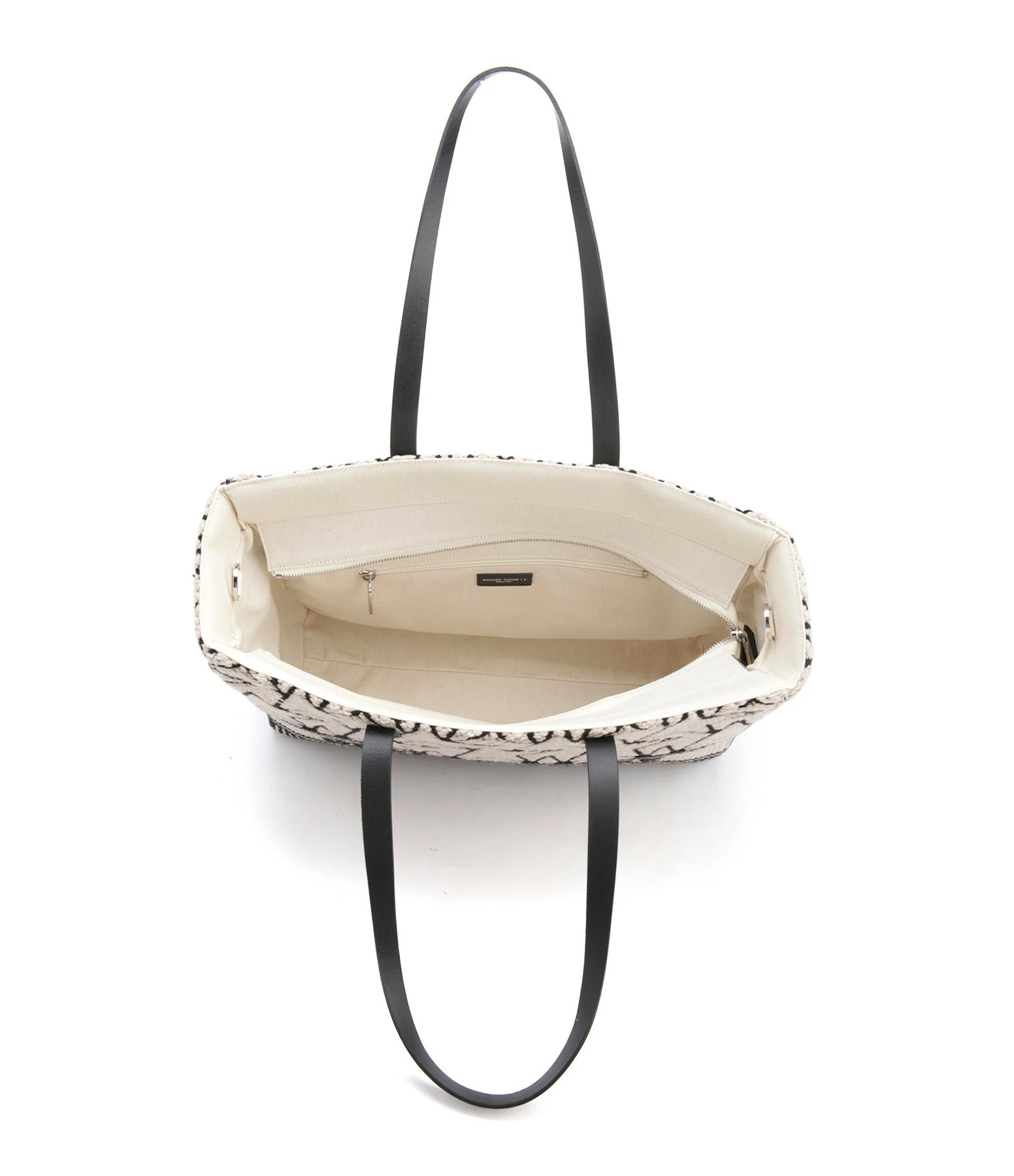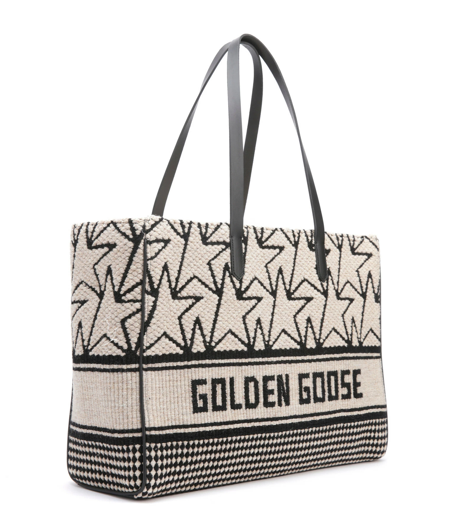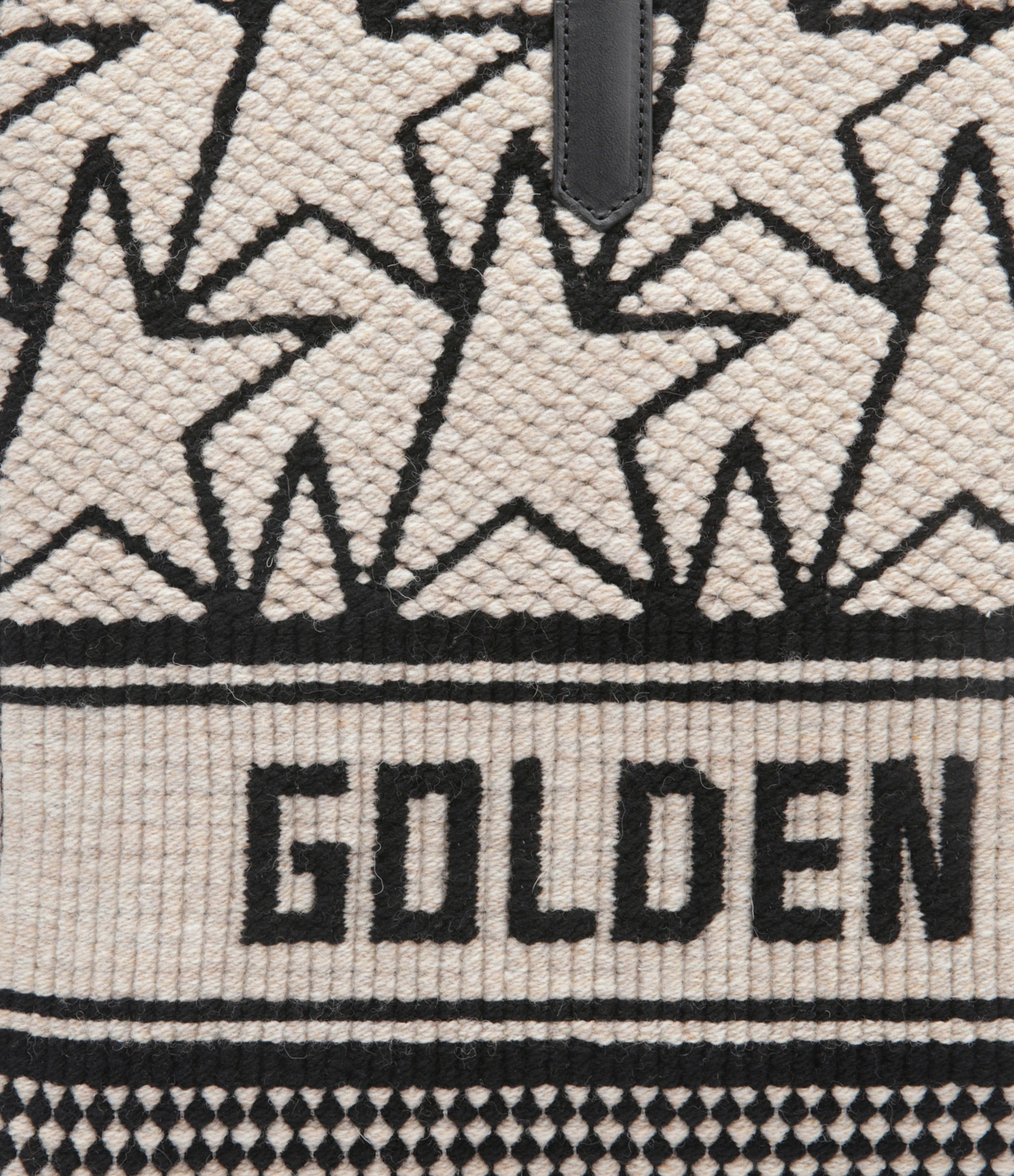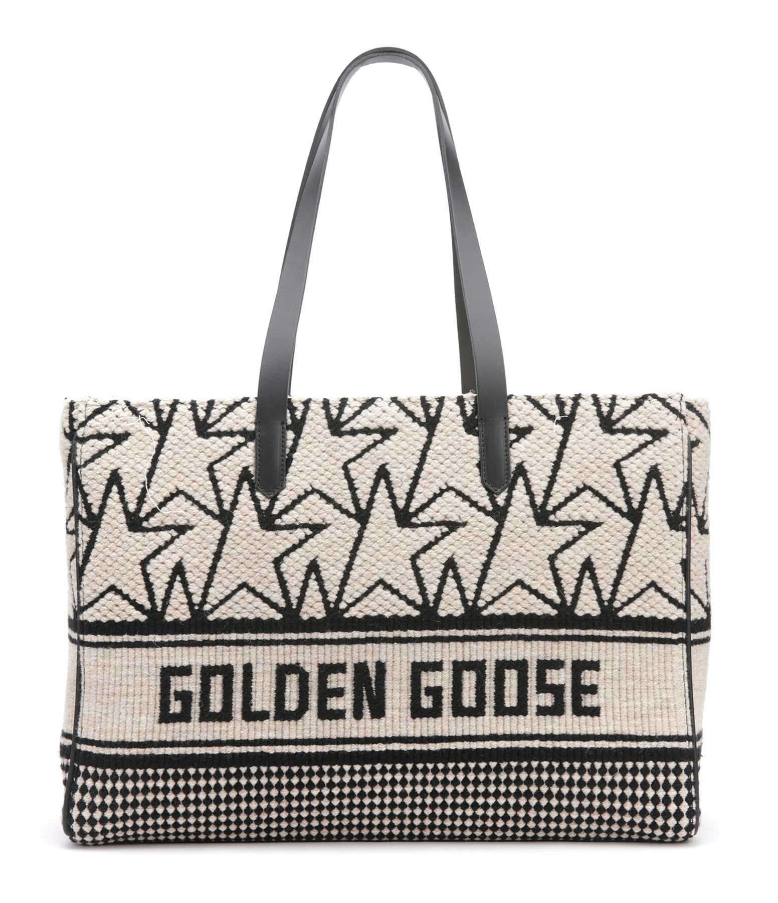 Sac cabas en laine jacquard blanc avec logos “étoile” et inscription “Golden Goose” noirs. Liserés en cuir lisse noir. Anses en cuir lisse noir pour porté épaule ou main. Une bandoulière noire amovible pour porté épaule ou croisé. Fermeture zippée. Intérieur doublé en coton composé d’un grand compartiment avec une poche zippée surmontée d’une étiquette en cuir noir avec un marquage estampillé “GOLDEN GOOSE Made in Italy”.