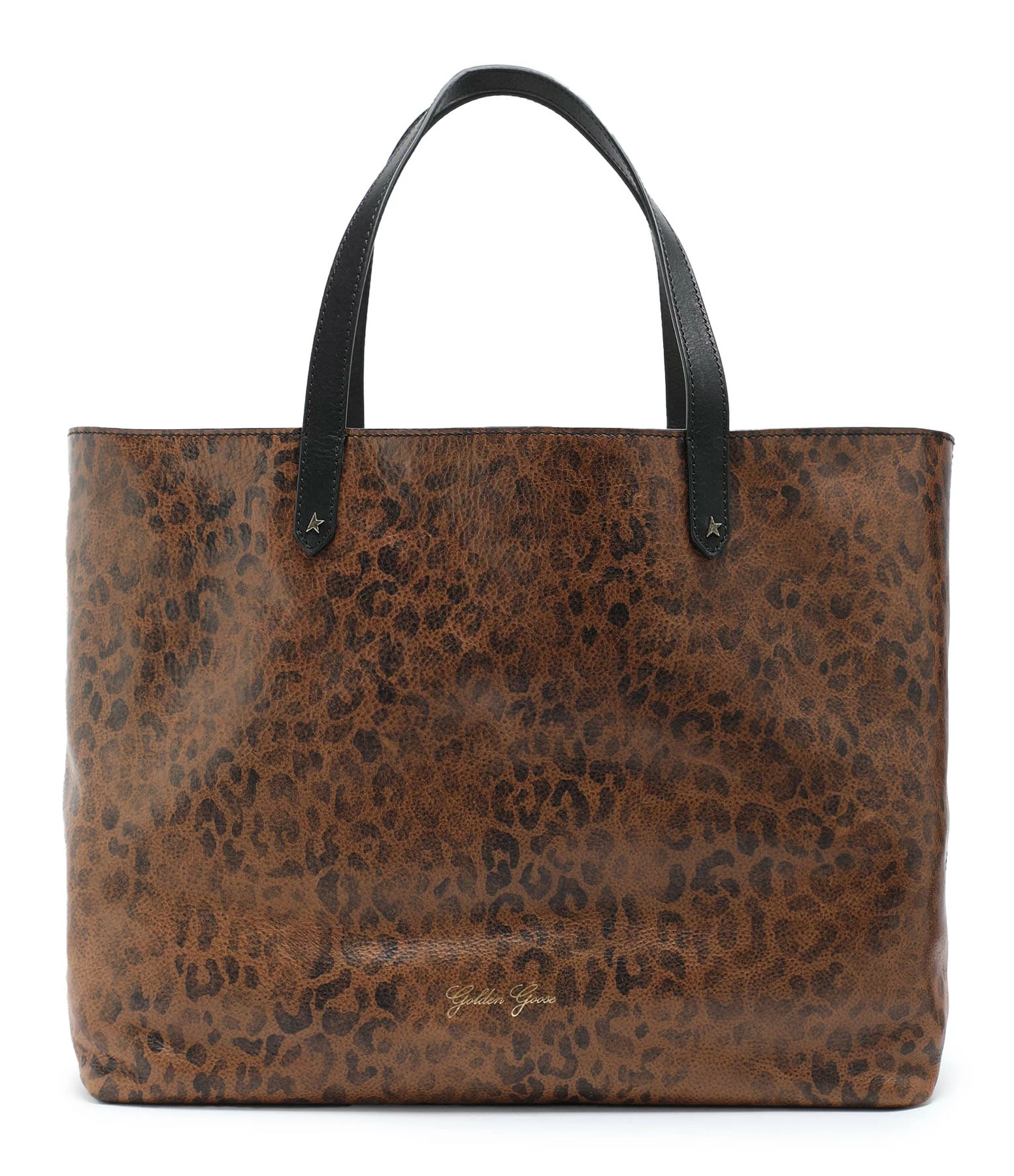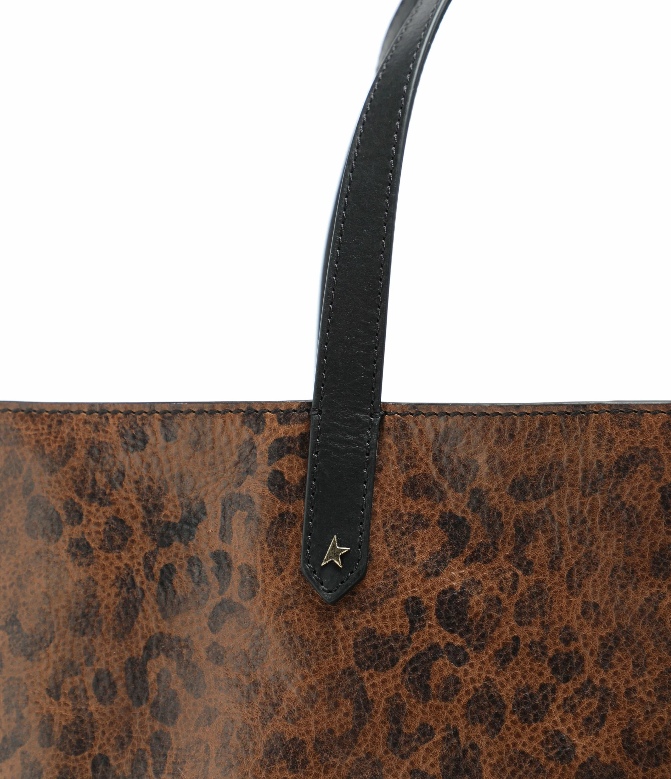Cabas en cuir lisse à imprimé léopard marron. Deux anses en cuir avec petites étoiles en métal doré. Inscription dorée “Golden Goose”. Fermeture aimantée. Une poche plaquée et zippée en tissu à l’intérieur.