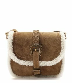 Sac bandoulière en cuir suédé marron et bordures en laine bouclette écrue. Porté épaule ou croisé, bandoulière réglable. Fermeture par rabat aimanté avec boucle décorative. Intérieur doublé en tissu avec une poche zippée. Intérieur doublé.