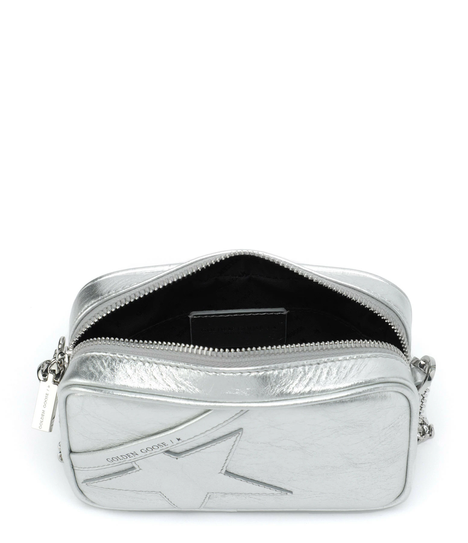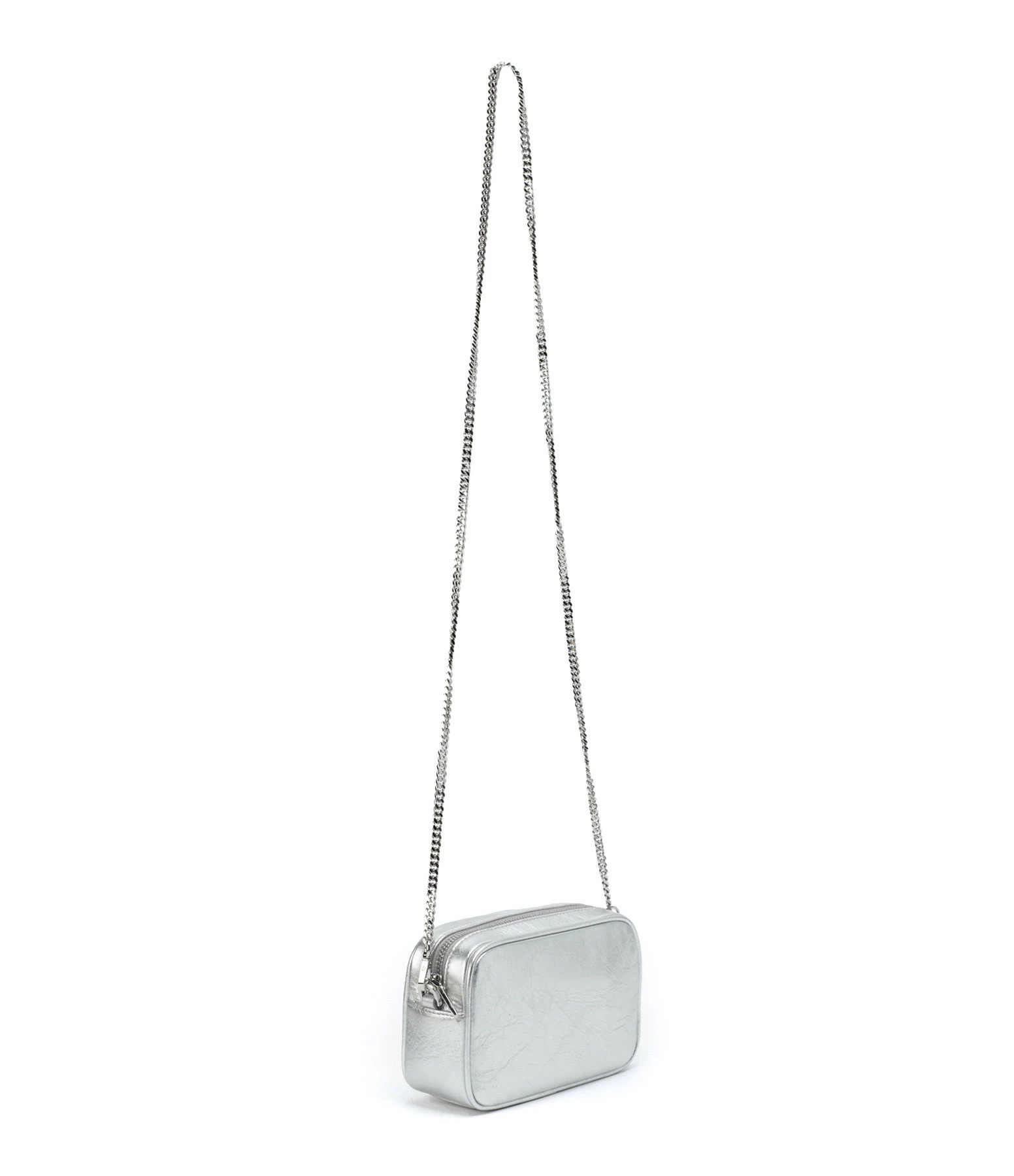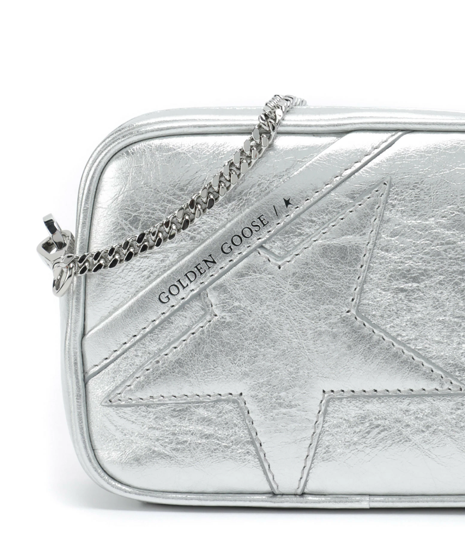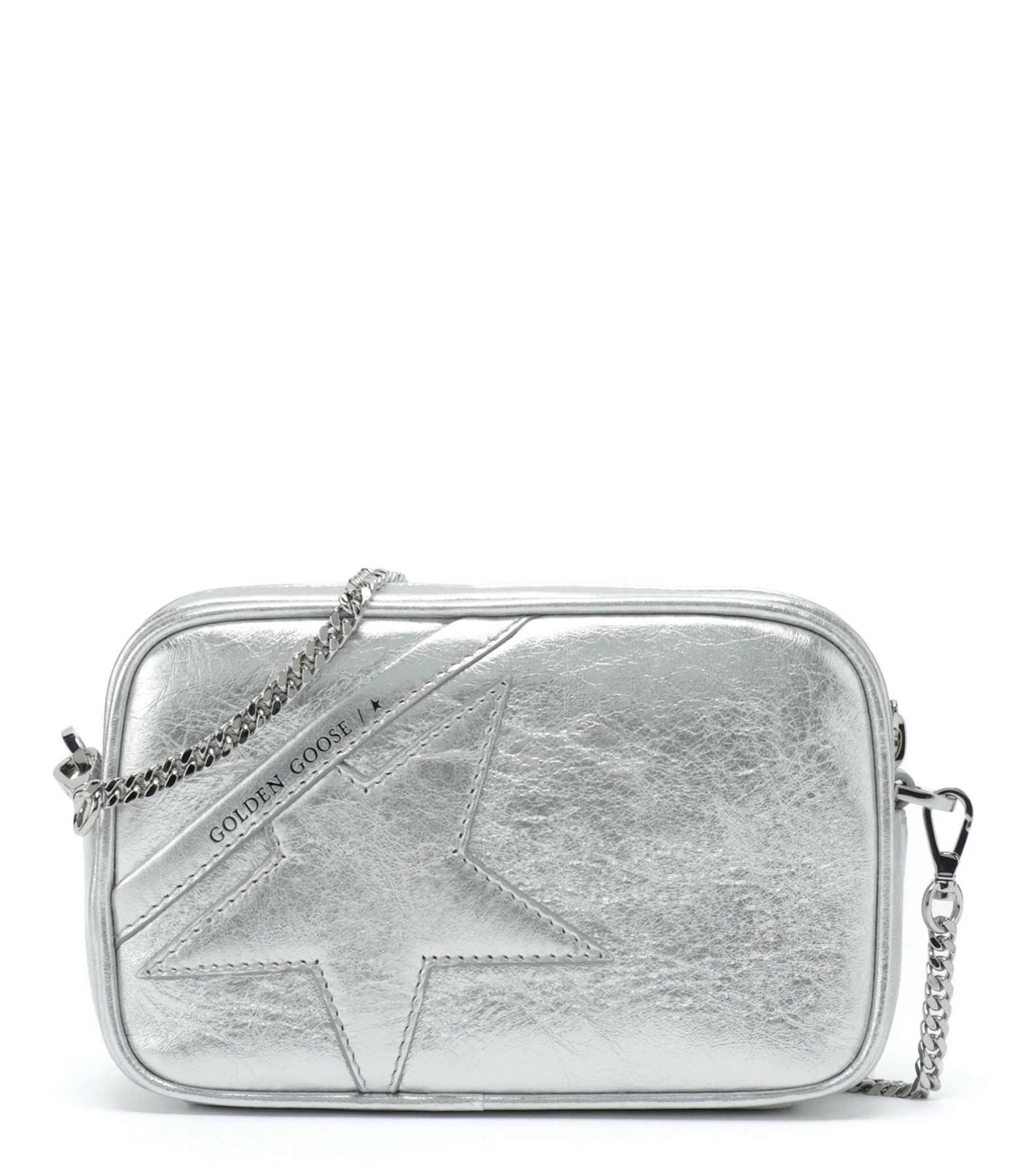 Petit sac bandoulière en cuir argenté avec étoile cousue sur l’avant. Bandoulière chaîne argentée amovible par mousquetons. Intérieur doublé en tissu avec une poche plaquée.
